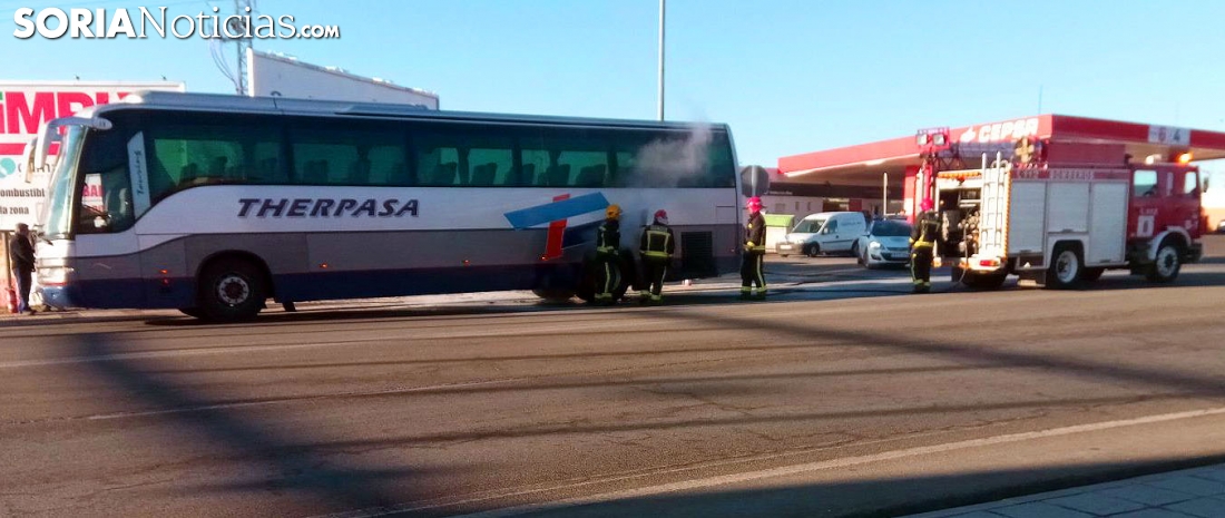 Los viajeros que se encontraban en el autobús, que cubre la línea entre Burgos y Soria, eran desalojados a la altura de la estación de servicio El Caballo Blanco, tras una fuerte estallido, producio cuando, al parecer, las ruedas del tren trasero rozaban inadecuadamente con la estructra del autocar.