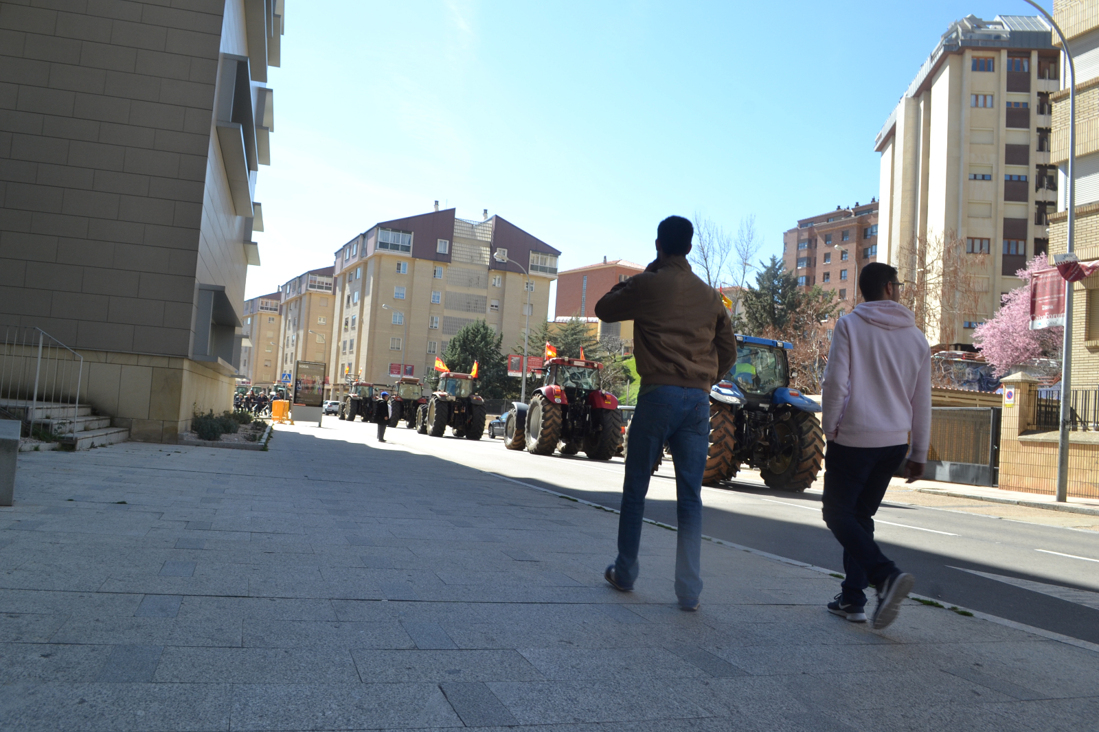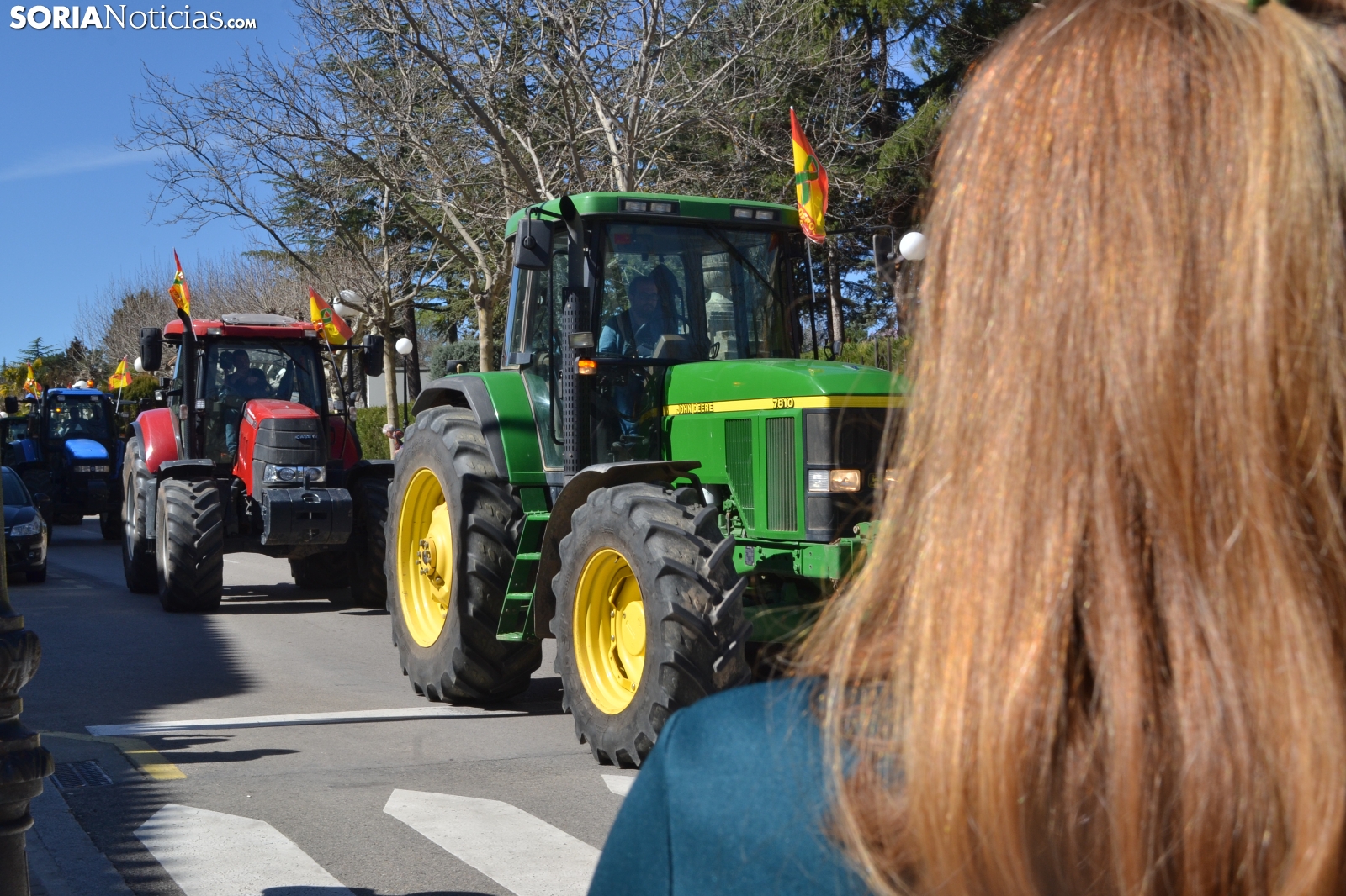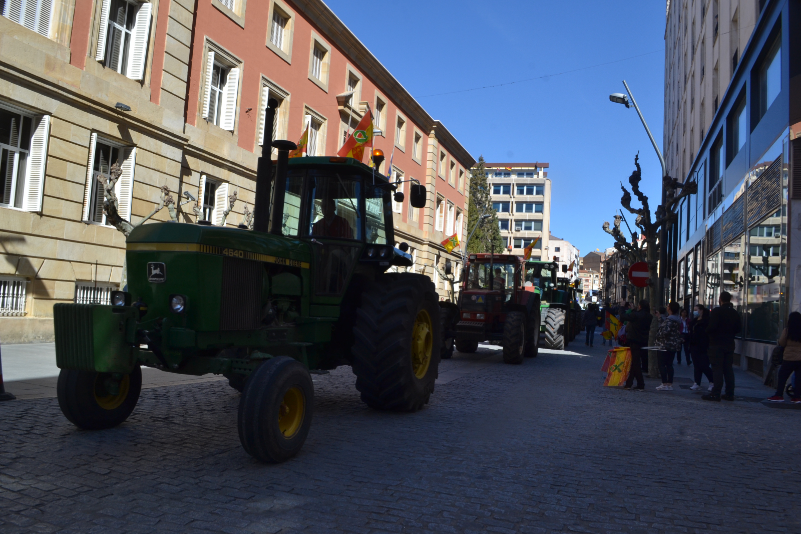 En perfecto orden, la comitiva ha llegado hasta las inmediaciones de la sedes de Subdelegación y Junta haciendo sonar sus bocinas y enarbolando banderas de España, en las que con un lazo verde, también se incluía la defensa del campo soriano.