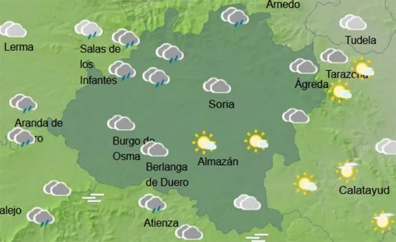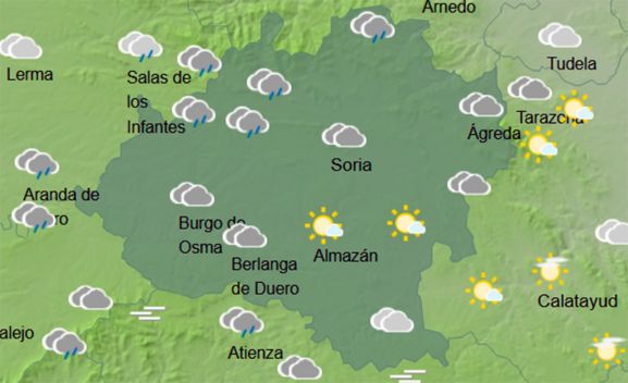 Para este miércoles, la Agencia Estatal de Meteorología espera un día nuboso o cubierto, con lluvias débiles en la segunda mitad del día, menos probables en el este y sur de la provincia de Soria.