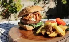Junto a ellos, almitas de torrezno, cebolla dulce, rúcula, salsa yogur, mostaza, y no nos olvidemos del panecillo, hacen de esta hamburguesa soriana la mejor de toda Castilla y León.