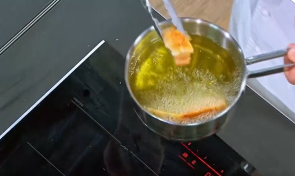 Continuaba el chef Michelín que una vez el aceite había cogido la temperatura adecuada se debía introducir en él, aunque avisaba “tened muchísimo cuidado porque el torrezno cuando lo metemos el aceite, la corteza coge aire y, se da la vuelta. Es importante sujetarla para que esté en la parte de abajo en contacto con el aceite sino no va a suflar”. Los jurados al ver lo que los concursantes estaban haciendo ponían cara de sorpresa y alguno, incluso, se llevaba las manos a la cabeza. Por su parte, los concursantes al no poder ver cómo le había quedado al chef, tenían sus dudas de cuándo estaban cocinados para sacarlo del aceite.