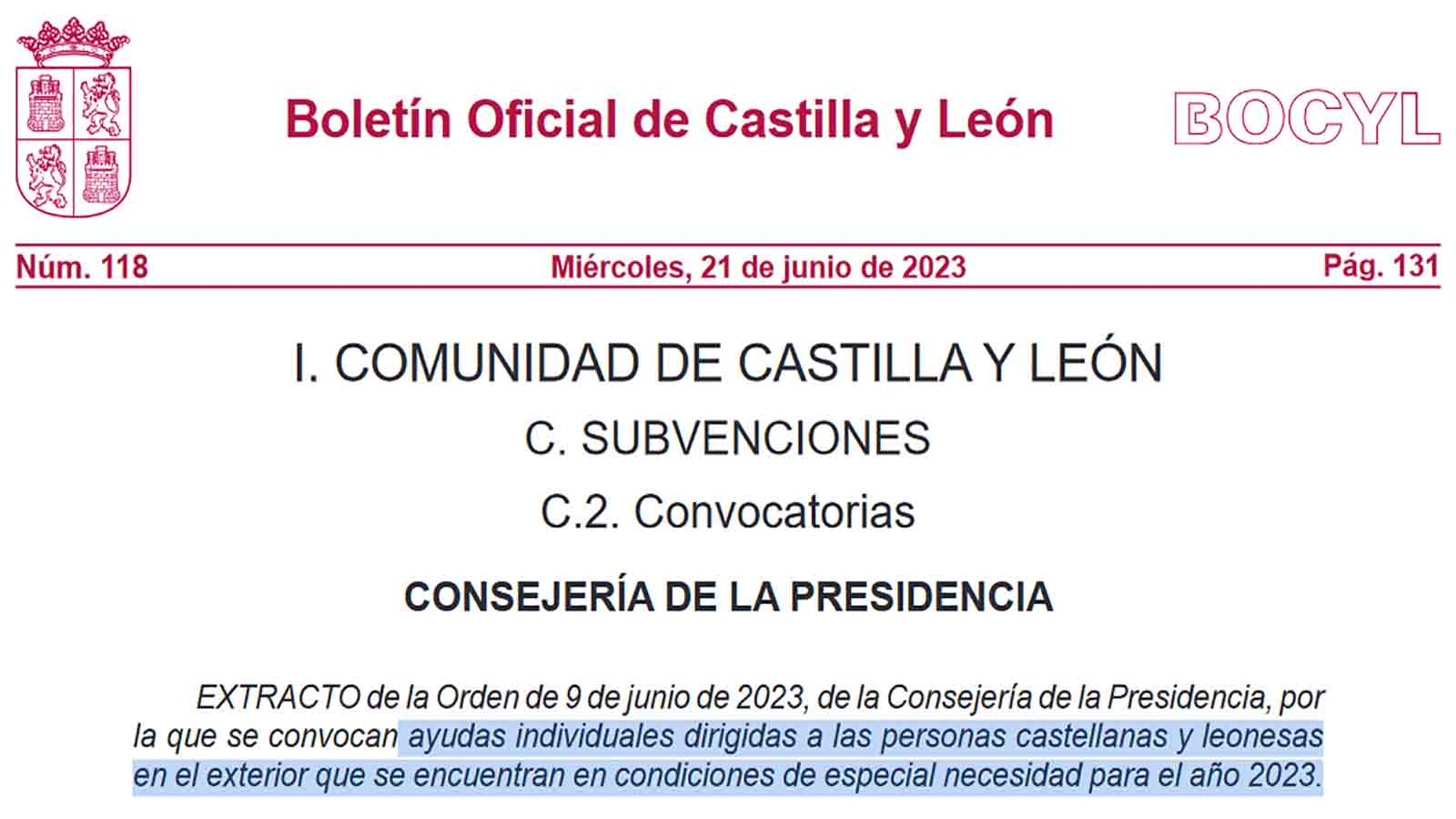 La Consejería de la Presidencia ha convocado, un año más, las ayudas individuales a los castellanos y leoneses en el exterior que se encuentran en situación de especial necesidad para el año 2023.