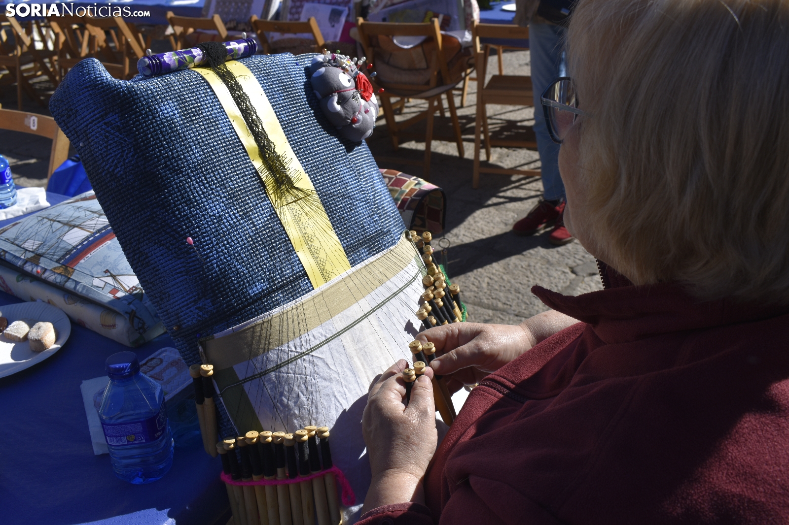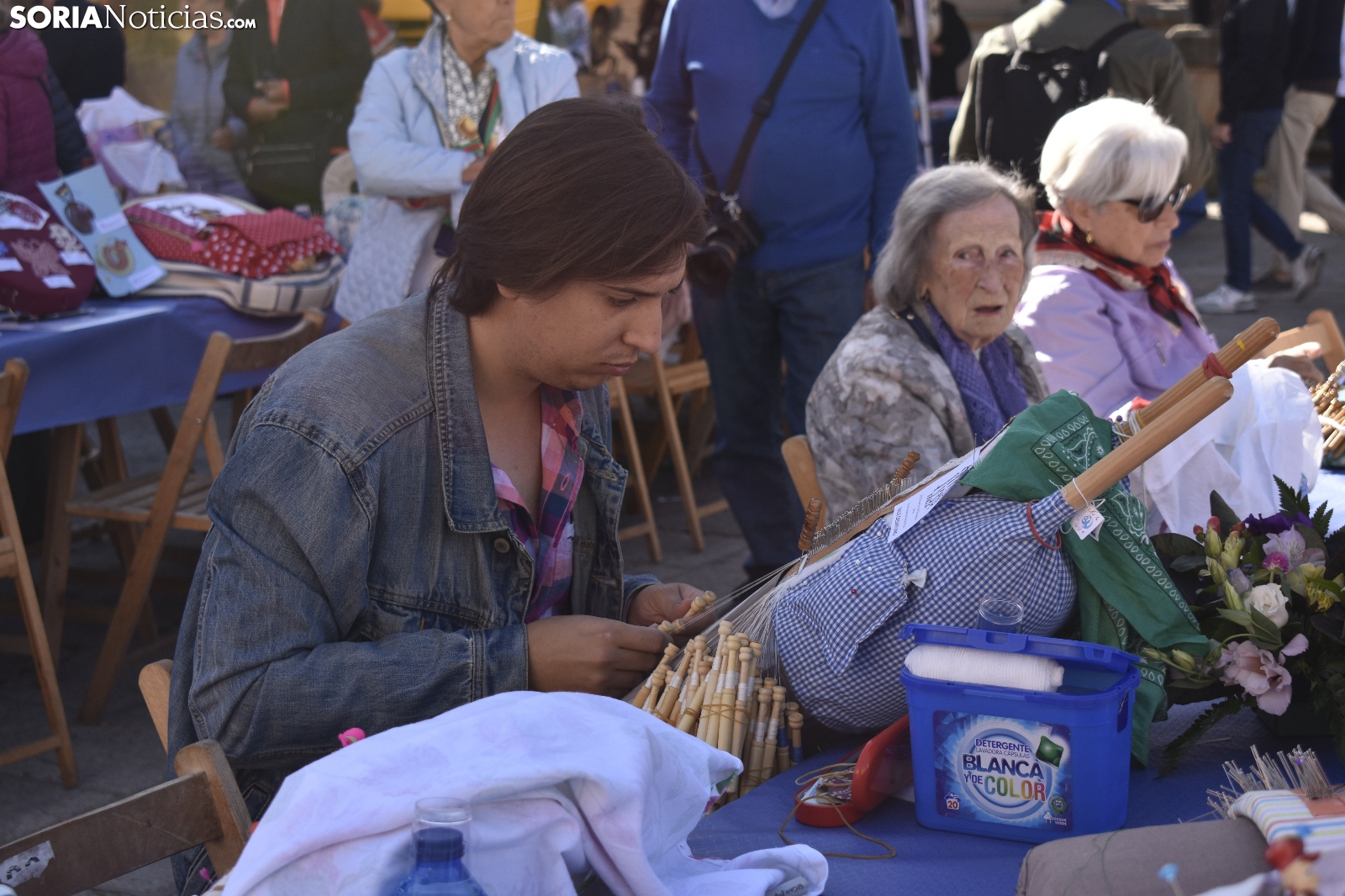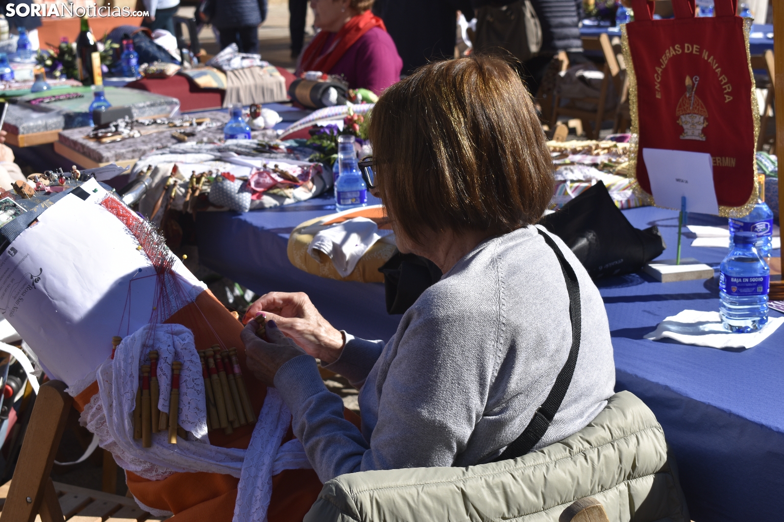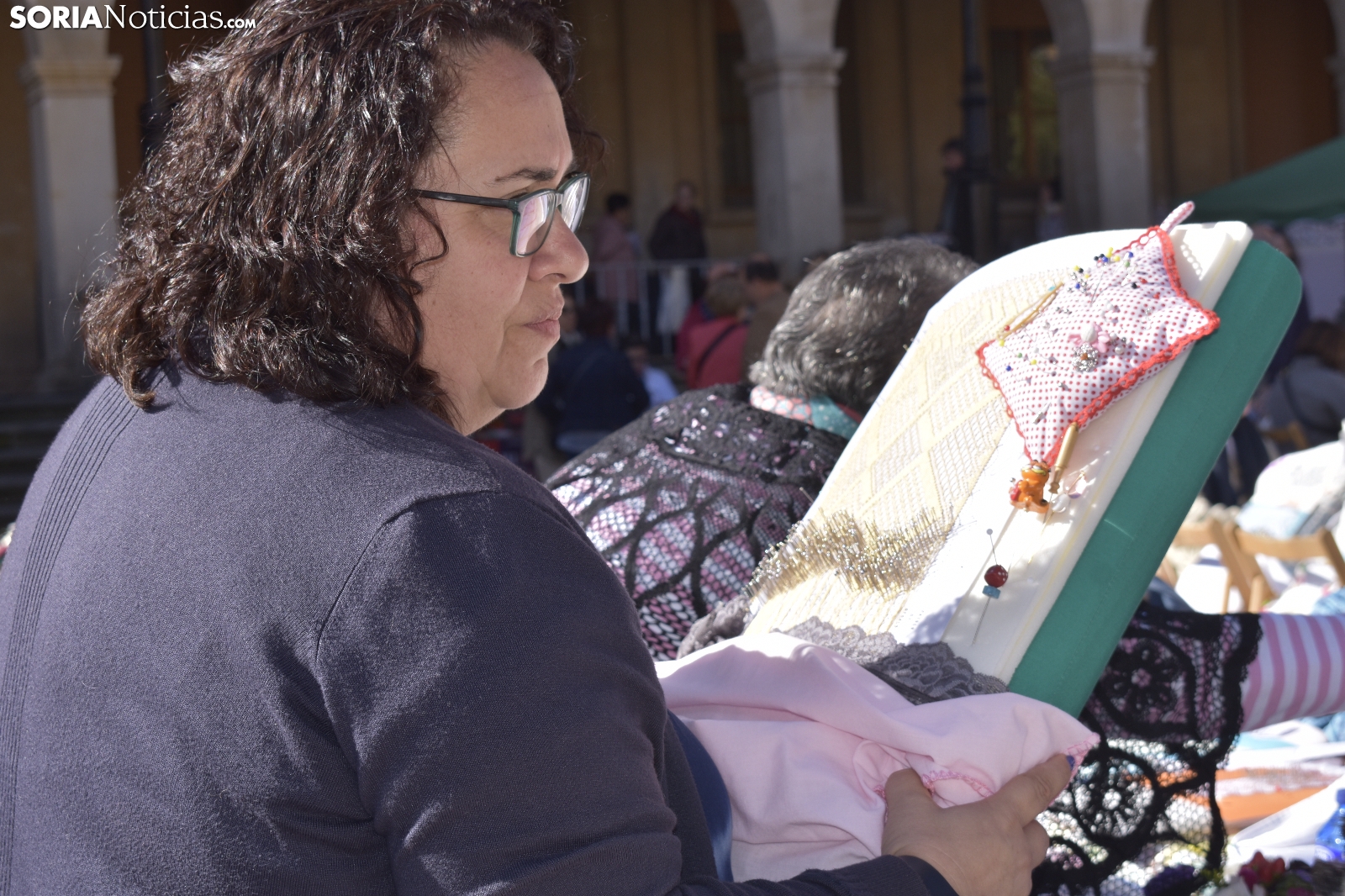 Los bolillos y la plaza Mayor de Soria encajan perfectamente. Se entienden. Gracias a las manos más que habilidosas de decenas de encajeras, se han trenzado a la perfección durante la jornada soleada de este domingo, 29 de septiembre. En el XVI Encuentro de Encajeras de Bolillos, organizado por la Asociación Cultural Encajeras Leonor de Soria, se constituyen auténticas “obras de arte”. No obstante, lo más importante del día es la convivencia porque, según nos cuentan algunas participantes, aquí se viene a "hablar y a compartir".