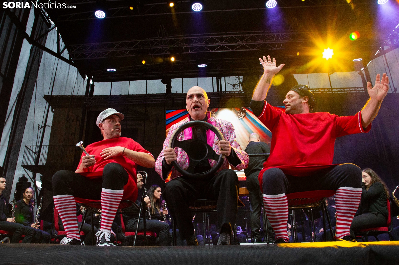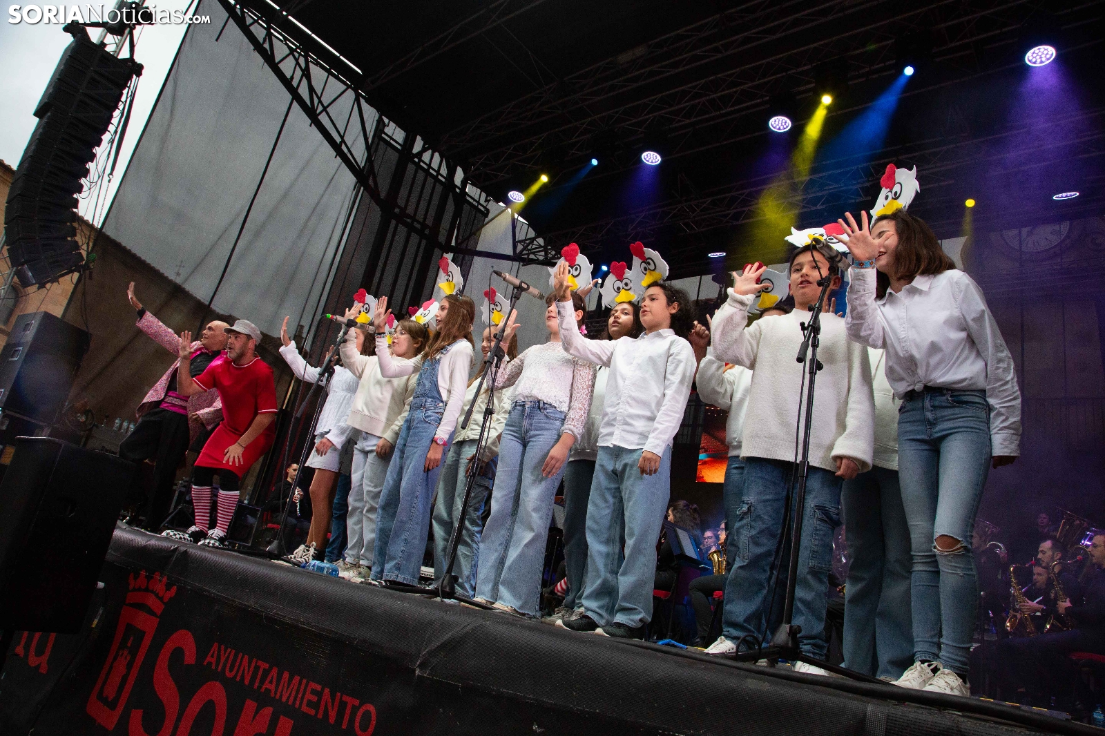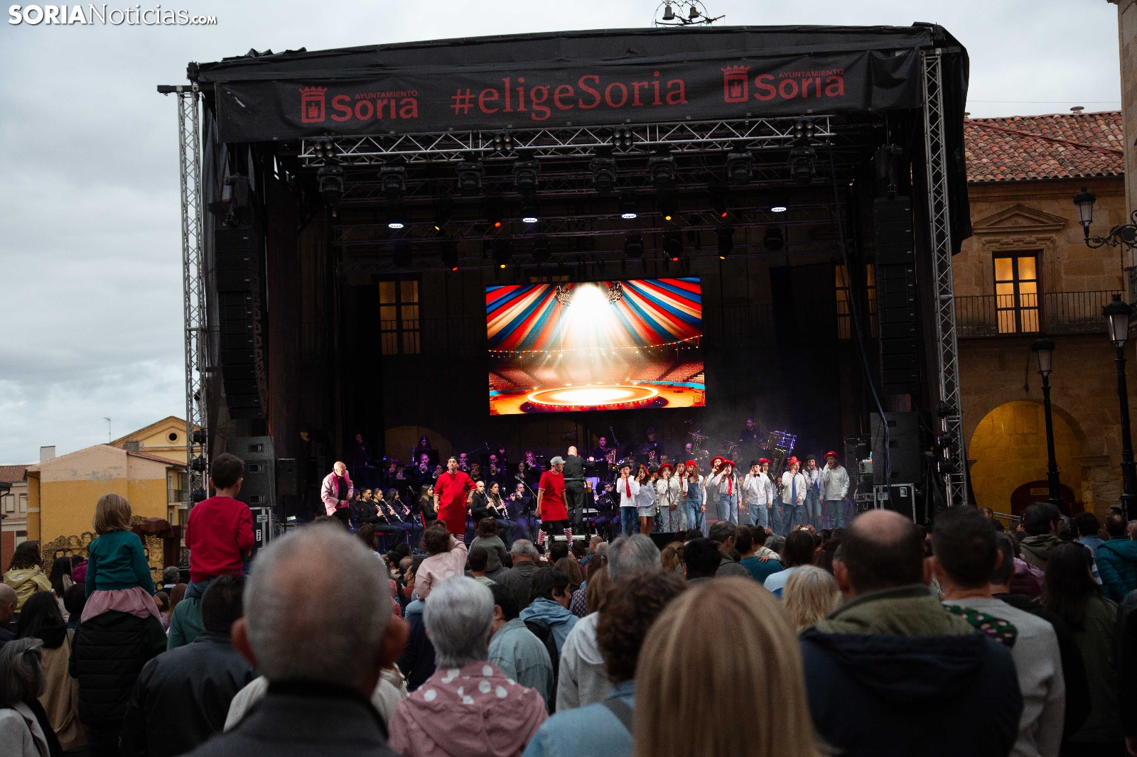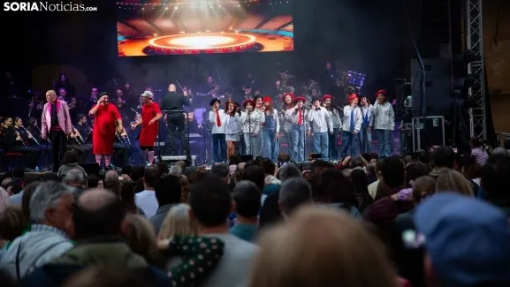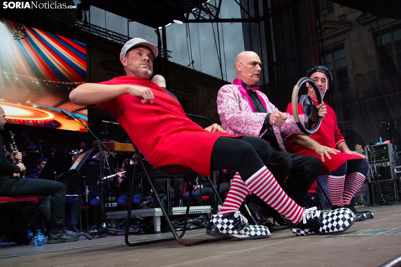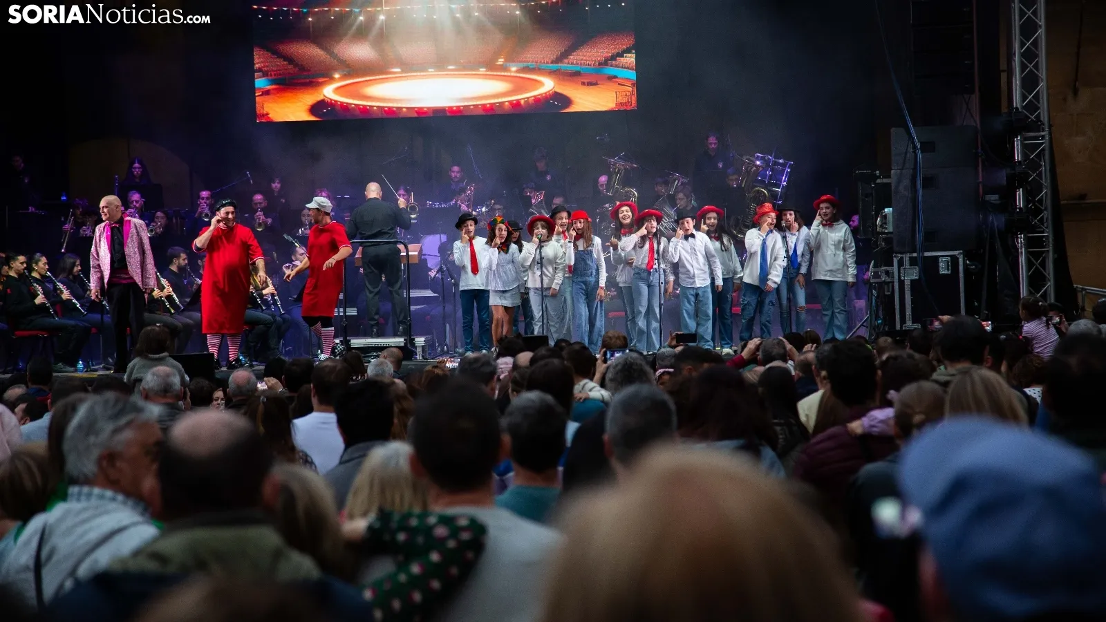 La Banda Municipal de Soria, junto con los cantantes, Ángel Bellido, Kiko Martínez y Enric Puig, y voces de sexto curso del CIP Fuente del Rey y su profesora, Ana Isla, ha interpretado el concierto familiar 'Vivan los payasos' en la Plaza Mayor de Soria. La agrupación soriana ha tocado varias canciones que han trasladado a los más mayores del lugar a su infancia con temas como 'Susanita tiene un ratón', 'La gallina turuleca' u 'Hola Don Pepito'. Los más jóvenes de la ciudad también han disfrutado de una actuación que ha sacado una sonrisa a más de uno.