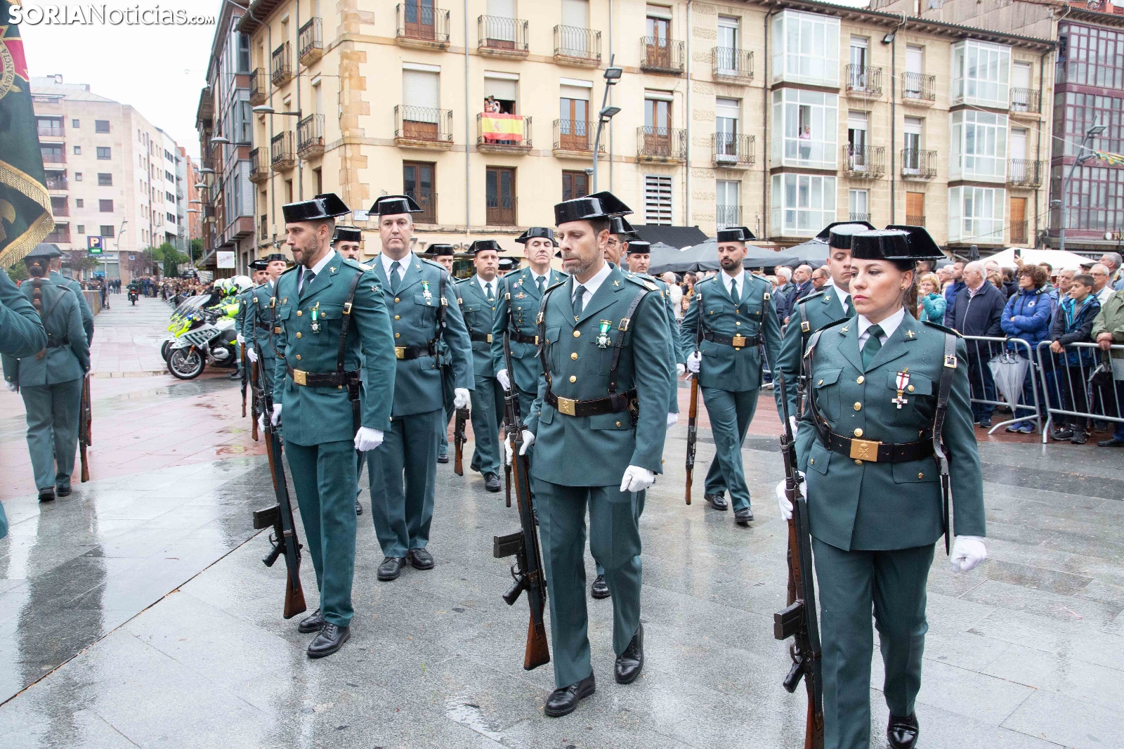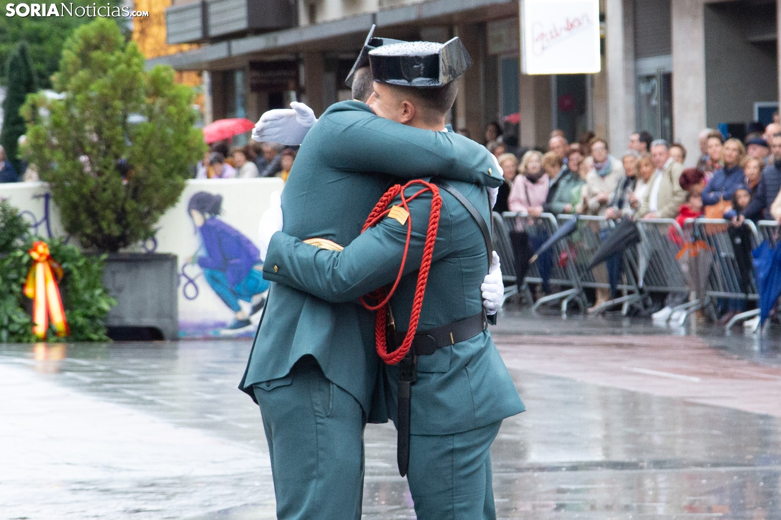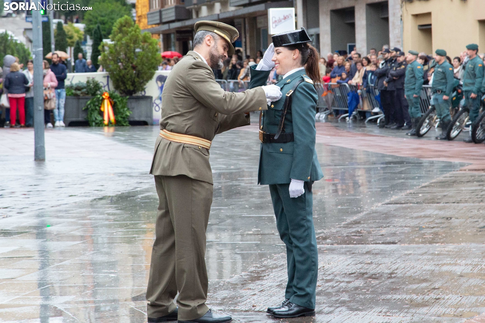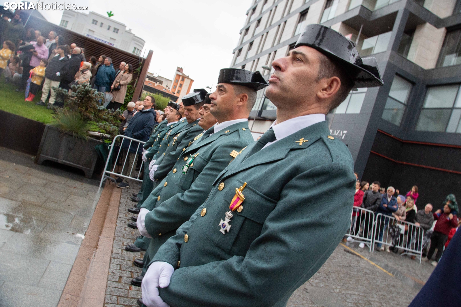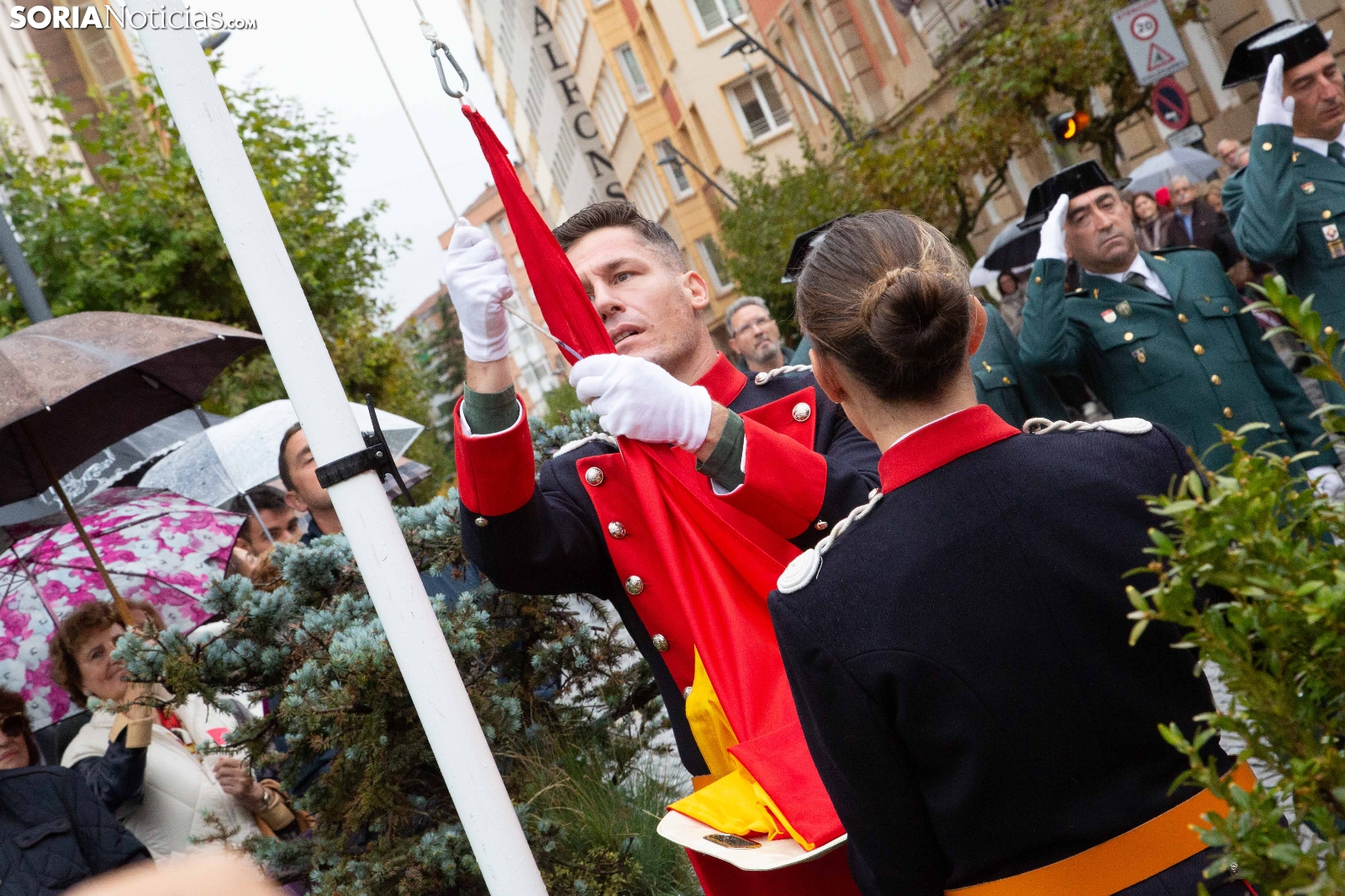 La Plaza Mariano Granados de la capital ha sido el epicentro de los actos de celebración del 12 de octubre en Soria. Representantes políticos de distintas instituciones se han reunido para honrar a la patrona de la Guardia Civil y homenajear a los que dieron su vida en un acto de servicio. El tiempo lo ha puesto difícil, pero los sorianos no han querido perderse el evento.