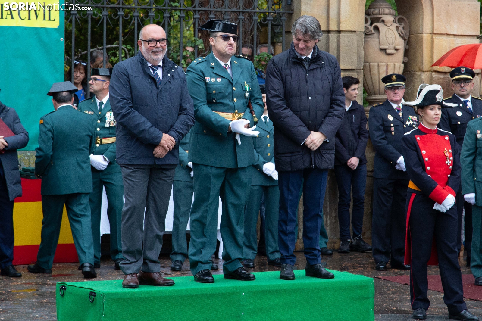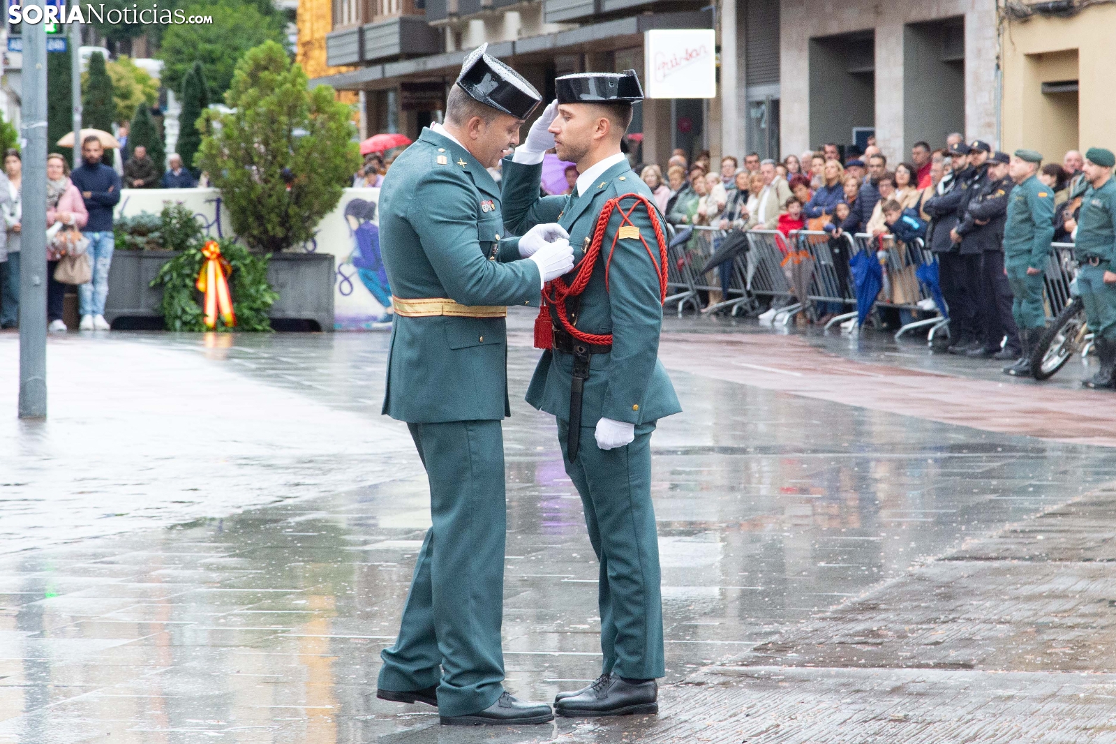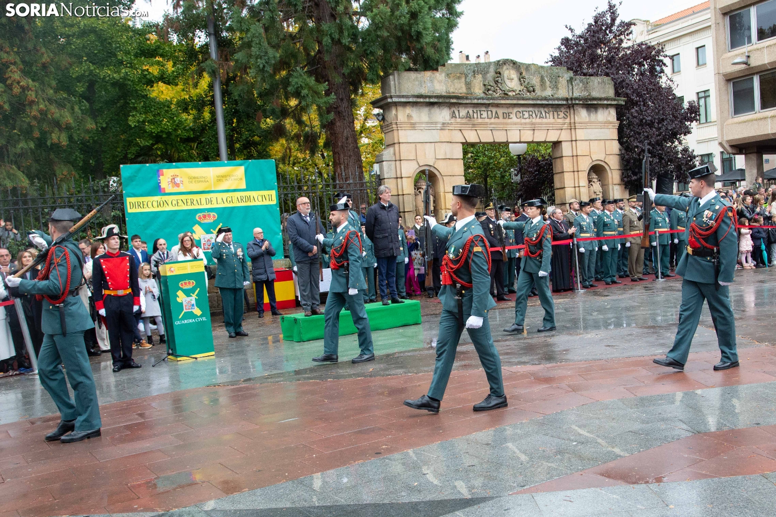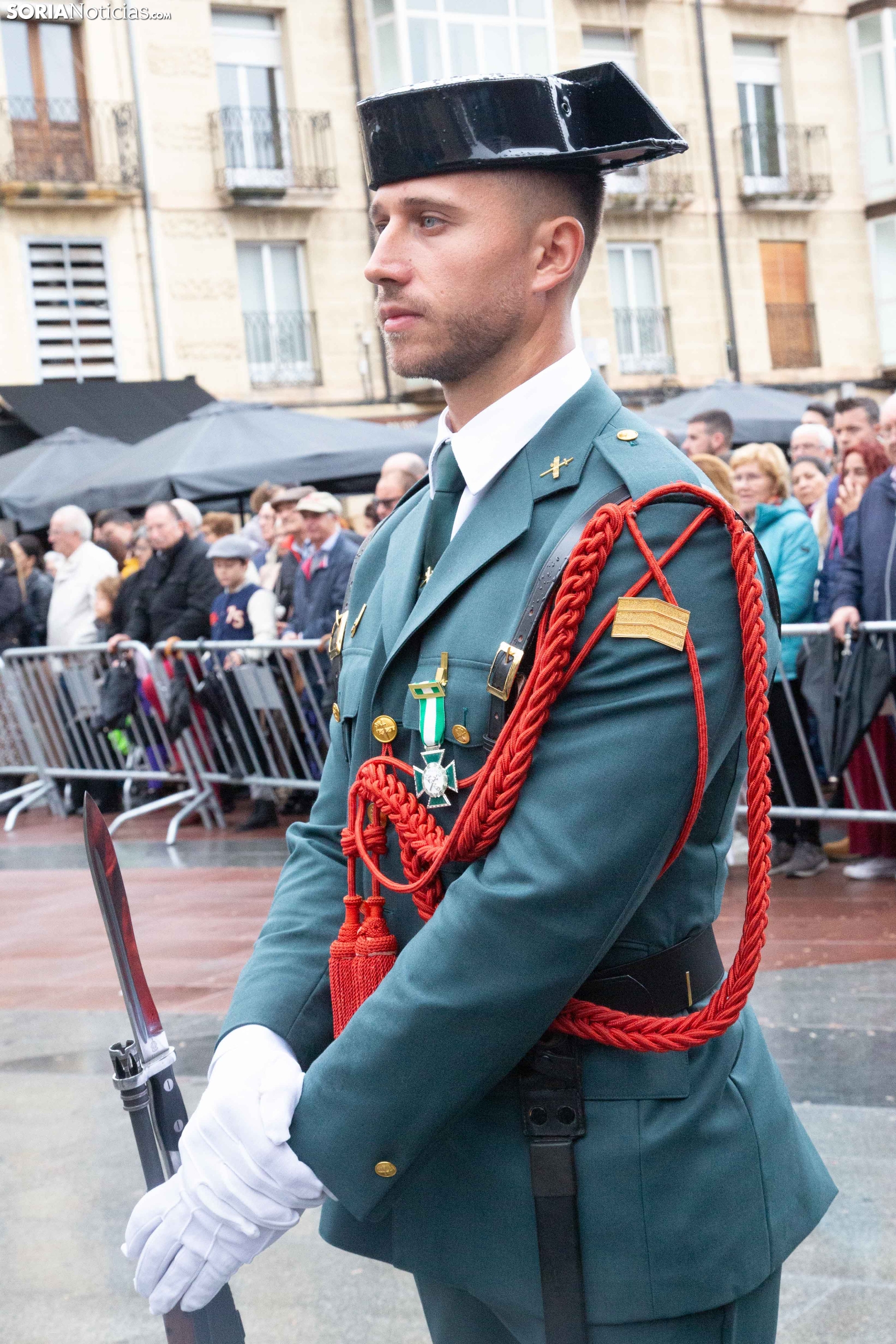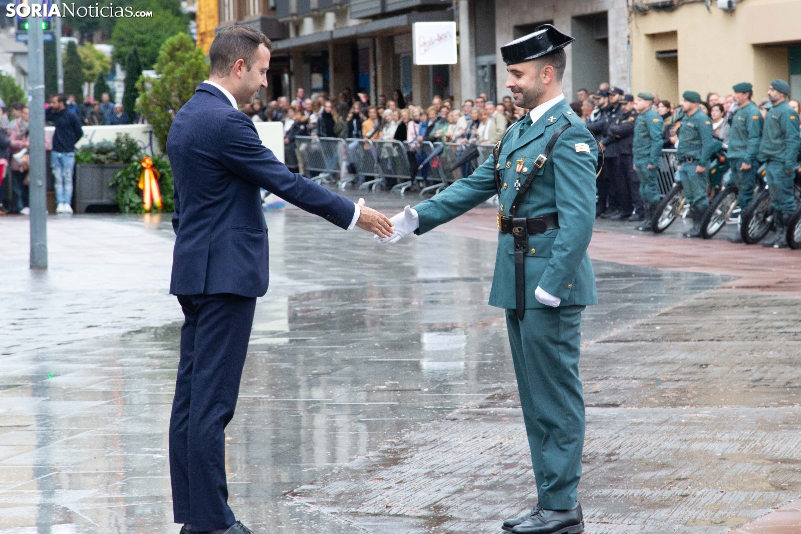 La Plaza Mariano Granados de la capital ha sido el epicentro de los actos de celebración del 12 de octubre en Soria. Representantes políticos de distintas instituciones se han reunido para honrar a la patrona de la Guardia Civil y homenajear a los que dieron su vida en un acto de servicio. El tiempo lo ha puesto difícil, pero los sorianos no han querido perderse el evento.