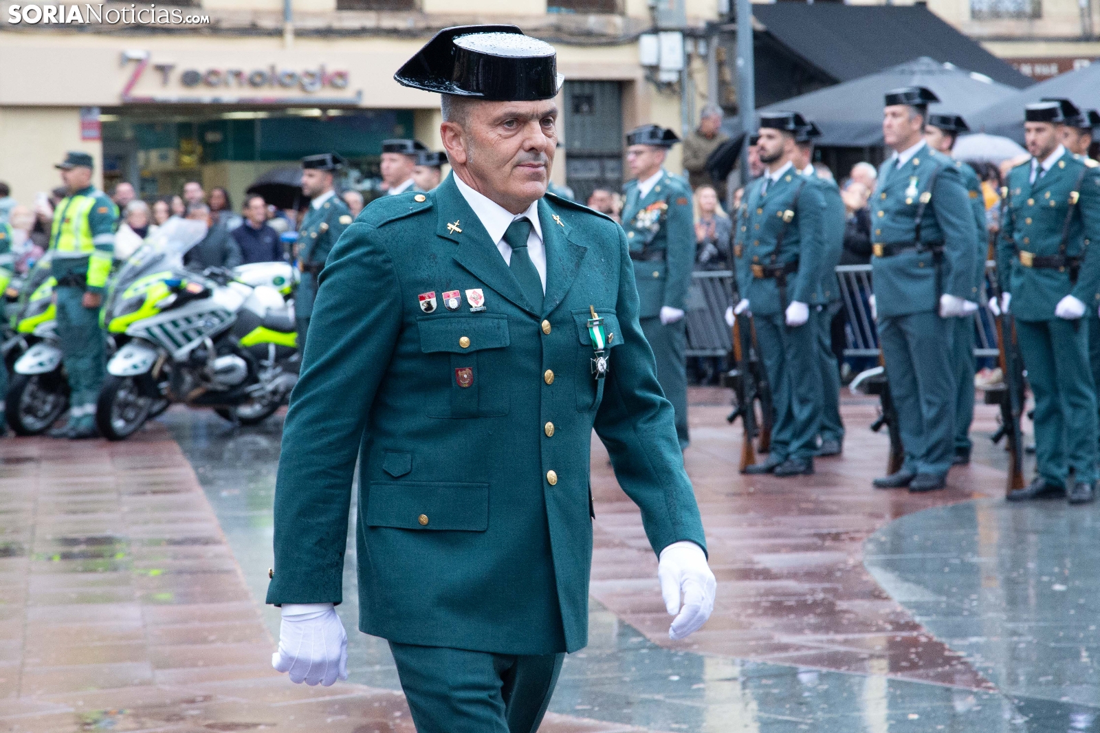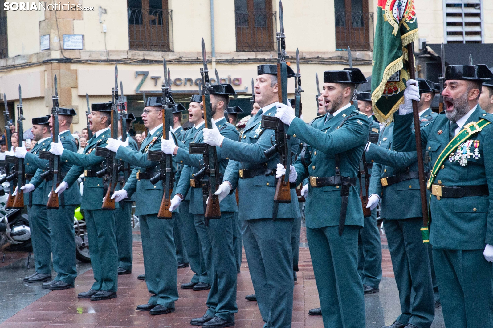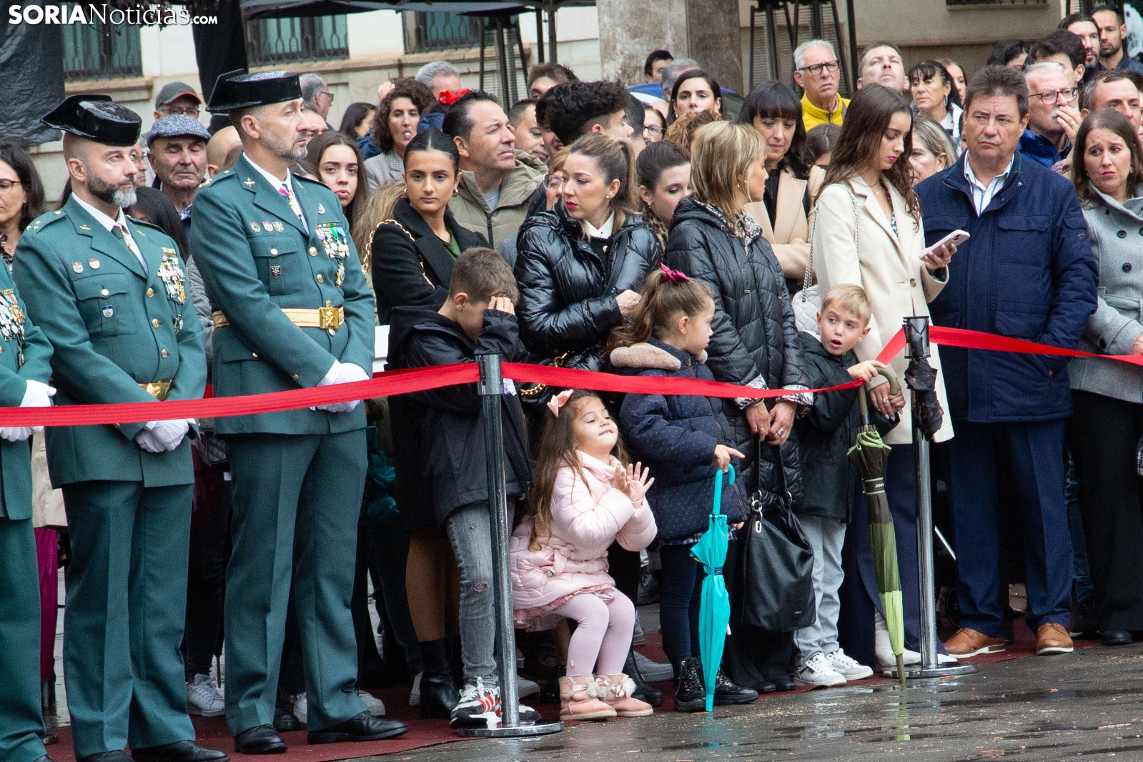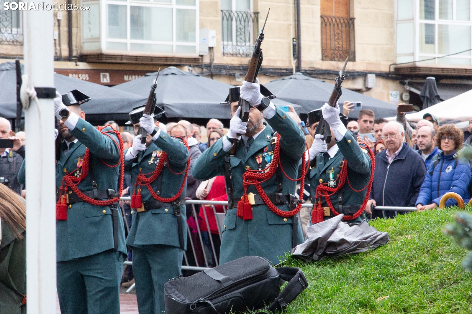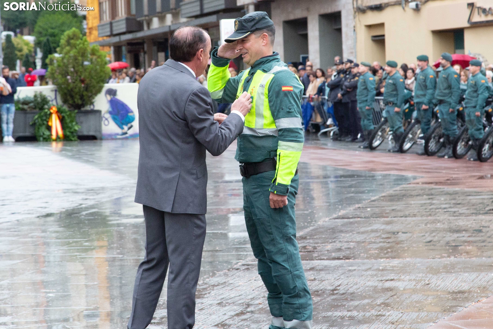 La Plaza Mariano Granados de la capital ha sido el epicentro de los actos de celebración del 12 de octubre en Soria. Representantes políticos de distintas instituciones se han reunido para honrar a la patrona de la Guardia Civil y homenajear a los que dieron su vida en un acto de servicio. El tiempo lo ha puesto difícil, pero los sorianos no han querido perderse el evento.