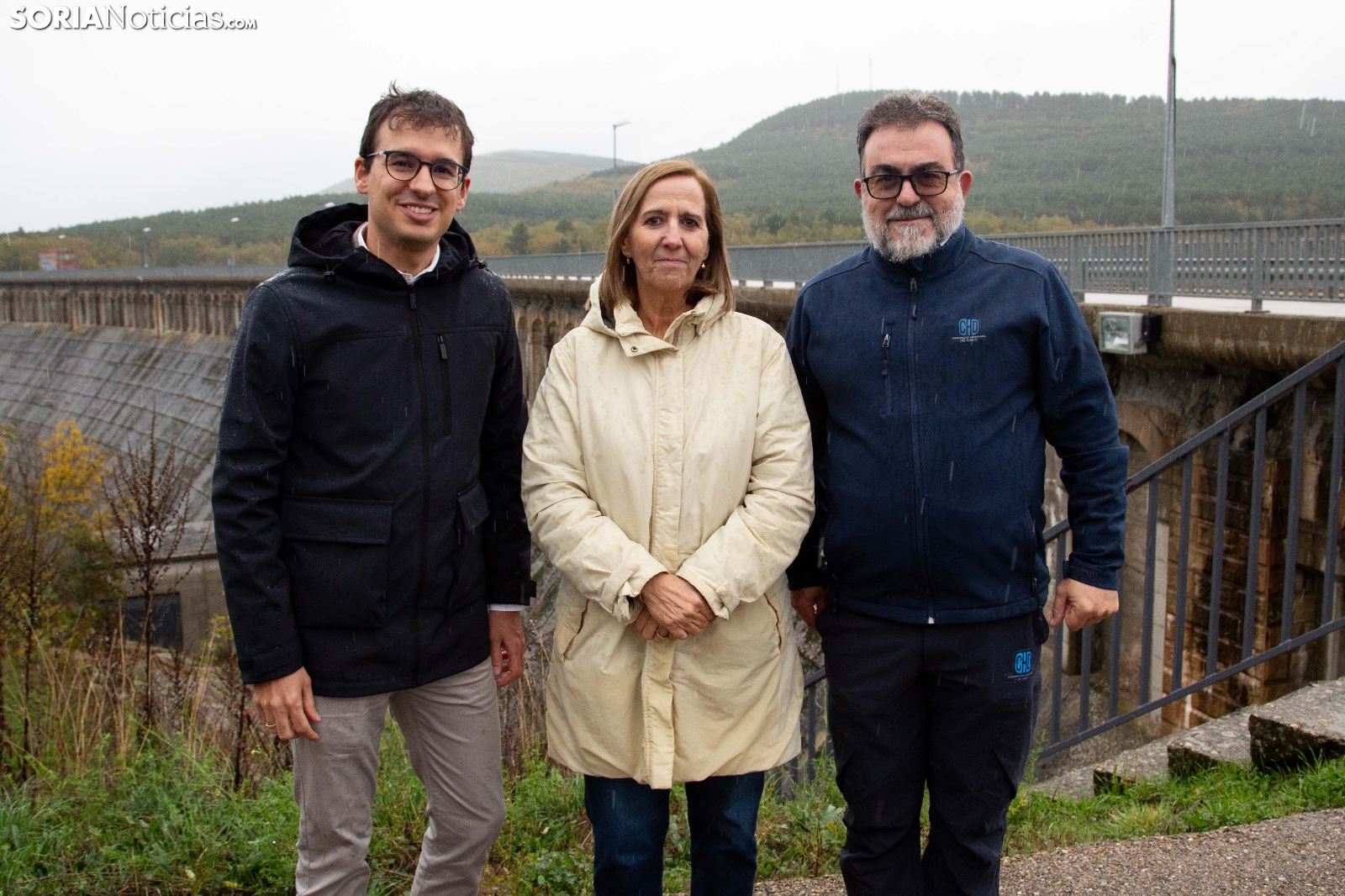 A la derecha, Félix Esteban Pomar, uno de los técnicos que trabaja en la presa. Junto a él, María Jesús Lafuente Molinero y Alejandro Barriuso Mediavilla. FOTOS: MARÍA FERRER