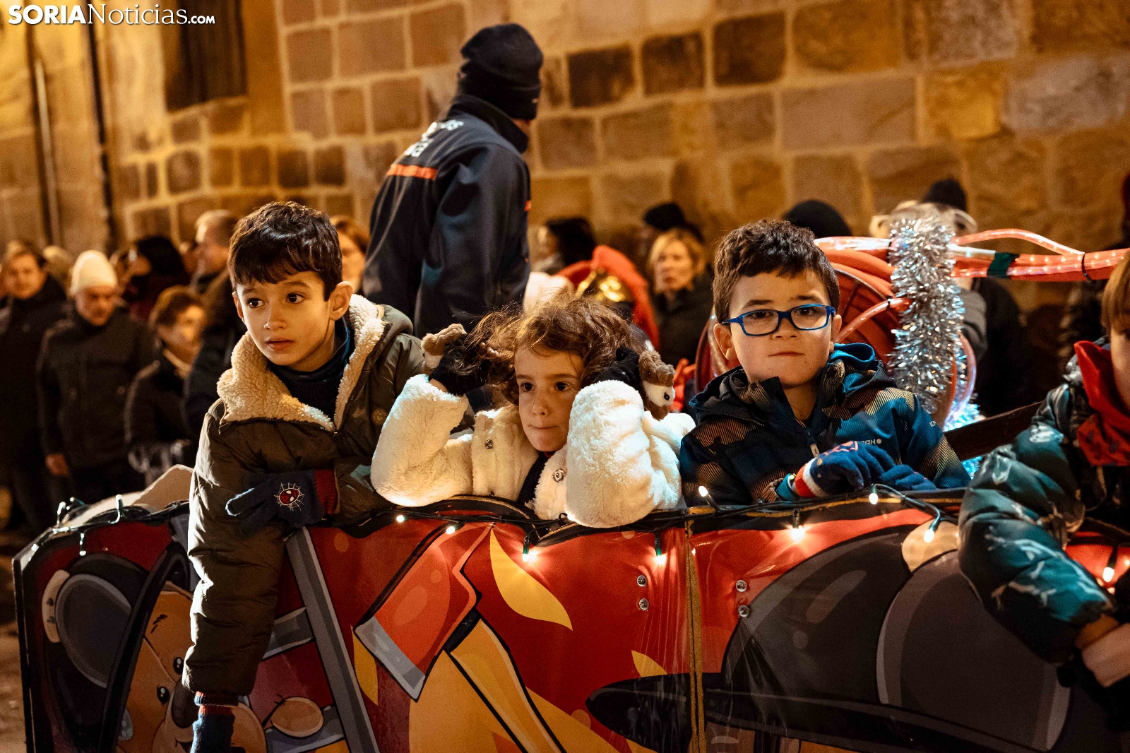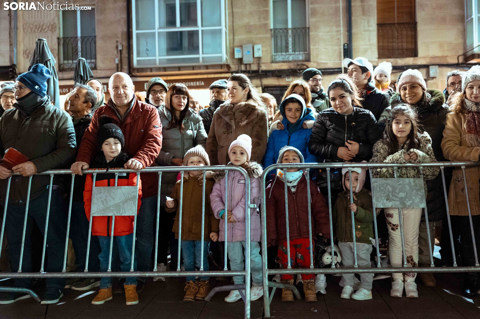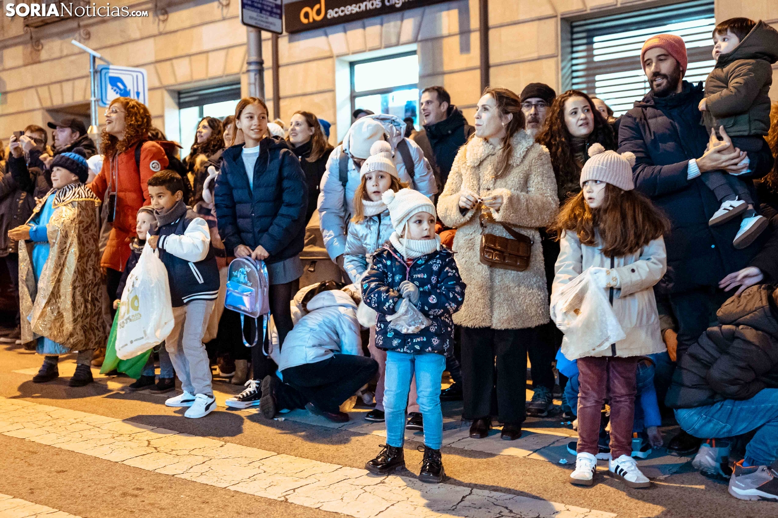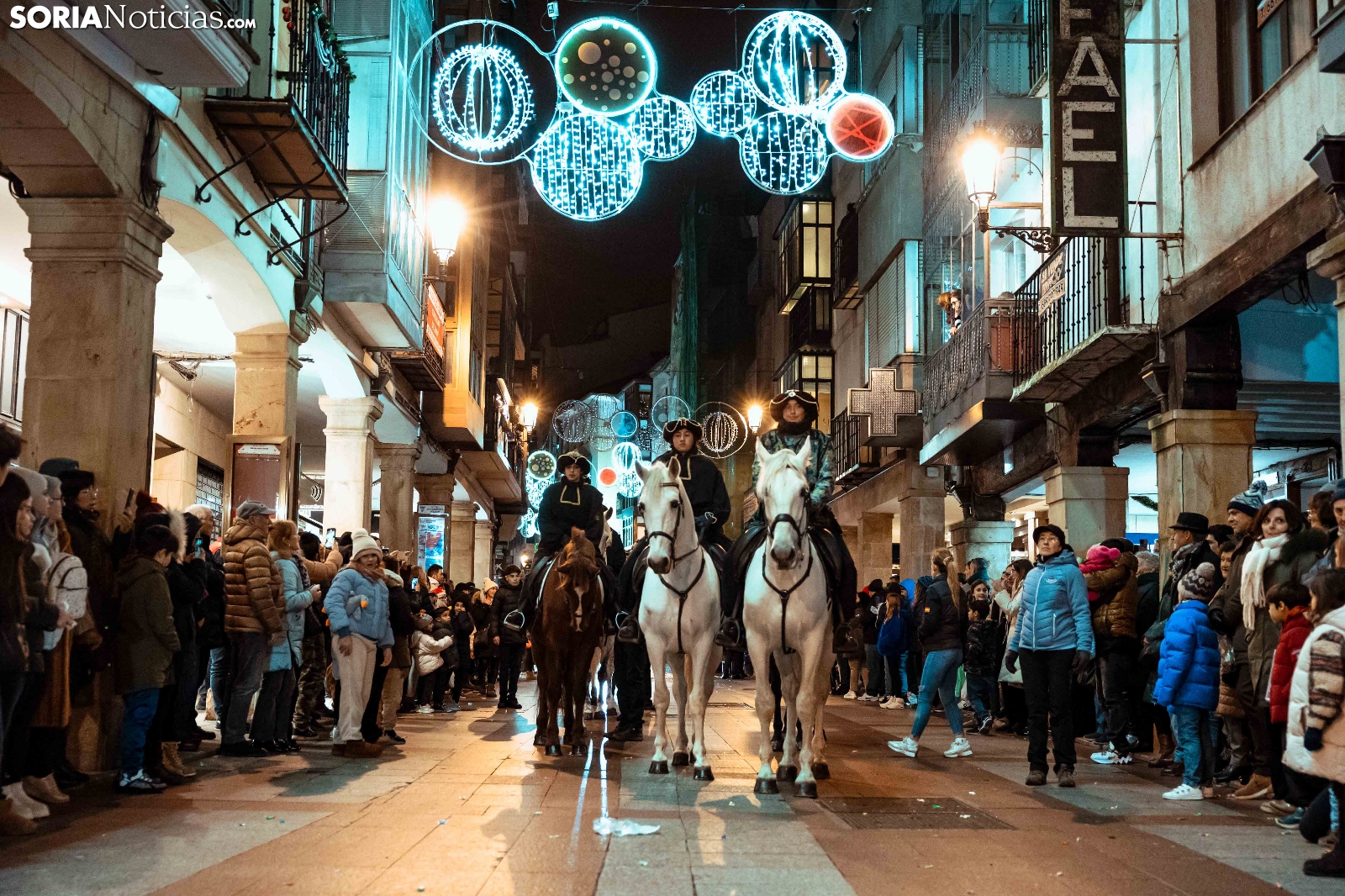 Seis carrozas, grupos de animación, animales, dulzainas, fuego, bomberos, clubs deportivos, la Banda Municipal de Música y cientos de niños a pie han formado la comitiva que ha dado la bienvenida a los Reyes Magos de Oriente en su llegada a Soria. Melchor, Gaspar y Baltasar han recorrido las prinicipales calles de la capital para llegar a la plaza Mayor donde han mostrado sus respetos y entregado sus presentes en el Belén. Por el camino, gritos, nervios, algún llanto y casi 3.000 kilos de caramelos han acompañado uno de los momentos más mágicos y emotivos del año. Ahora, todos a dormir y los Reyes a trabajar.
