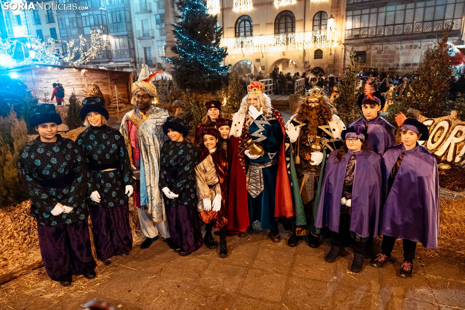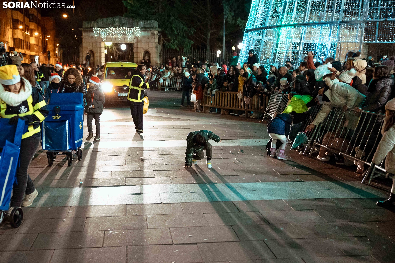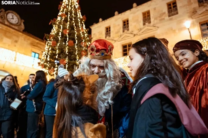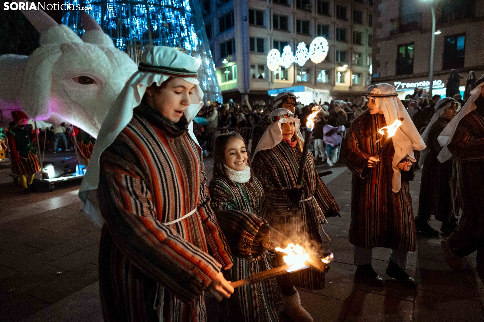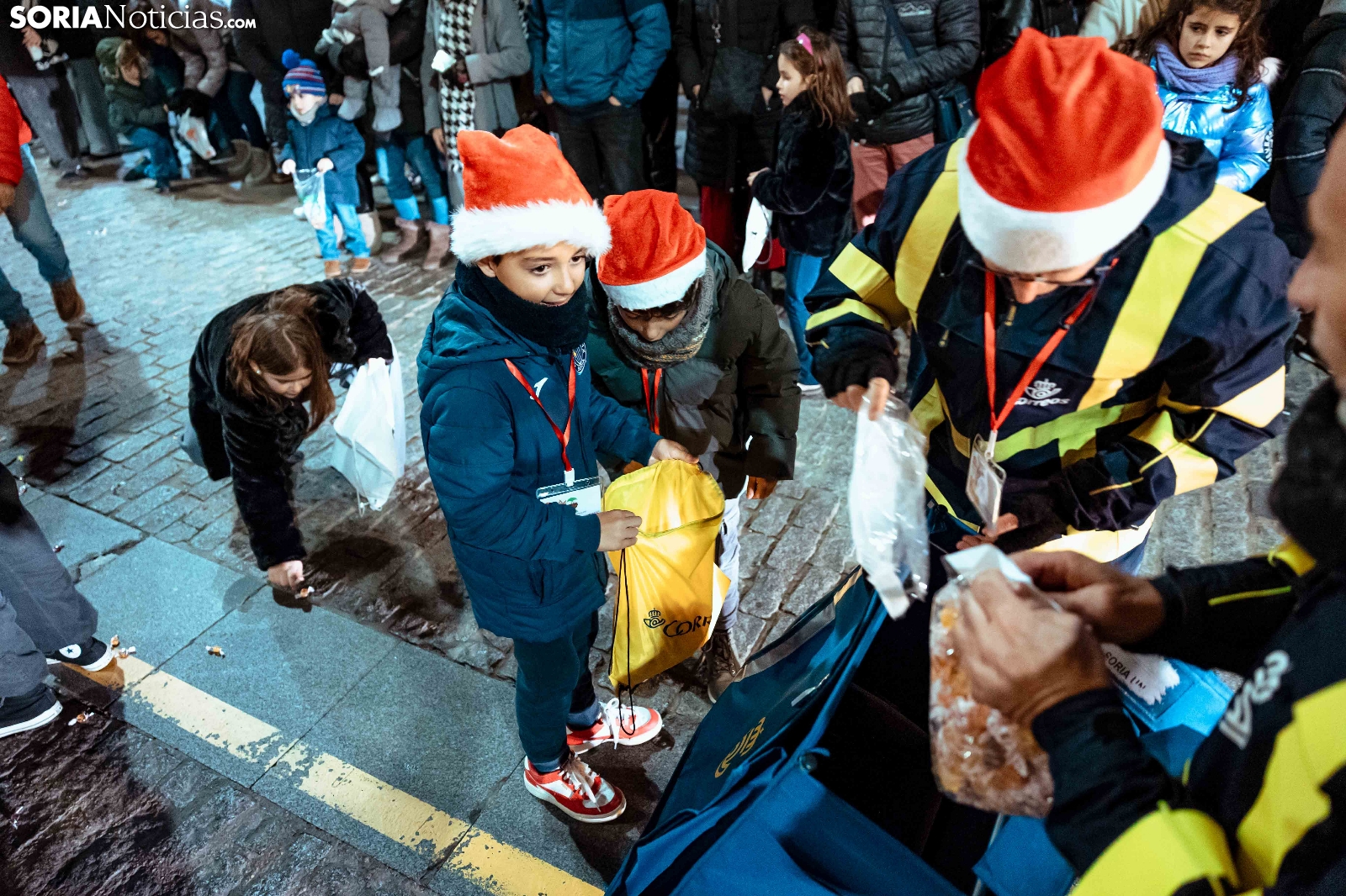 Seis carrozas, grupos de animación, animales, dulzainas, fuego, bomberos, clubs deportivos, la Banda Municipal de Música y cientos de niños a pie han formado la comitiva que ha dado la bienvenida a los Reyes Magos de Oriente en su llegada a Soria. Melchor, Gaspar y Baltasar han recorrido las prinicipales calles de la capital para llegar a la plaza Mayor donde han mostrado sus respetos y entregado sus presentes en el Belén. Por el camino, gritos, nervios, algún llanto y casi 3.000 kilos de caramelos han acompañado uno de los momentos más mágicos y emotivos del año. Ahora, todos a dormir y los Reyes a trabajar.