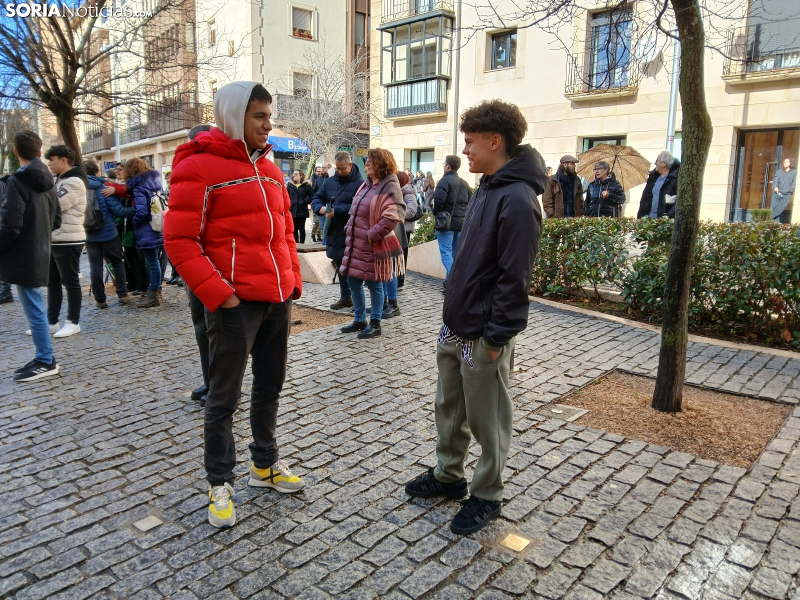 Alrededor de 60 alumnos del IES Antonio Machado, junto con estudiantes del IES Castilla y la asociación Recuerdo y Dignidad, se han concentrado en la plaza del Vergel en Soria para rendir homenaje a las 22 personas deportadas que sufrieron infortunios en los campos de concentración. Durante este 27 de enero, con motivo del Día de la Conmemoración del Holocausto, los estudiantes se han colocado junto a cada uno de los 22 Stolpersteine, que hacen referencia a cada uno de los sorianos deportados a los campos de concentración. Un acto que este año cobra especial relevancia debido a que se celebra el 80º aniversario de la liberación del campo de Auschwitz.