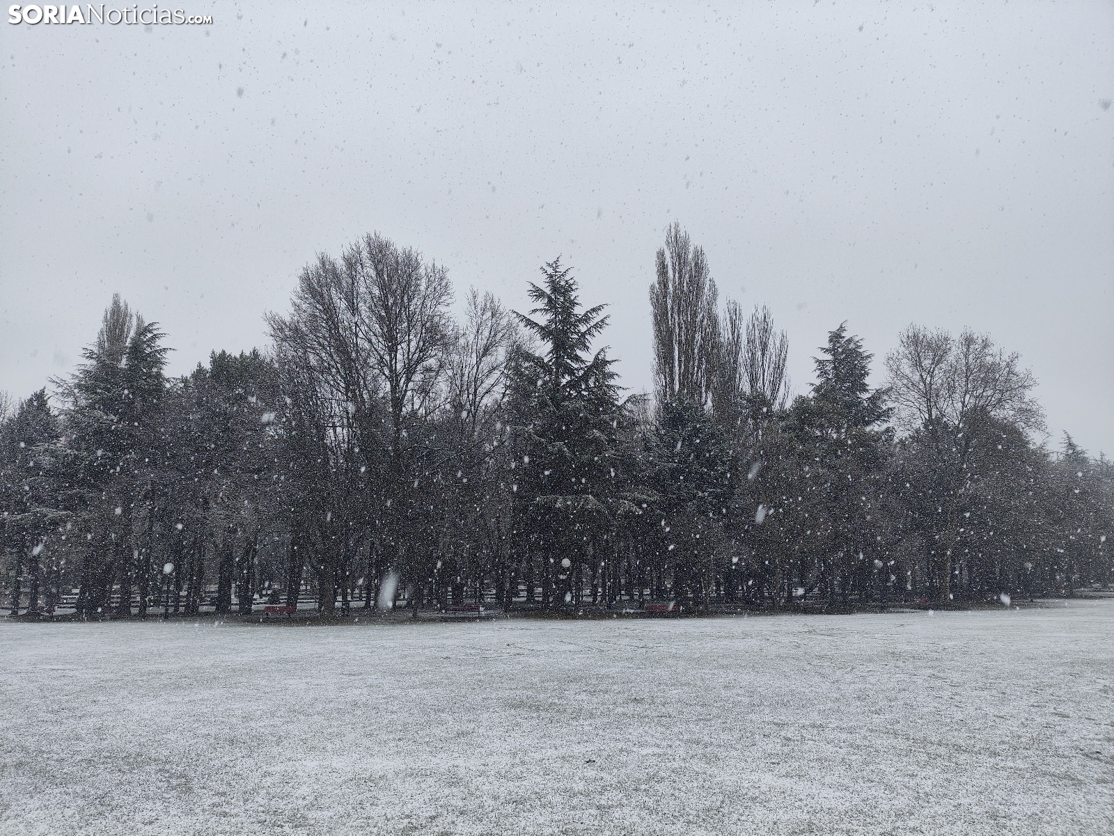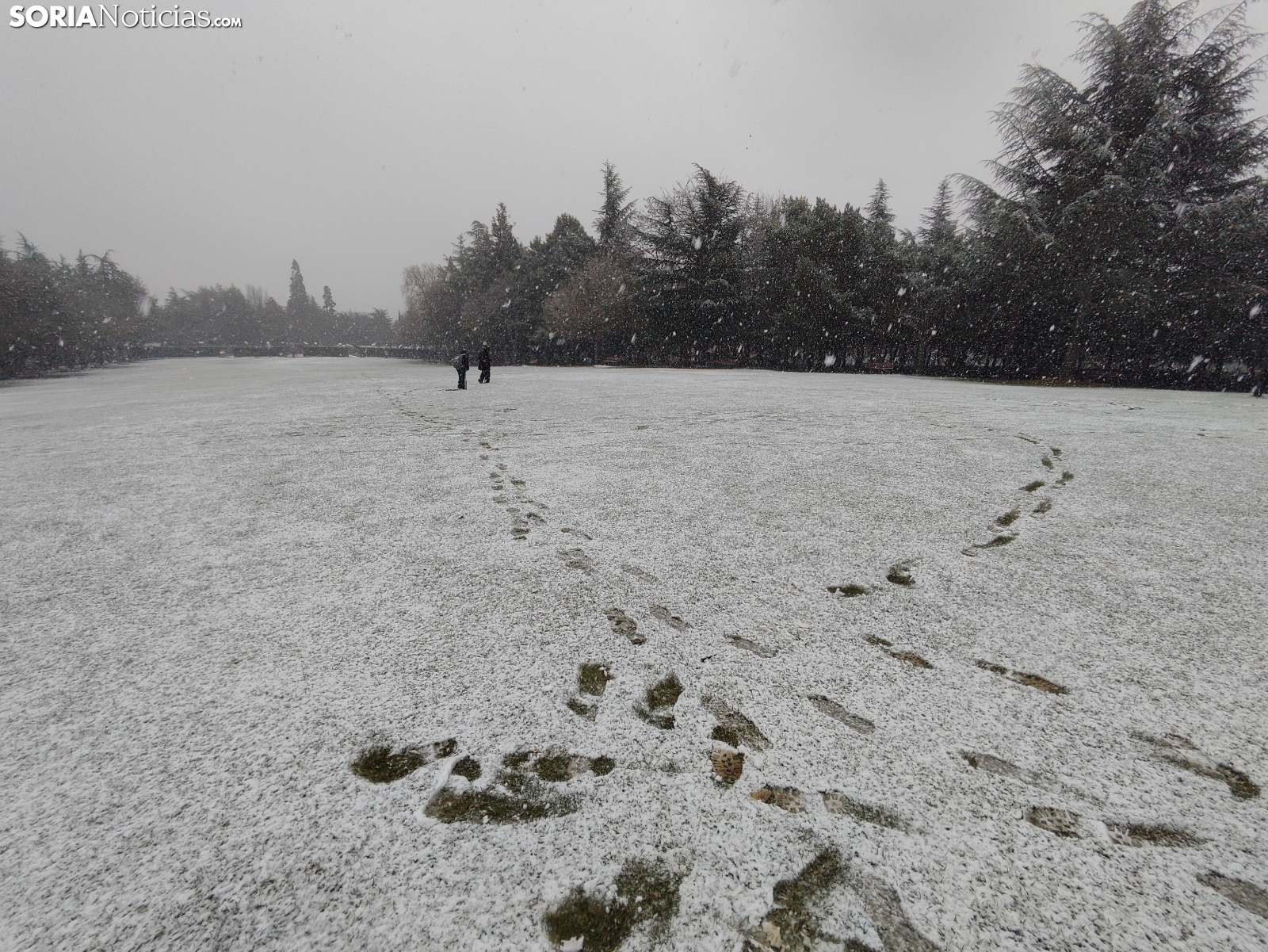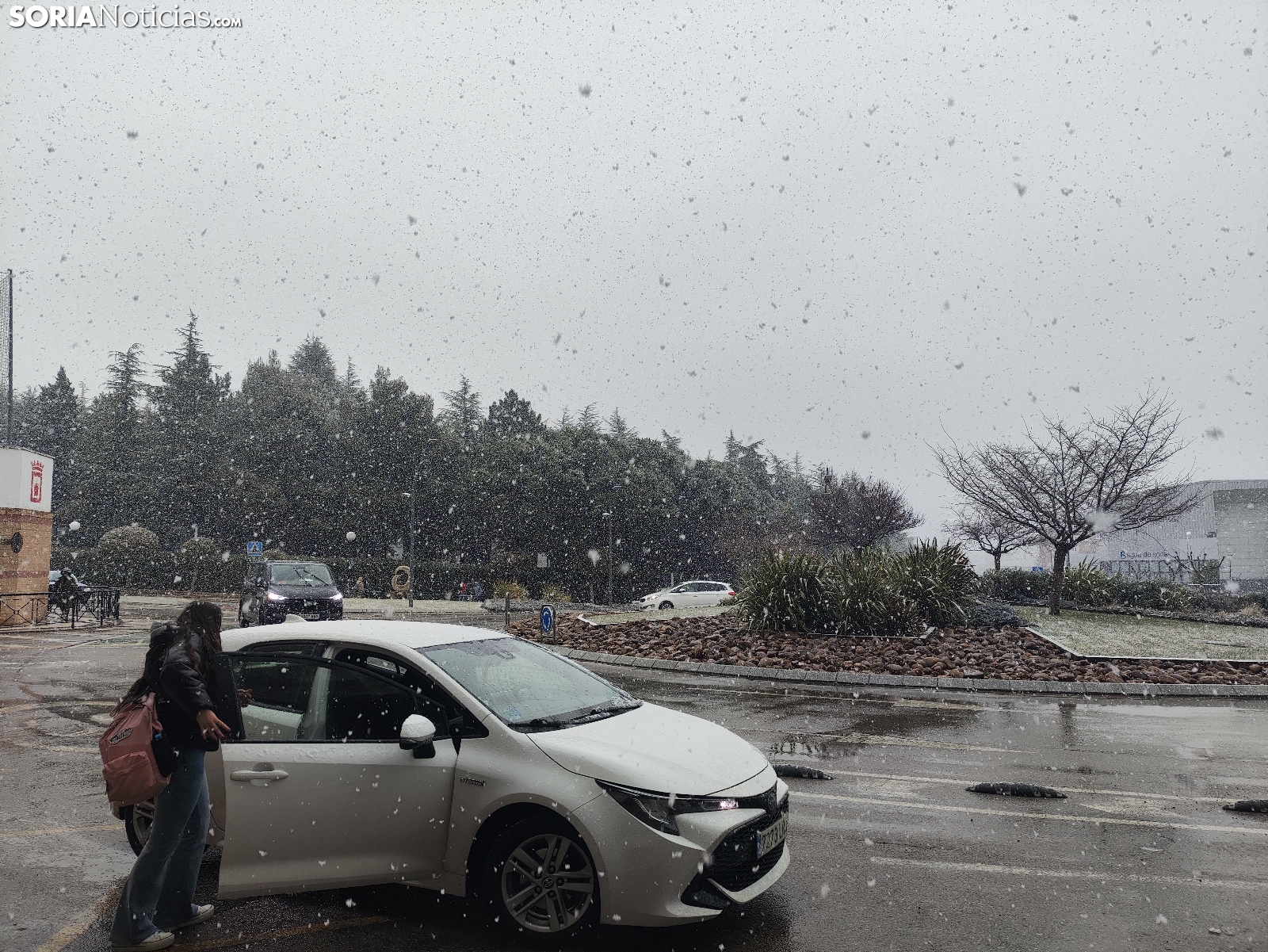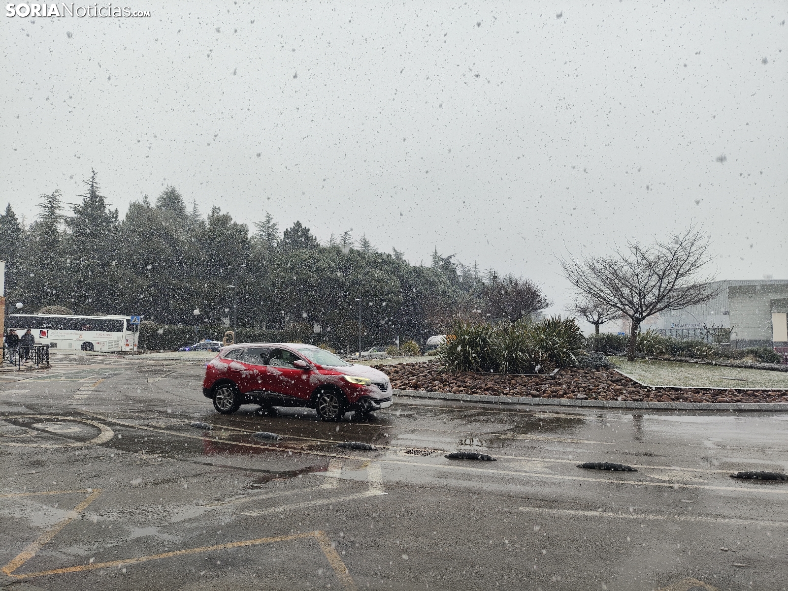 En el mediodía de este viernes 7 de febrero, la nieve que ya ha caído en algunos puntos de la provincia de Soria, especialmente en la zona de Pinares, también ha hecho presencia en Soria capital. A partir de las 14:00 los copos han comenzado a caer en la capital de manera copiosa y han cubierto tejados, vehículos y parques.