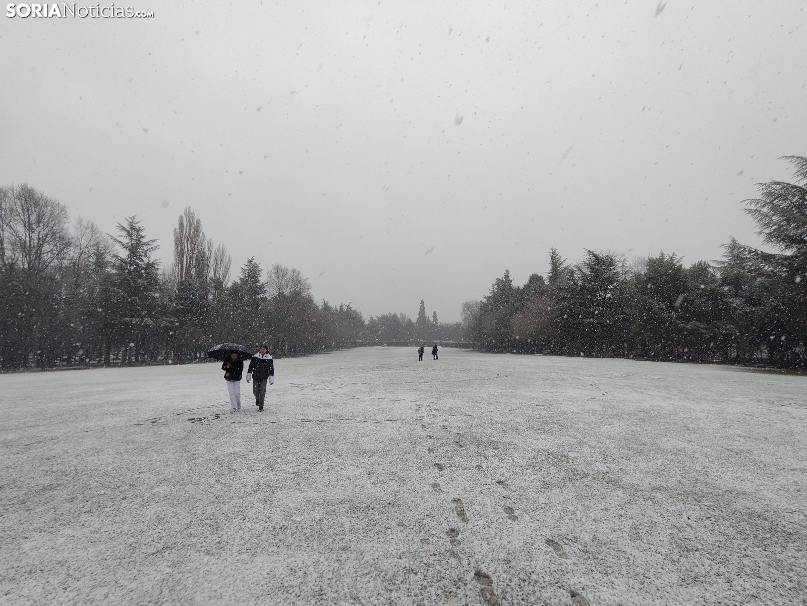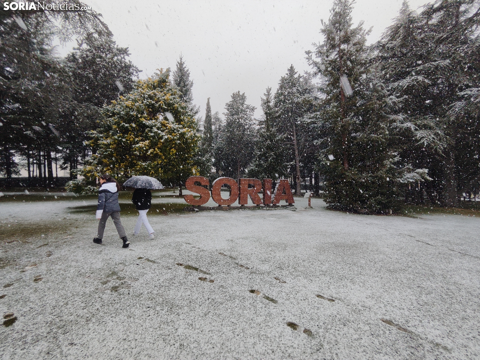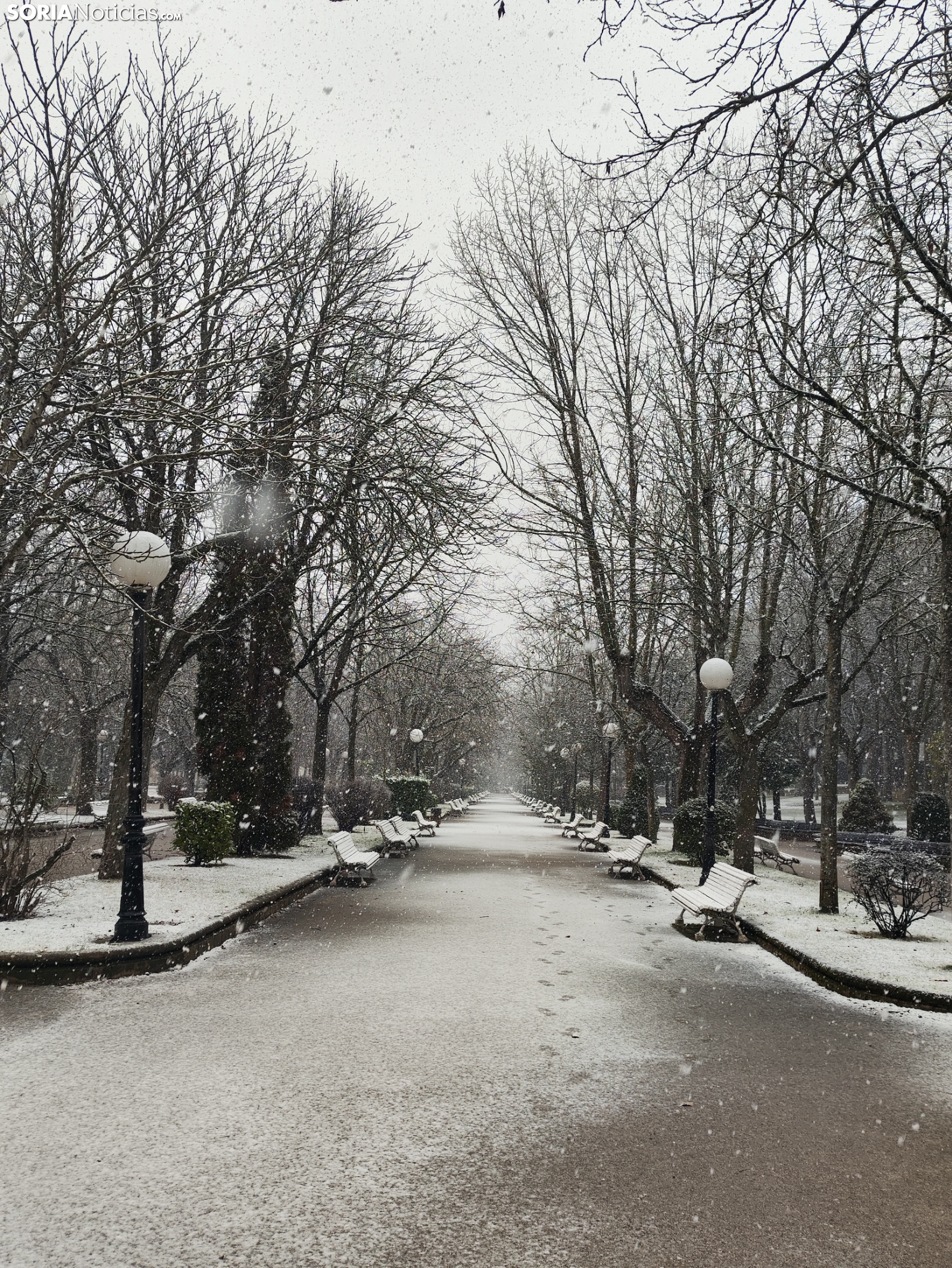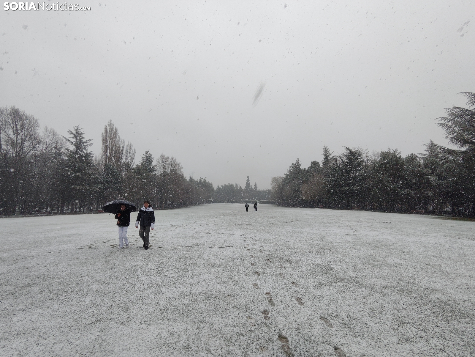En el mediodía de este viernes 7 de febrero, la nieve que ya ha caído en algunos puntos de la provincia de Soria, especialmente en la zona de Pinares, también ha hecho presencia en Soria capital. A partir de las 14:00 los copos han comenzado a caer en la capital de manera copiosa y han cubierto tejados, vehículos y parques.