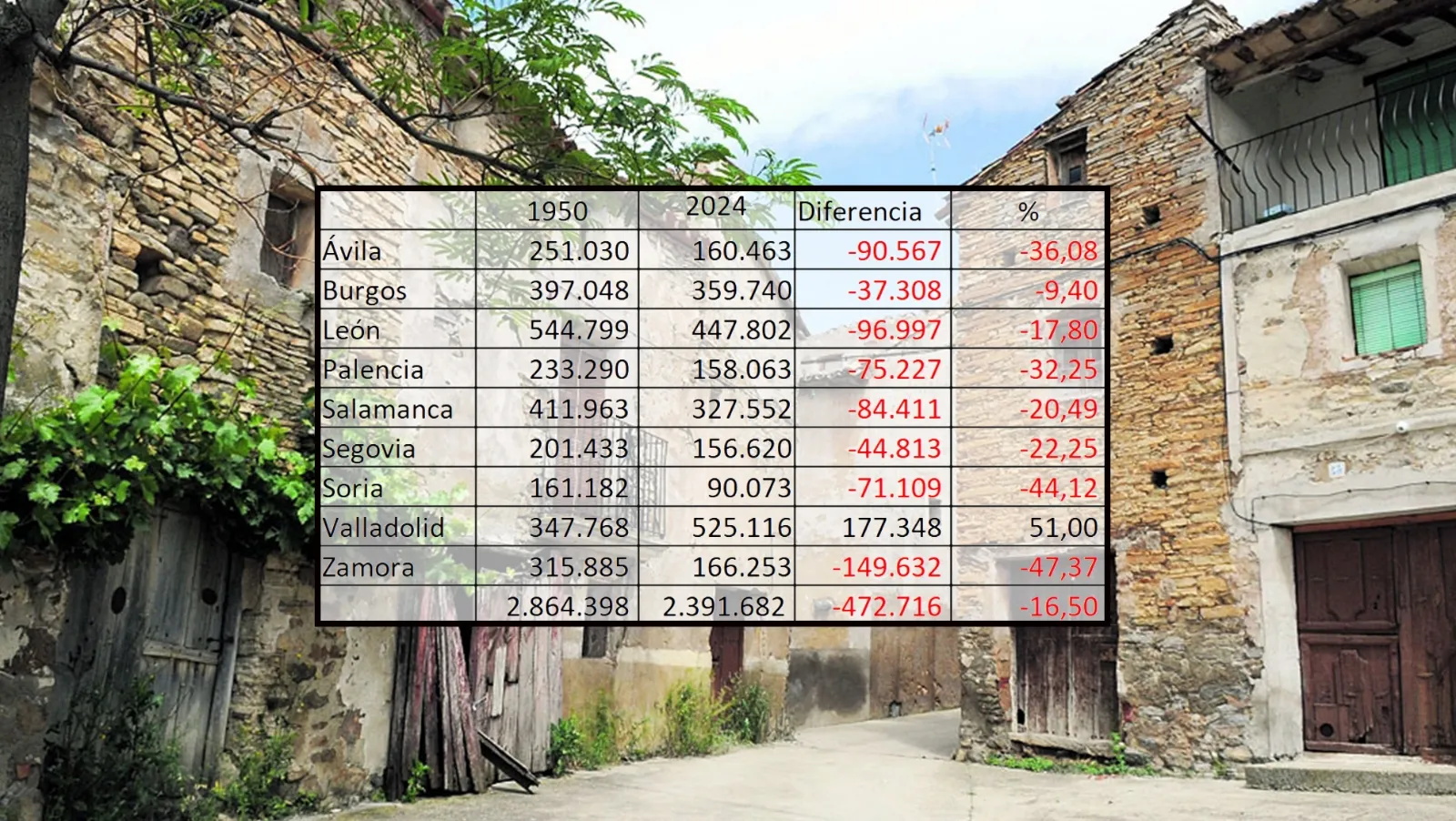 Una gráfica demoledora, donde se muestra como Castilla y León ha perdido el 16.5% de su población desde 1950. En ese mismo periodo, el conjunto de España pasó de 28 millones de personas a 48, más de un 70% de crecimiento. La situación es aún más dramática si se miran los datos provincia por provincia.