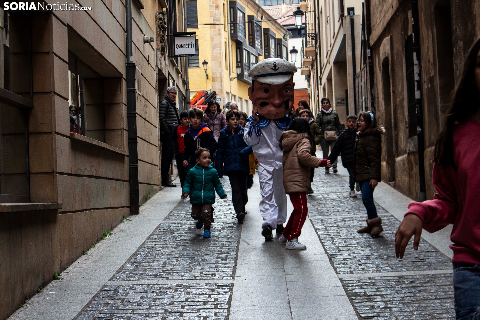 Algarabía, carreras, disfraces, griterío y niños, muchos niños han poblado la mañana de este viernes carnavalero en la capital soriana. Los pequeños han querido acompañar a la comparsa municipal de cabezudos que han recorrido las calles del centro de la ciudad para su primera salida del año, haciendo las delicias de la chiquillería. La fiesta está servida.