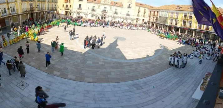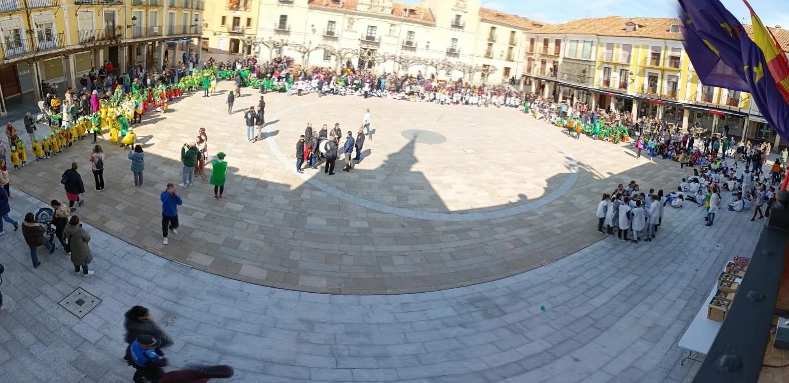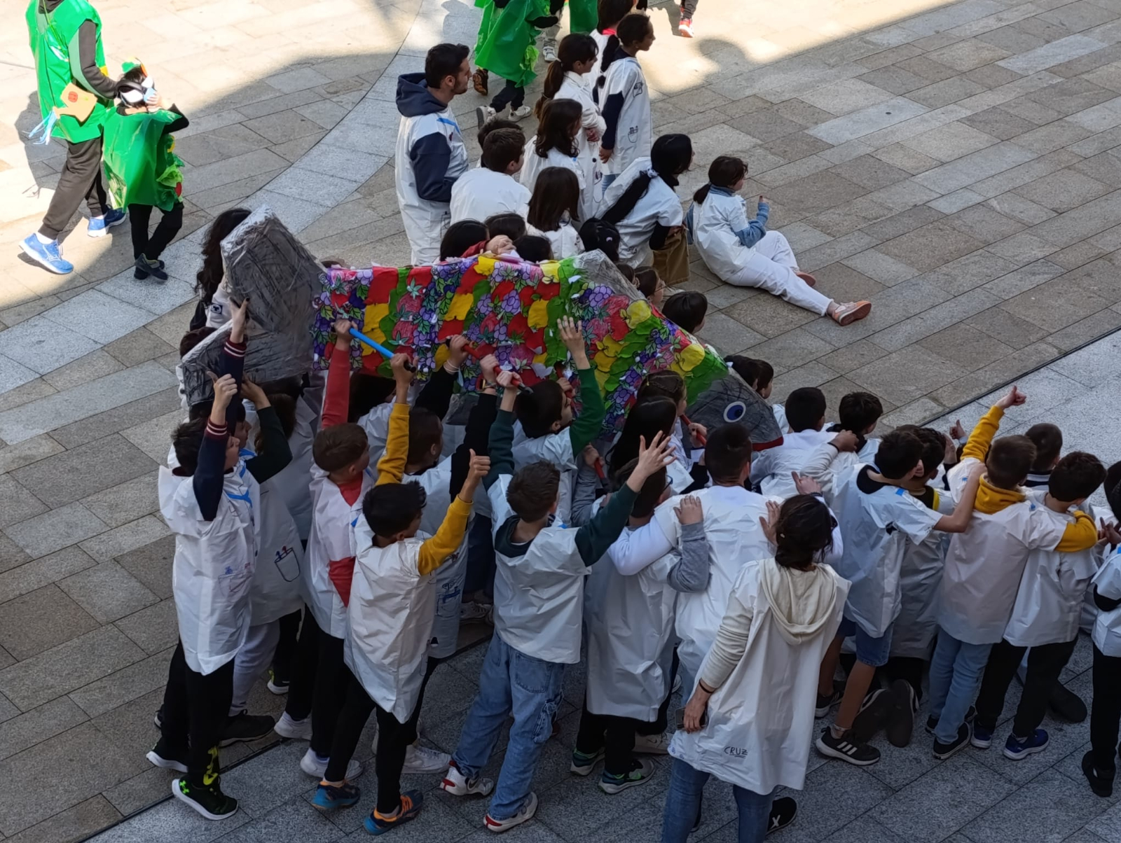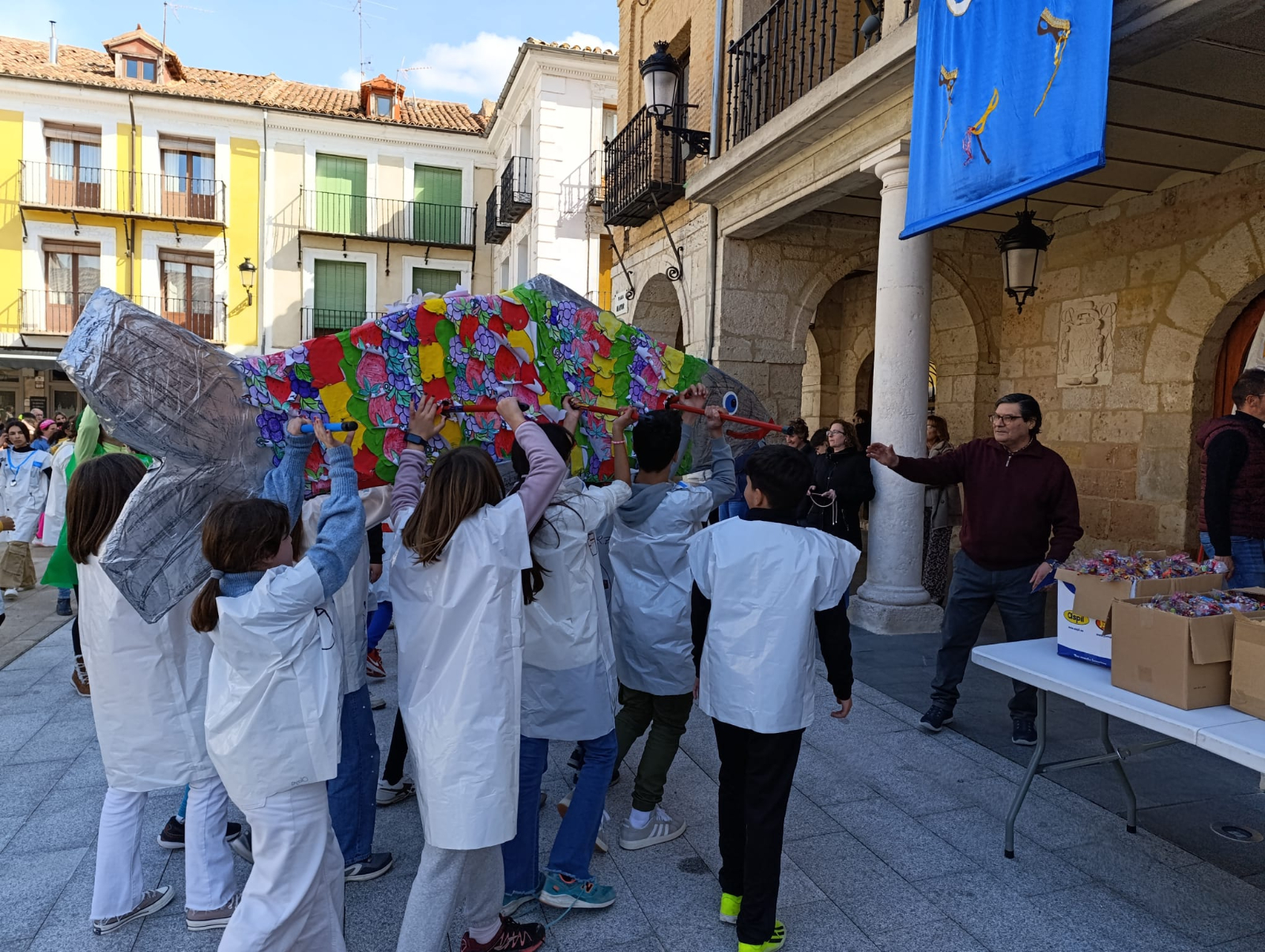 La celebración en la calle comenzaba tras el recreo, los alumnos y profesores han salido al ritmo de charanga montando una gran procesión de colorido que les ha llevado hasta la Plaza Mayor. Allí han entregado la sardina en el Ayuntamiento y esta ya luce en el balcón de la Casa Consistorial.