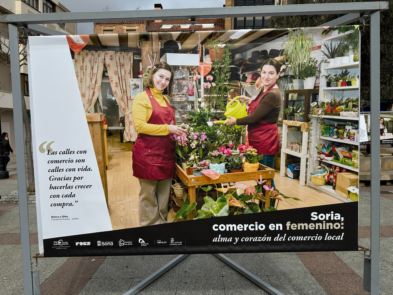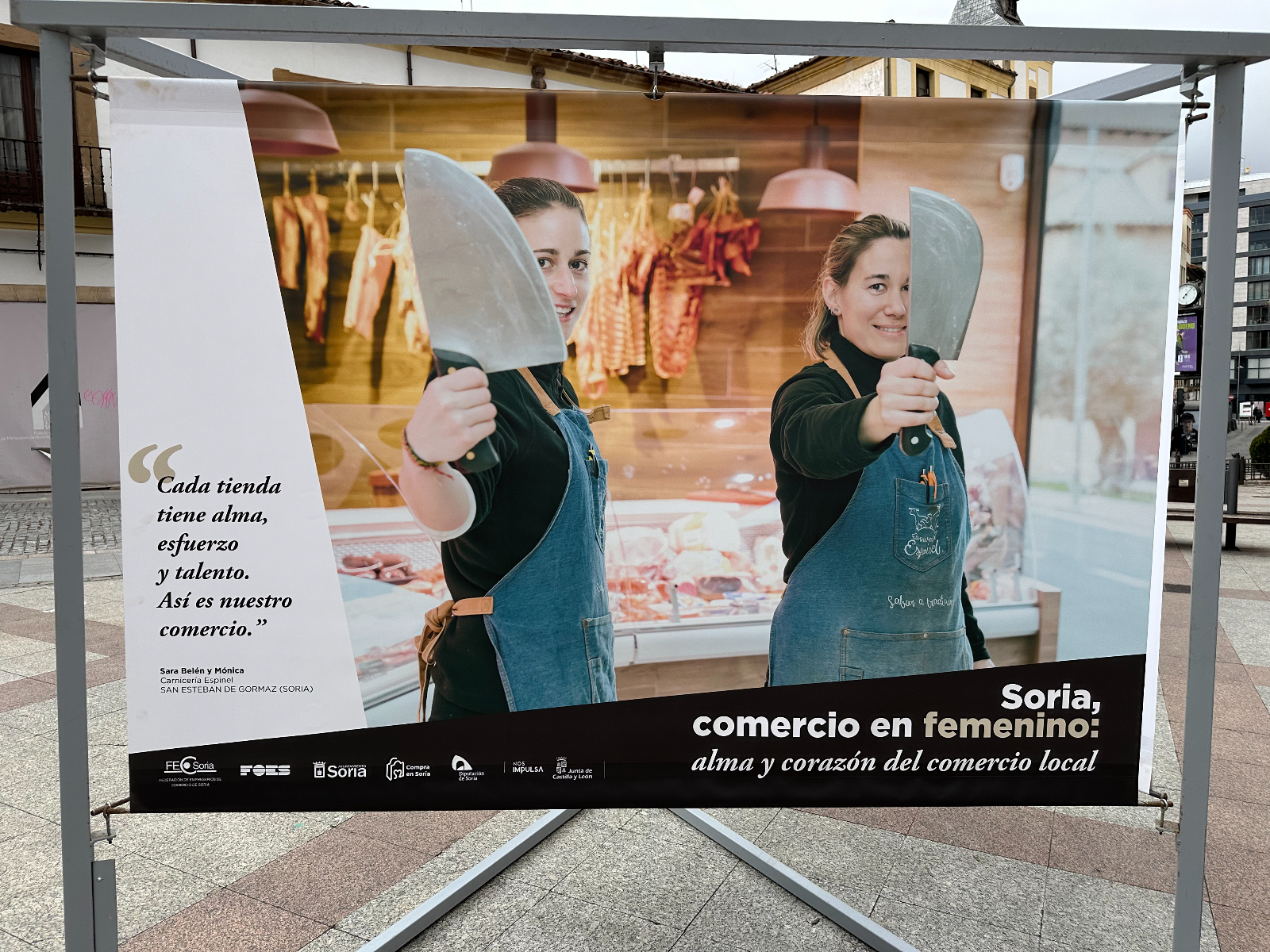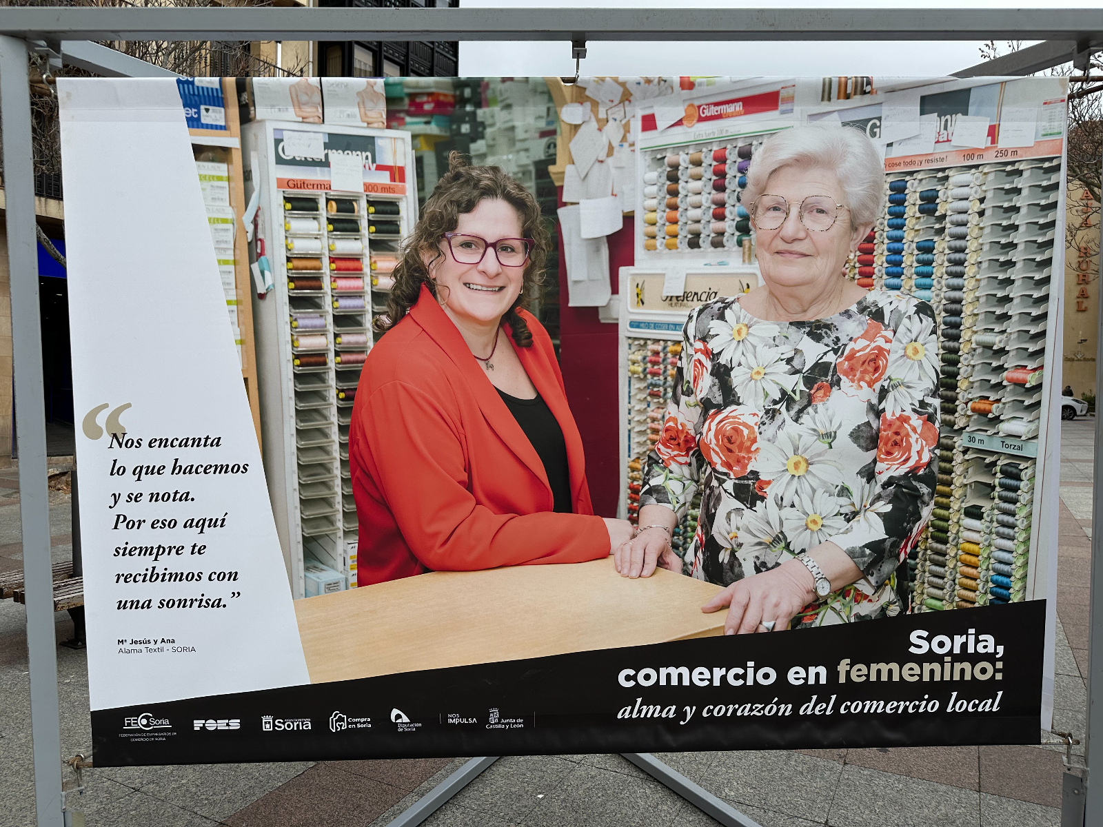 Las protagonistas no son solo de la capital. Aparecen mujeres de localidades como Almazán, Vinuesa, Ólvega, San Esteban de Gormaz, El Burgo de Osma, Arcos de Jalón y Berlanga de Duero. Junto a sus imágenes, la lona contiene una frase que han querido compartir para destacar su labor: "Nos reinventamos cada día para seguir ofreeciéndote lo mejor, porque creemos en lo que hacemos", señala la cita de Mª Dolores, de la Carnicería Hnos. Garrido Mediavilla, de Vinuesa. Pertenecen a comercios que ofrecen diversos productos o servicios, como textil, alimentación, repostería y panadería, entre otros.