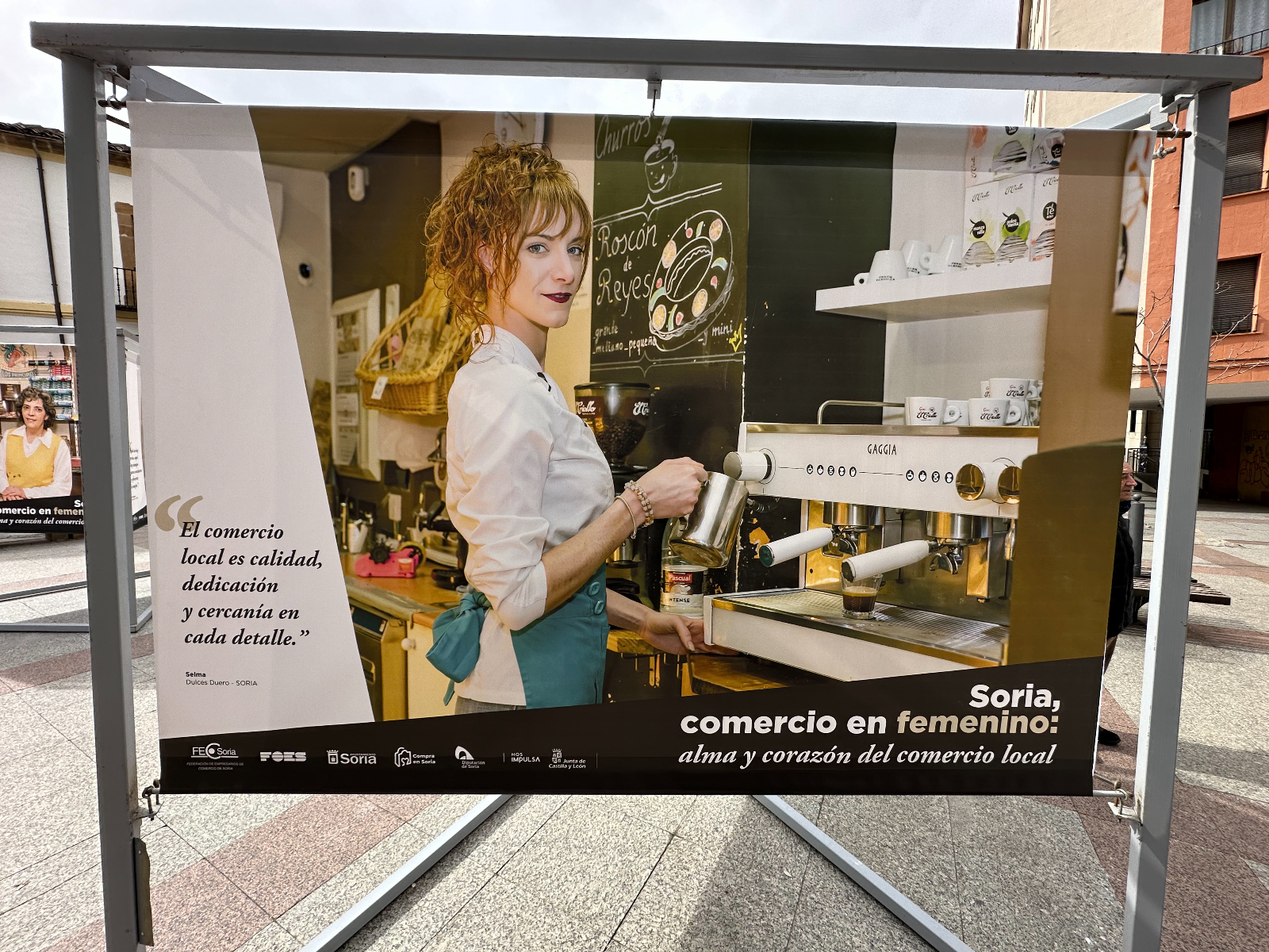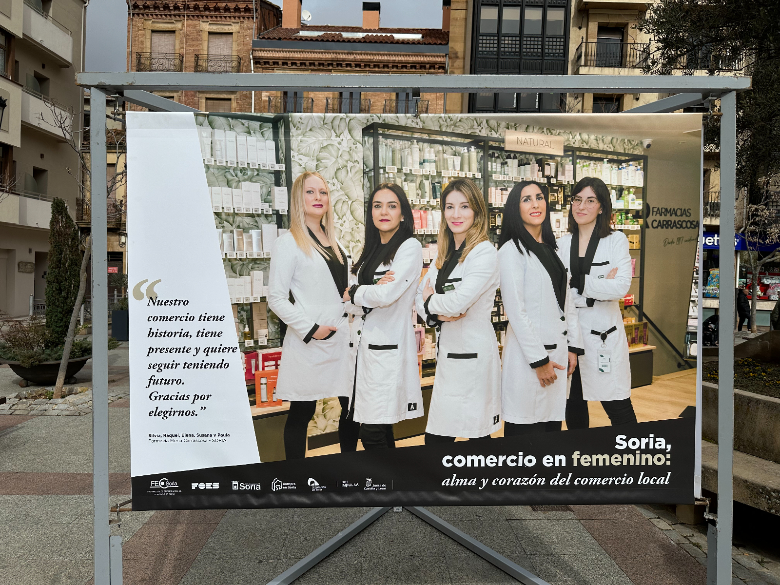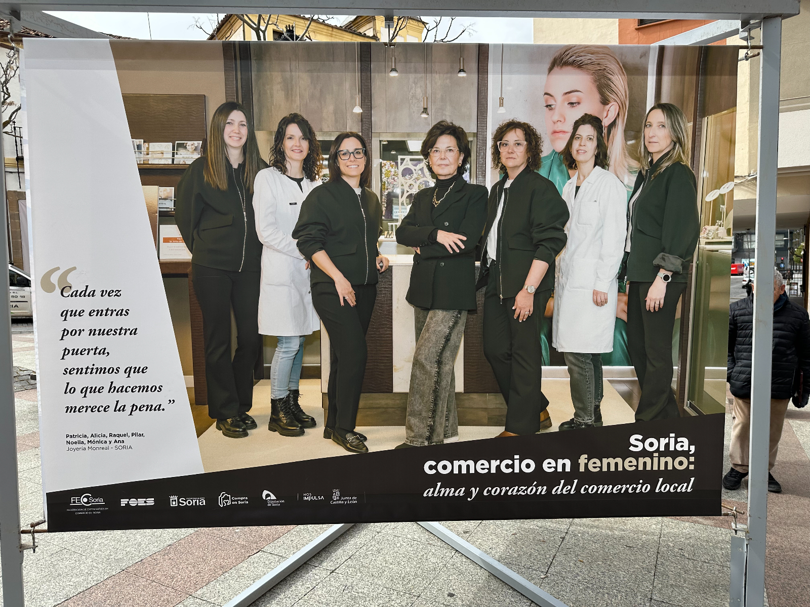 Las protagonistas no son solo de la capital. Aparecen mujeres de localidades como Almazán, Vinuesa, Ólvega, San Esteban de Gormaz, El Burgo de Osma, Arcos de Jalón y Berlanga de Duero. Junto a sus imágenes, la lona contiene una frase que han querido compartir para destacar su labor: "Nos reinventamos cada día para seguir ofreeciéndote lo mejor, porque creemos en lo que hacemos", señala la cita de Mª Dolores, de la Carnicería Hnos. Garrido Mediavilla, de Vinuesa. Pertenecen a comercios que ofrecen diversos productos o servicios, como textil, alimentación, repostería y panadería, entre otros.