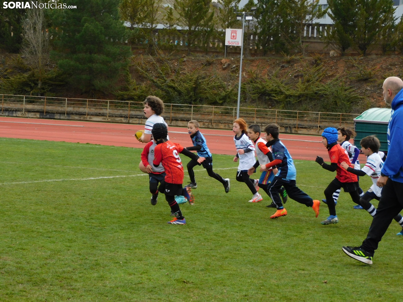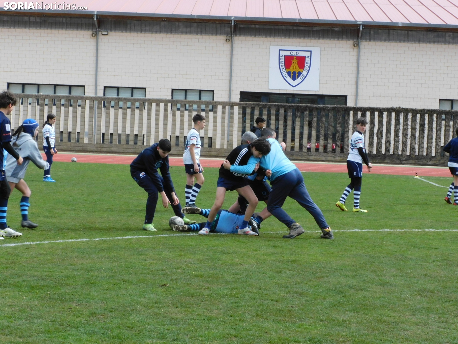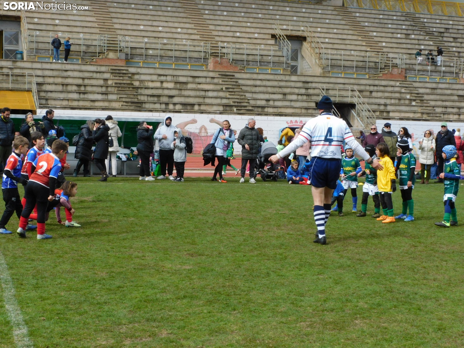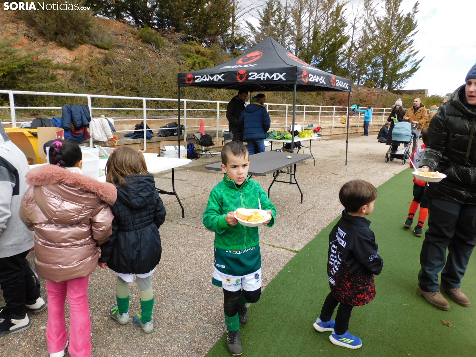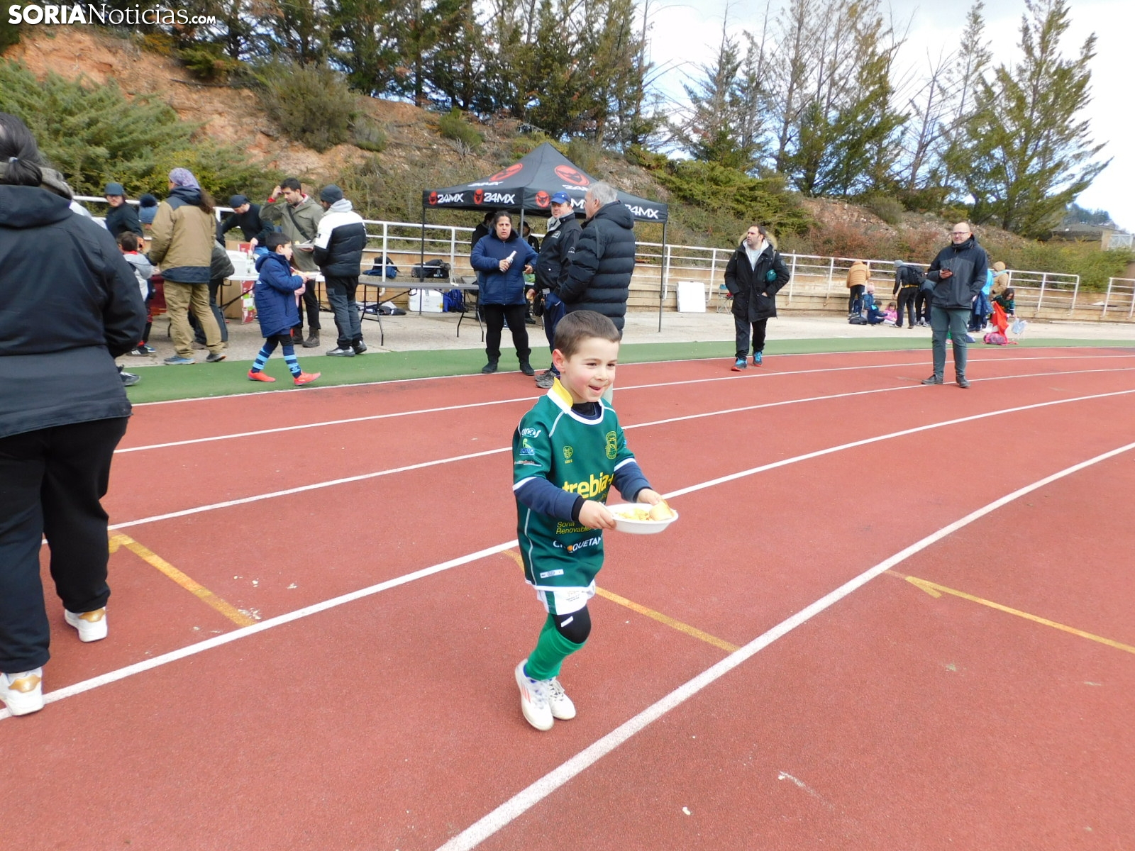 El rugby en Soria sigue en auge tras el éxito de la exposición del XXV aniversario del Ingenieros de Soria. Este sábado 15 de marzo, el estadio de Los Pajaritos se ha convertido en el escenario del Torneo Trebia de Escuelas de Rugby, donde cerca de 400 niños han disfrutado de una jornada llena de aprendizaje, compañerismo y valores. Equipos de Aragón, Castilla y León, Navarra y Madrid han participado en este divertido evento, en el que ha habido tiempo para el tercer tiempo con una deliciosa paella. Después de que todos los participantes cogieran fuerzas, la jornada ha terminado con un partido de touch rugby entre Ingenieros de Soria y Fénix Rugby, protagonizado por padres y madres de los pequeños jugadores.