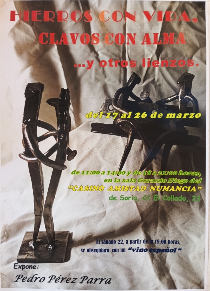 Desde este lunes, 17 de marzo, y hasta el próximo miércoles, 26 de marzo, el salón Gerardo Diego del Círculo Amistad Numancia acoge la exposición 'Hierros con vida, Clavos con Alma...y otros lienzos' del artista soriano Pedro Pérez Parra.