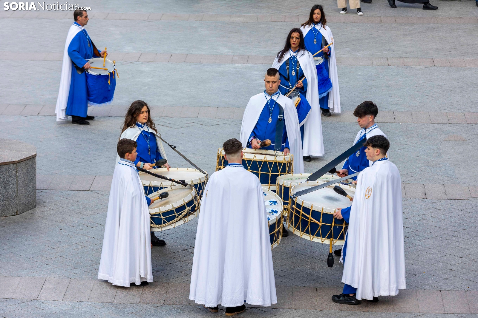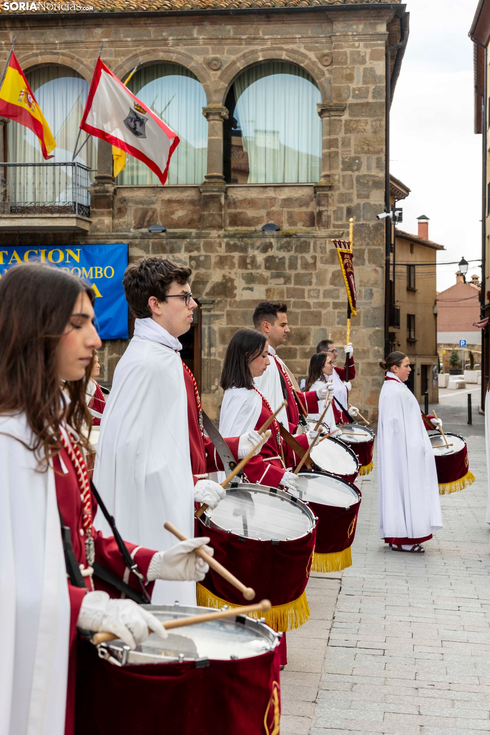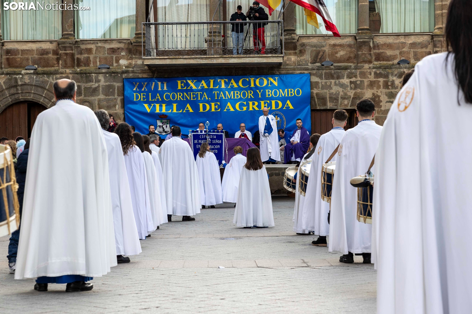 Nueve cofradías procedentes de Castilla y León, La Rioja, Aragón y Navarra se han dado cita esta tarde en la Plaza Mayor de Ágreda para participar en una nueva Exaltación de la corneta, el tambor y el bombo en la ‘Villa de las Tres Culturas’. A pesar de las inclemencias meteorológicas, centenares de personas se han reunido en esta céntrica ubicación para disfrutar del acto organizado por la Cofradía de la Santa Vera Cruz de Ágreda.