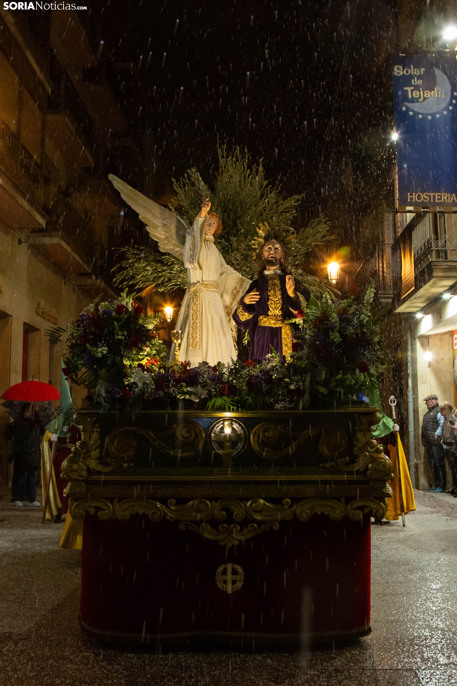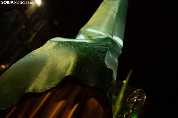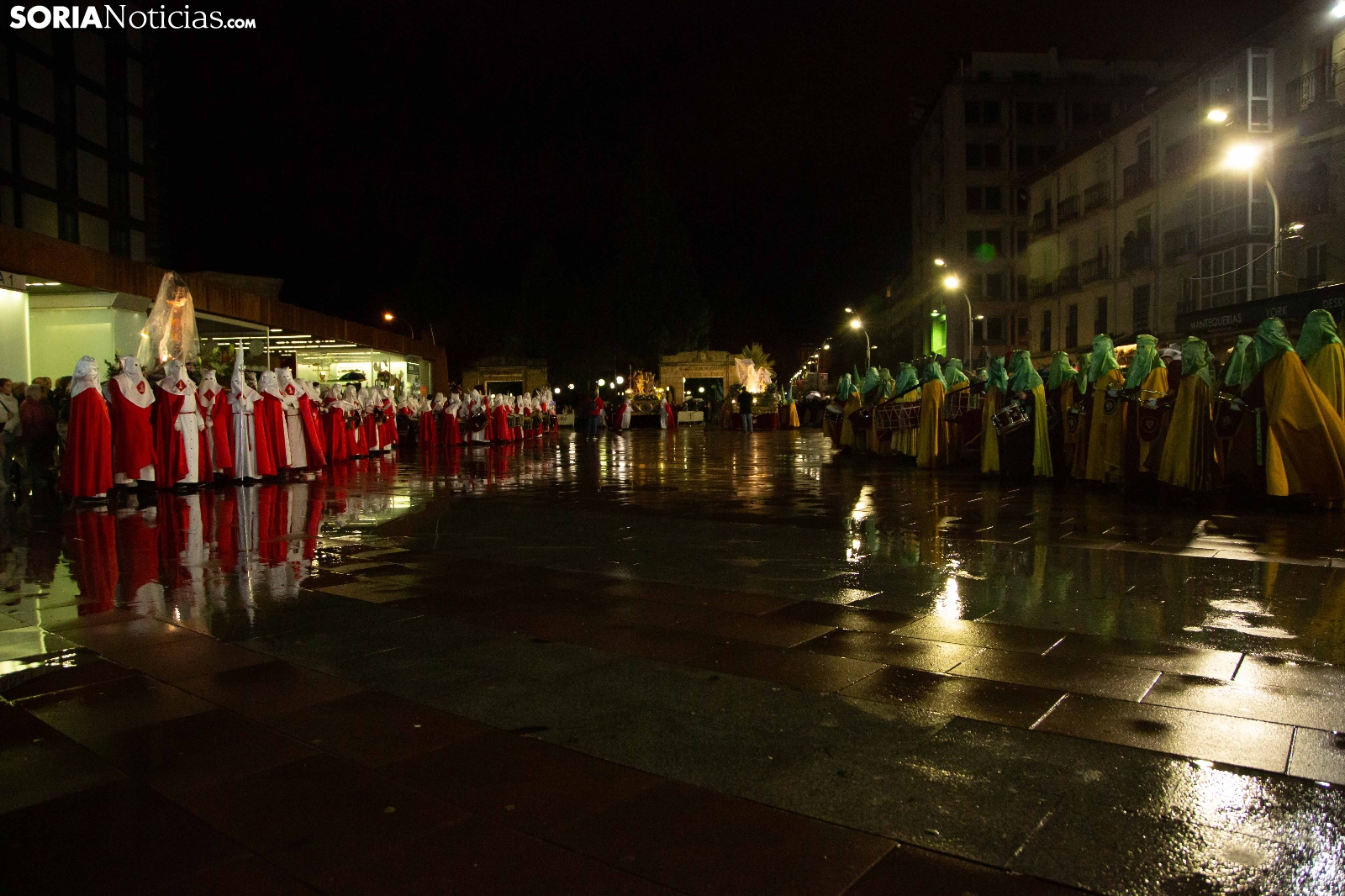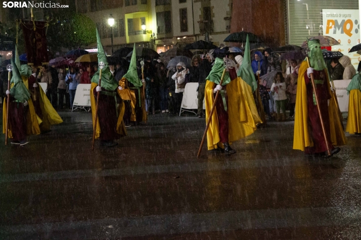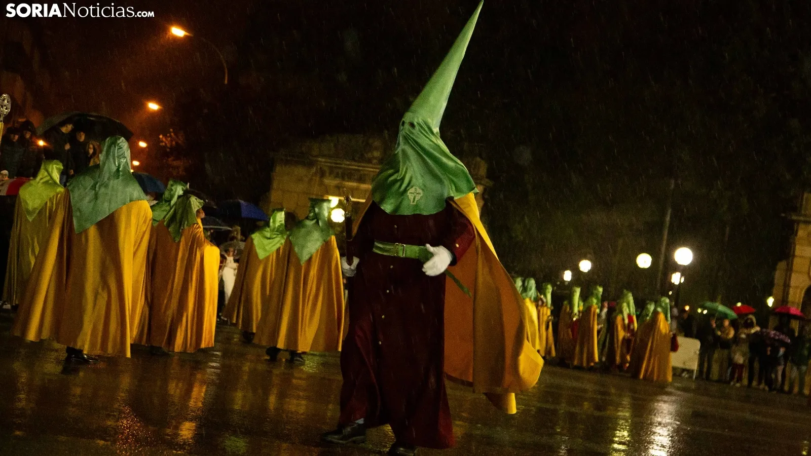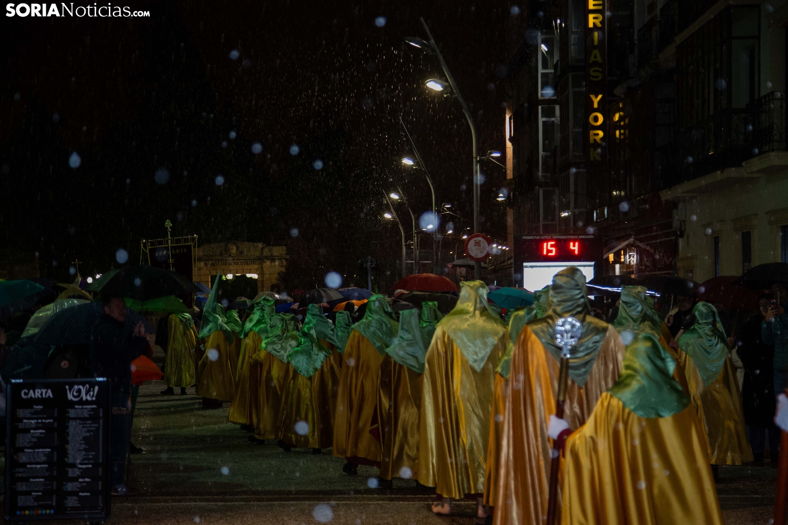 Aunque la lluvia, que había querido dar una pausa esta tarde de Martes Santo en la capital soriana, finalmente llegaba el granizo, precisamente avanzada ya la procesión. Las dos comitivas iniciales partían a las nueve de la noche del Espino y del Carmen con los ojos puestos en el cielo por parte de los integrantes de las cofradías de La Flagelación del Señor y de La Oración en el Huerto. Media hora después, ya en Mariano Granados, el granizo, intenso durante varios y largos minutos hacía extender los paraguas del público mientras que los cofrades aguantaban con estoicismo la borrasca. La procesión de hoy es siempre una de las manifestaciones de hermandad y de devoción que se hace patente con la reunión de ambos grupos en la céntrica plaza de la ciudad. Allí ha sido oficiado el saludo y abrazo solemne, como cada año, entre los hermanos mayores de ambas cofradías bajo el silencio, acallado por las bandas de percusión y de viento de los procesionantes que han encarado su camino, con intemperie poco favorable, hacia la concatedral de San Pedro.