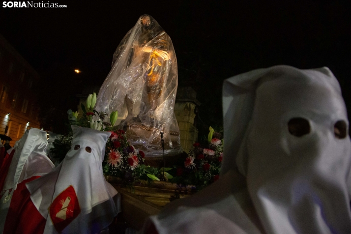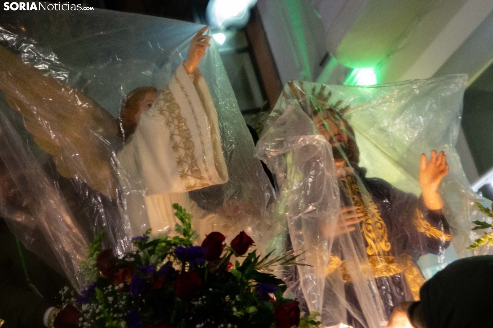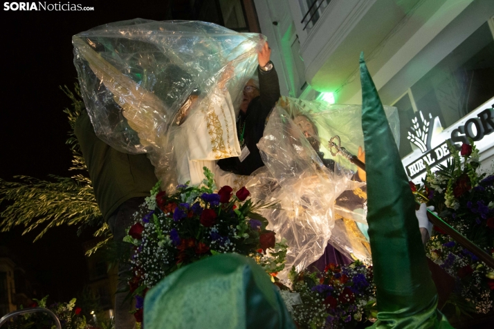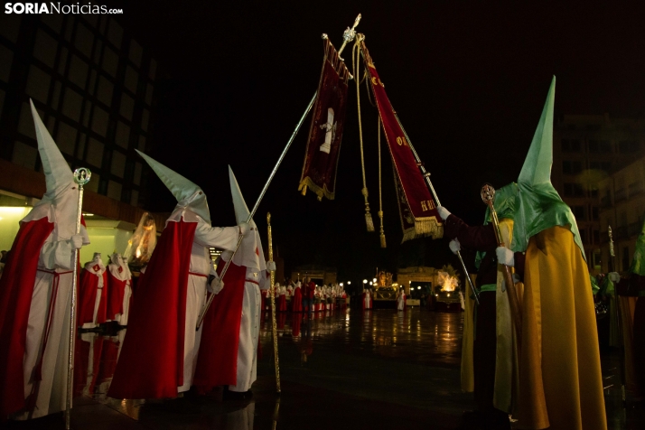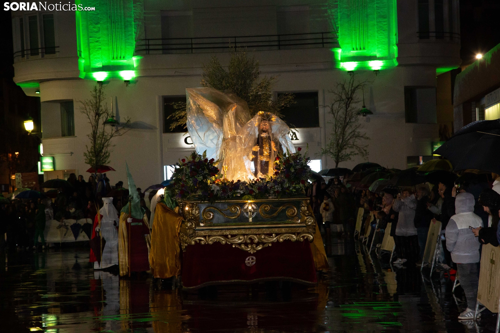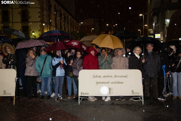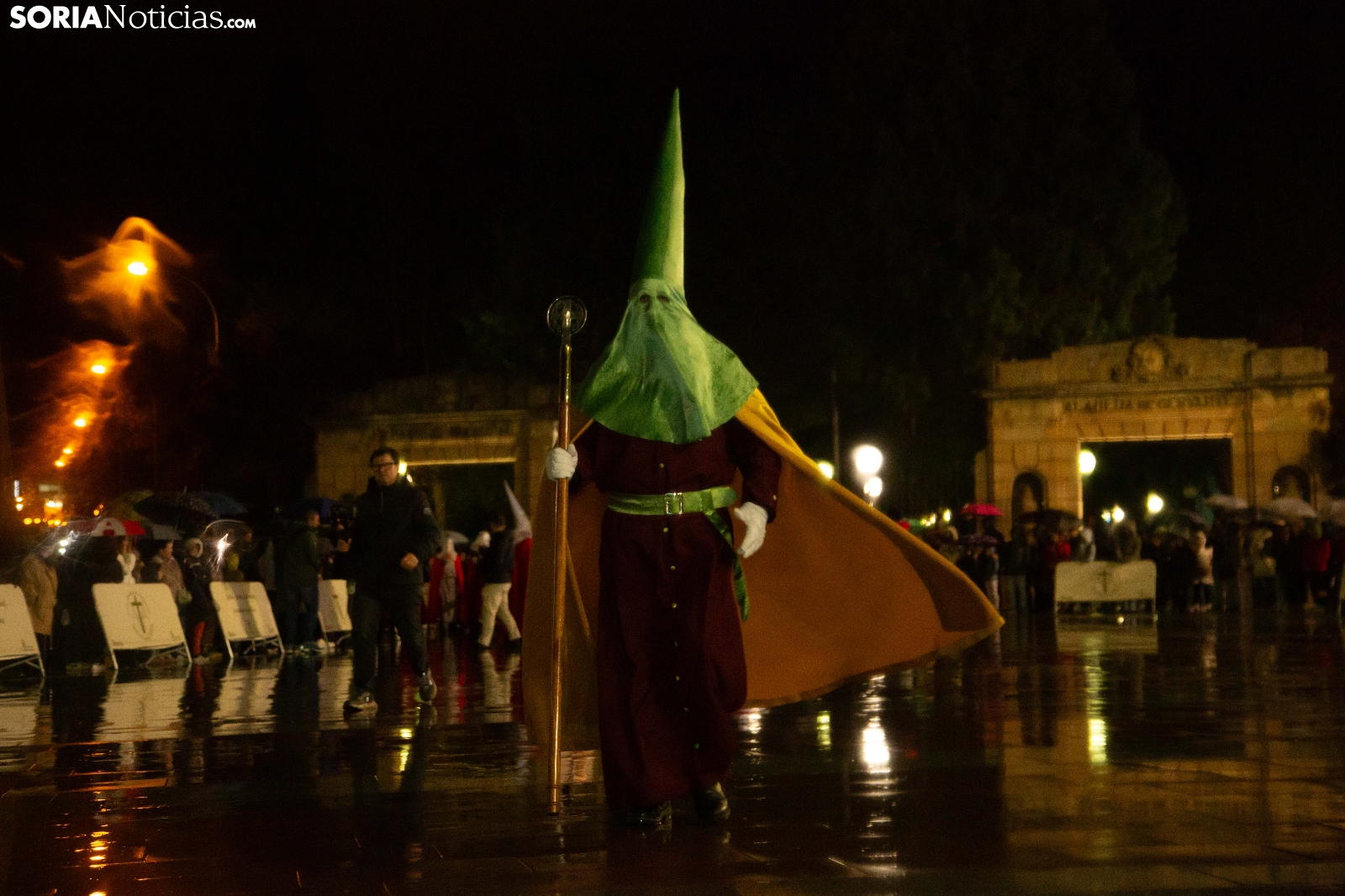Aunque la lluvia, que había querido dar una pausa esta tarde de Martes Santo en la capital soriana, finalmente llegaba el granizo, precisamente avanzada ya la procesión. Las dos comitivas iniciales partían a las nueve de la noche del Espino y del Carmen con los ojos puestos en el cielo por parte de los integrantes de las cofradías de La Flagelación del Señor y de La Oración en el Huerto. Media hora después, ya en Mariano Granados, el granizo, intenso durante varios y largos minutos hacía extender los paraguas del público mientras que los cofrades aguantaban con estoicismo la borrasca. La procesión de hoy es siempre una de las manifestaciones de hermandad y de devoción que se hace patente con la reunión de ambos grupos en la céntrica plaza de la ciudad. Allí ha sido oficiado el saludo y abrazo solemne, como cada año, entre los hermanos mayores de ambas cofradías bajo el silencio, acallado por las bandas de percusión y de viento de los procesionantes que han encarado su camino, con intemperie poco favorable, hacia la concatedral de San Pedro.