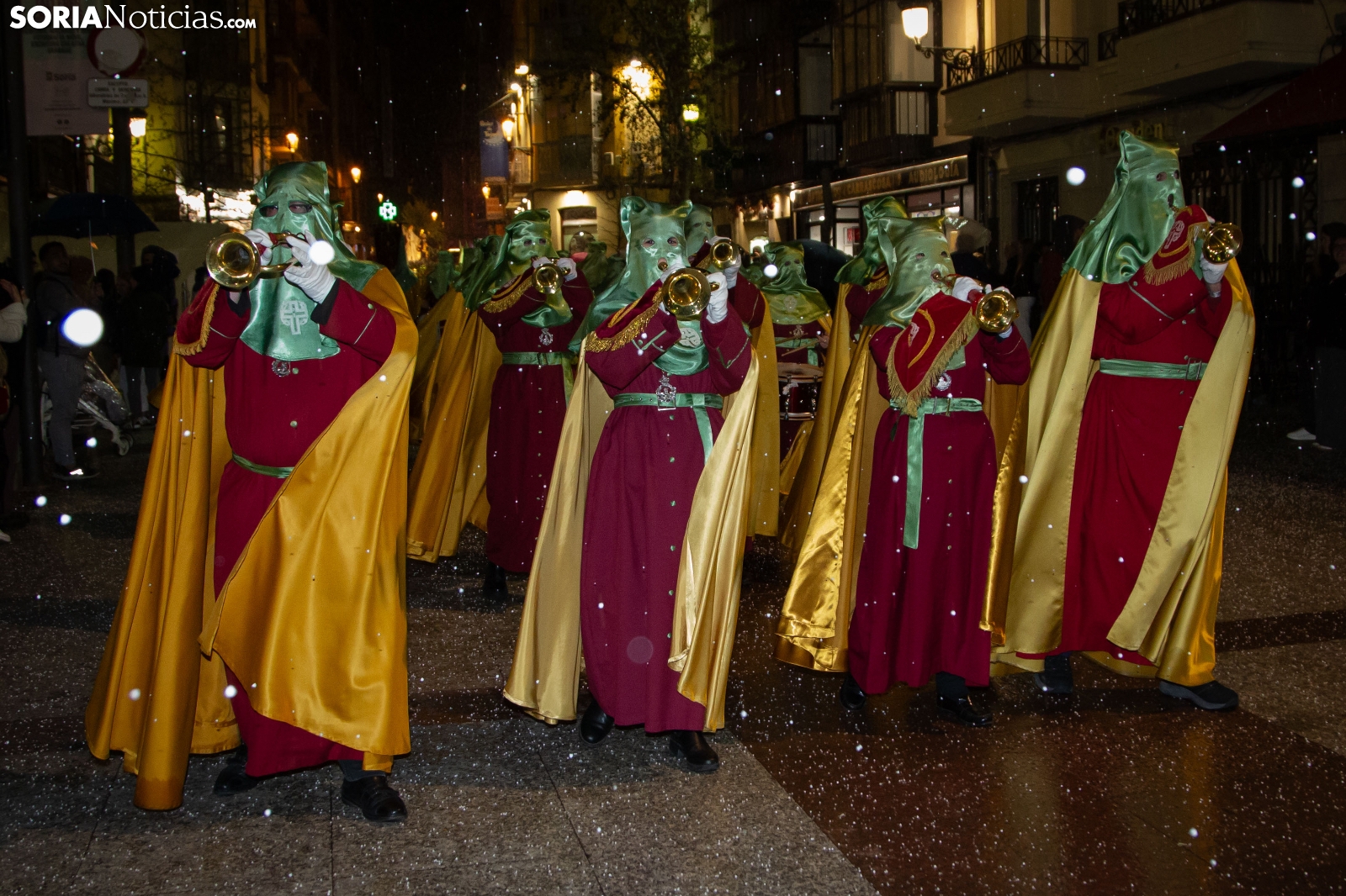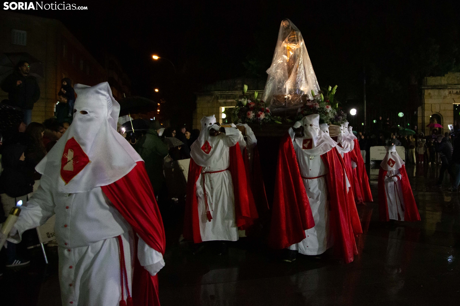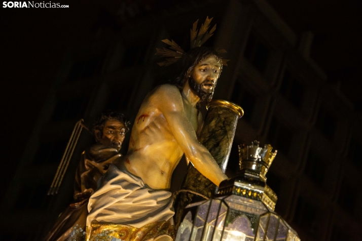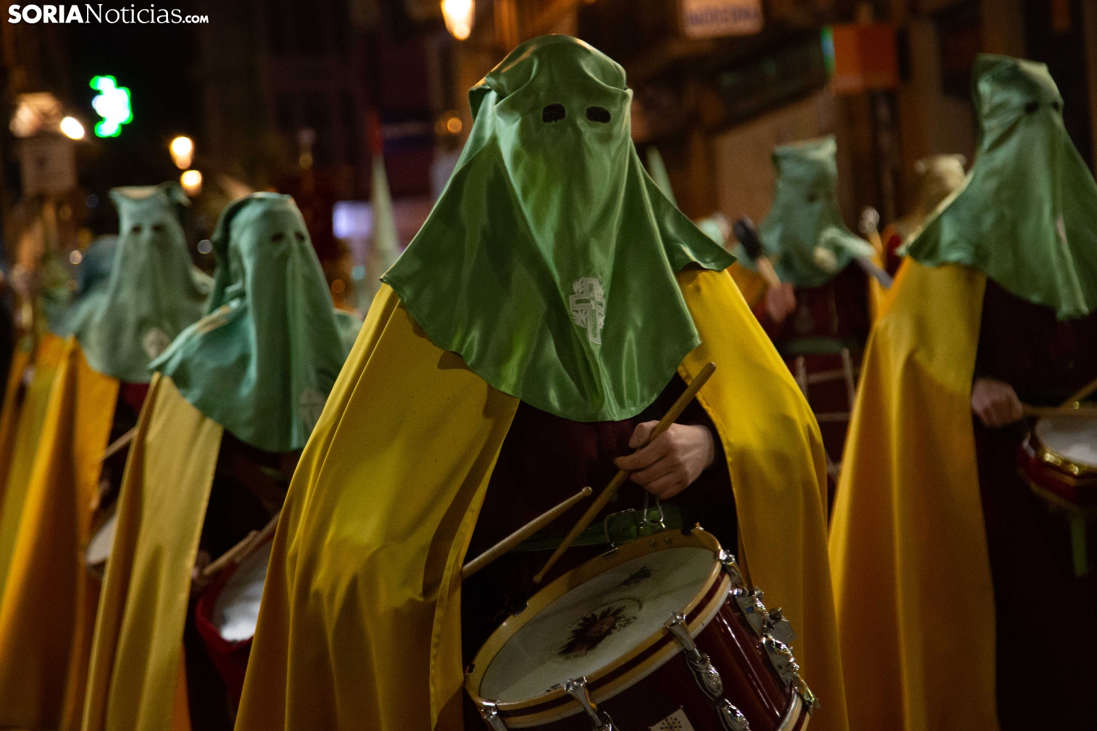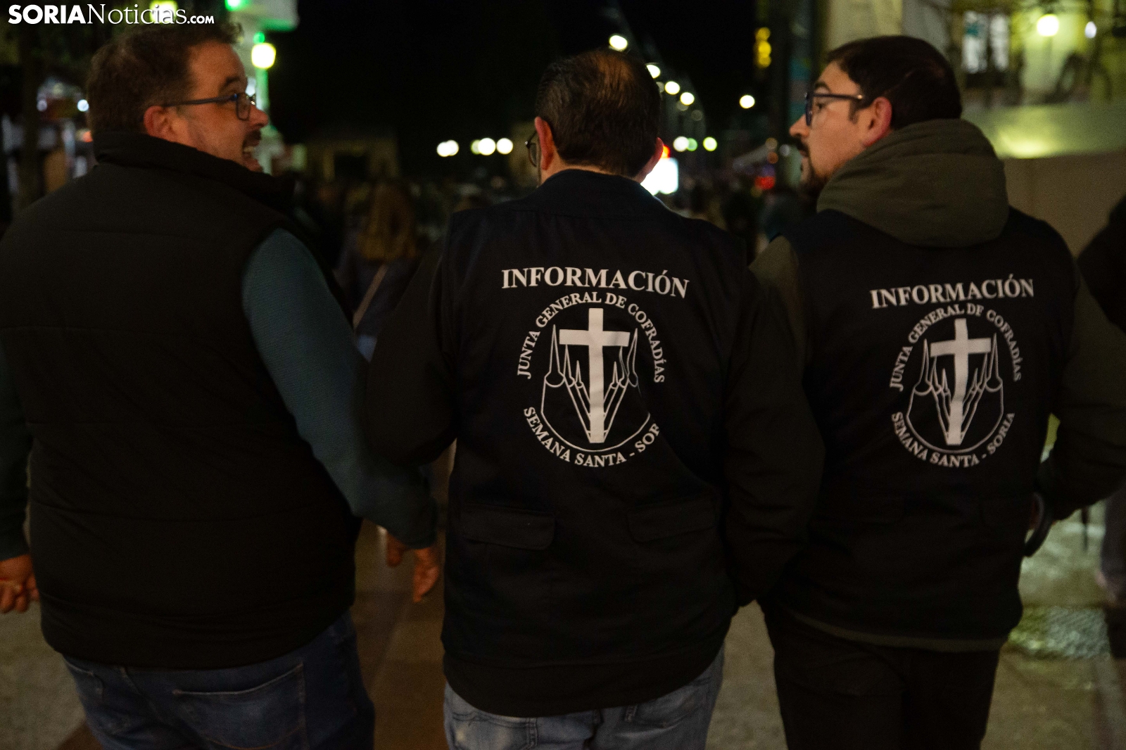 Aunque la lluvia, que había querido dar una pausa esta tarde de Martes Santo en la capital soriana, finalmente llegaba el granizo, precisamente avanzada ya la procesión. Las dos comitivas iniciales partían a las nueve de la noche del Espino y del Carmen con los ojos puestos en el cielo por parte de los integrantes de las cofradías de La Flagelación del Señor y de La Oración en el Huerto. Media hora después, ya en Mariano Granados, el granizo, intenso durante varios y largos minutos hacía extender los paraguas del público mientras que los cofrades aguantaban con estoicismo la borrasca. La procesión de hoy es siempre una de las manifestaciones de hermandad y de devoción que se hace patente con la reunión de ambos grupos en la céntrica plaza de la ciudad. Allí ha sido oficiado el saludo y abrazo solemne, como cada año, entre los hermanos mayores de ambas cofradías bajo el silencio, acallado por las bandas de percusión y de viento de los procesionantes que han encarado su camino, con intemperie poco favorable, hacia la concatedral de San Pedro.