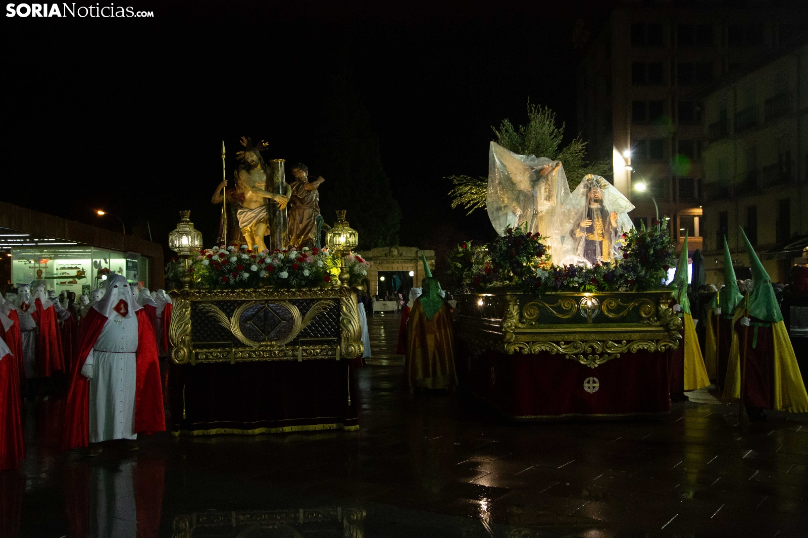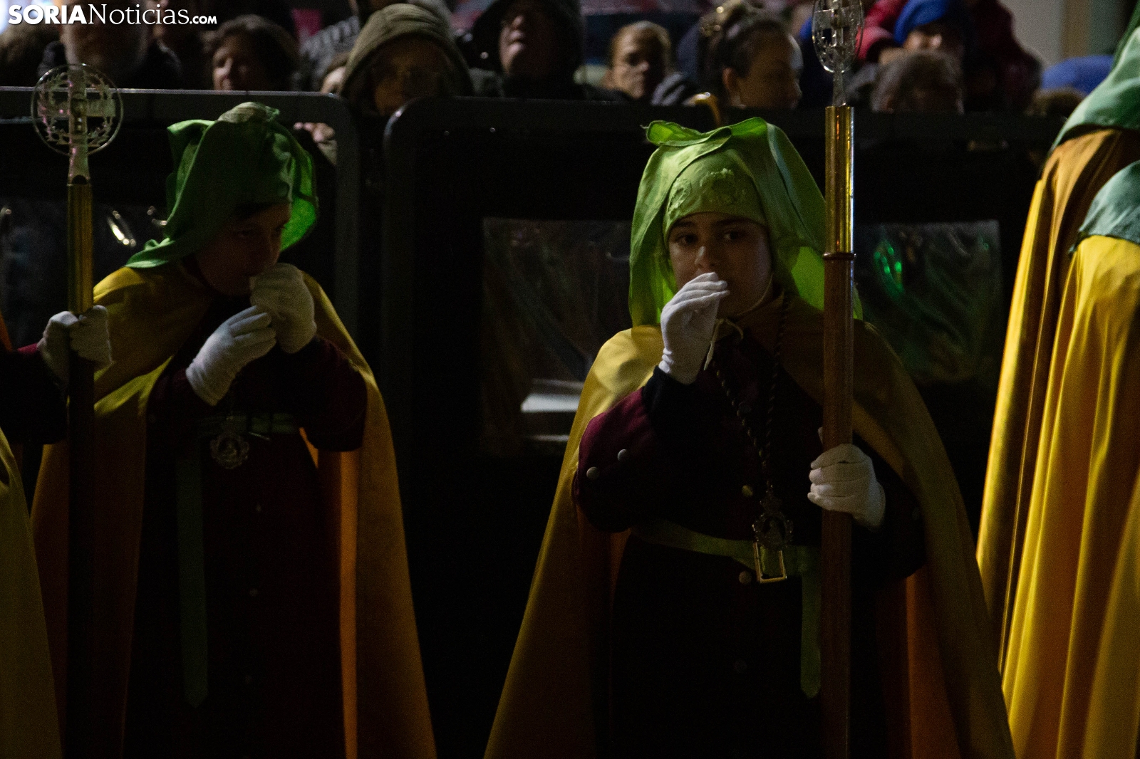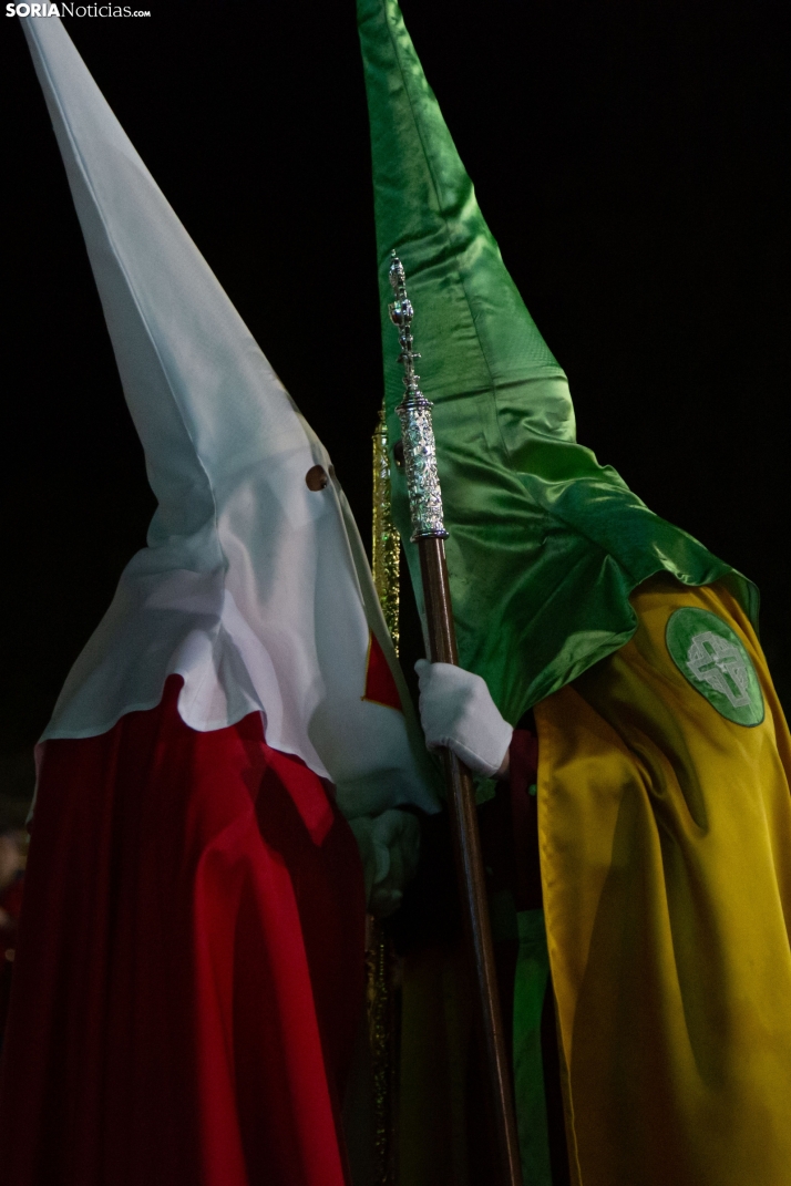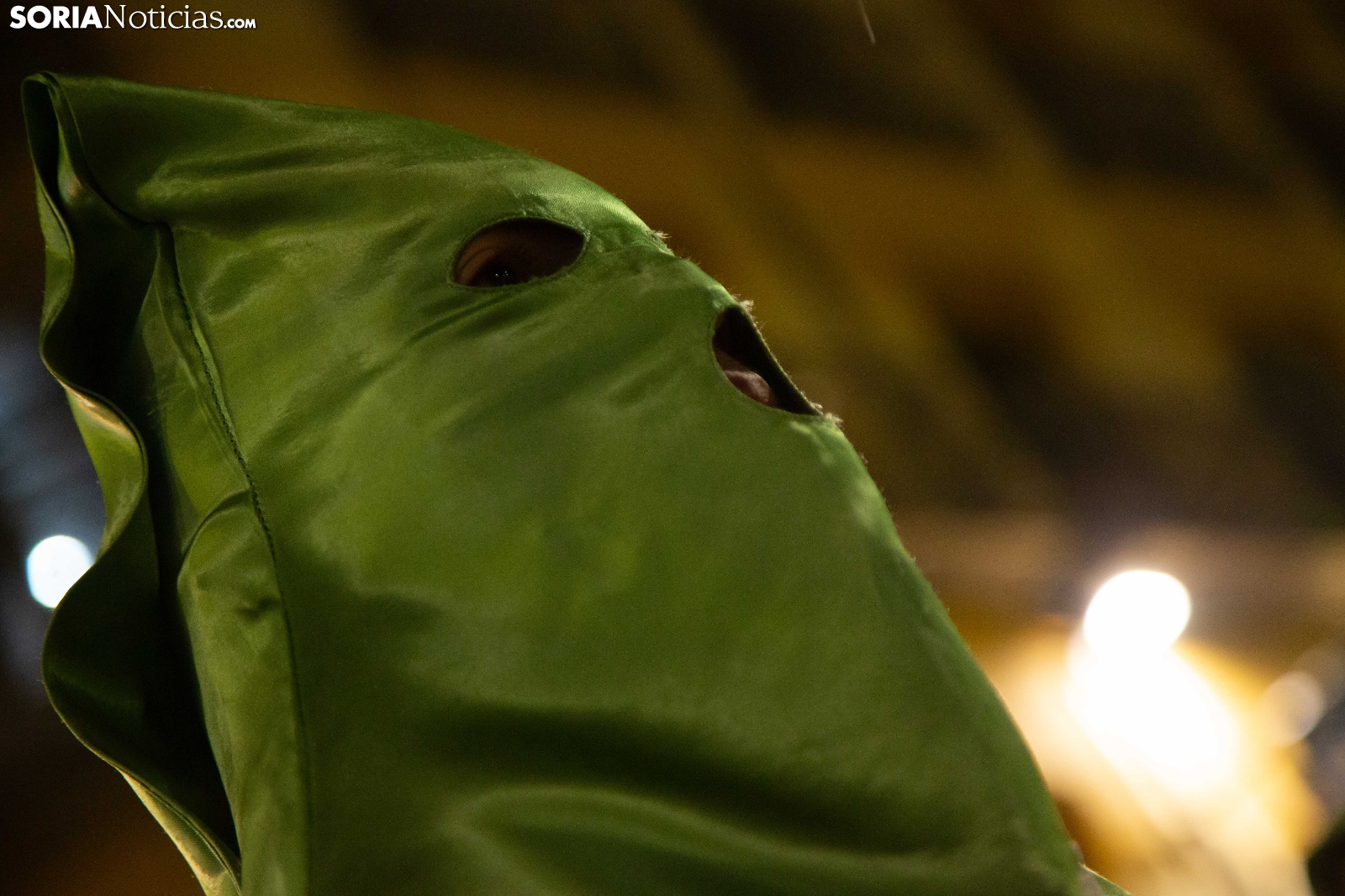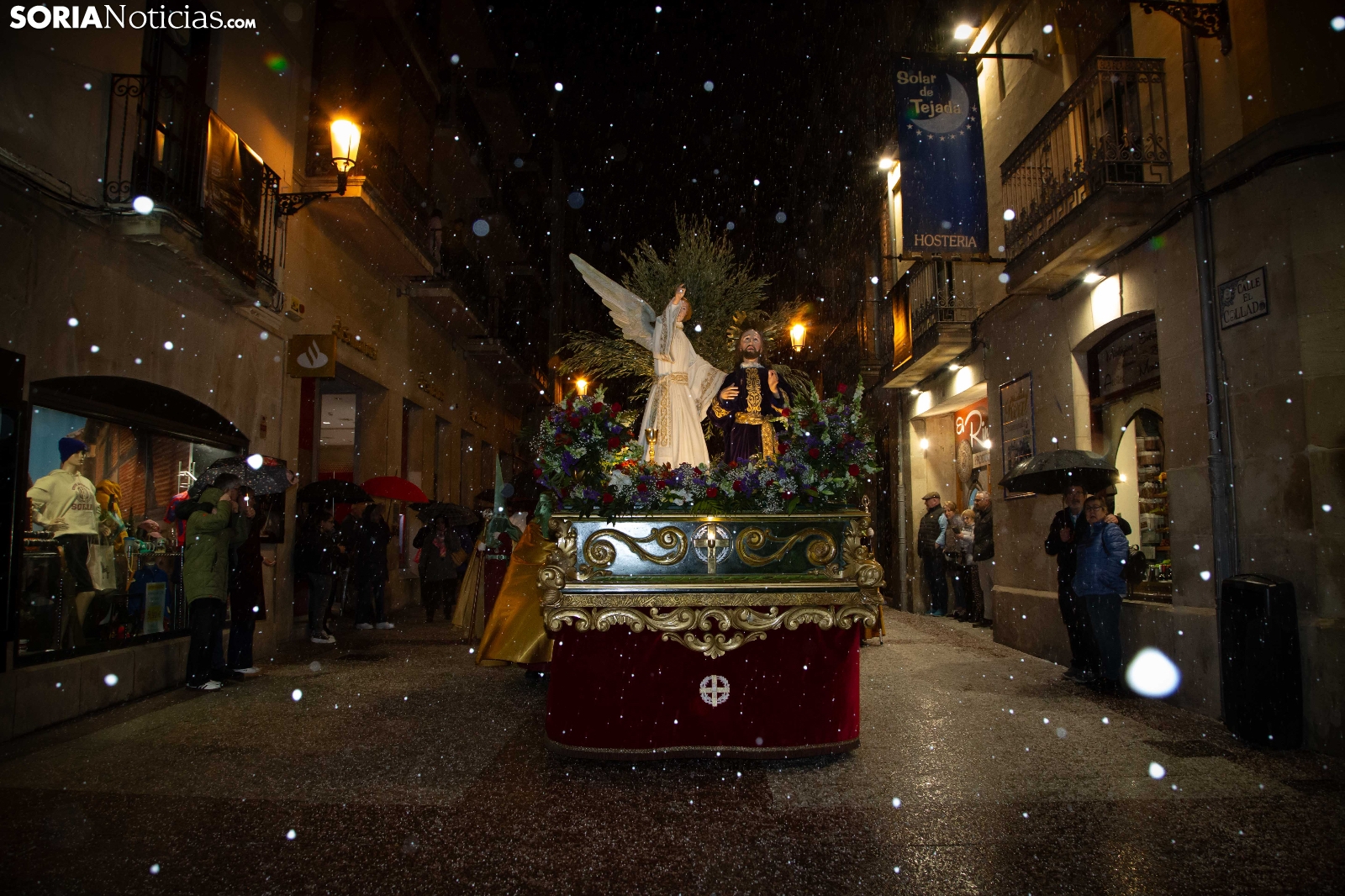 Aunque la lluvia, que había querido dar una pausa esta tarde de Martes Santo en la capital soriana, finalmente llegaba el granizo, precisamente avanzada ya la procesión. Las dos comitivas iniciales partían a las nueve de la noche del Espino y del Carmen con los ojos puestos en el cielo por parte de los integrantes de las cofradías de La Flagelación del Señor y de La Oración en el Huerto. Media hora después, ya en Mariano Granados, el granizo, intenso durante varios y largos minutos hacía extender los paraguas del público mientras que los cofrades aguantaban con estoicismo la borrasca. La procesión de hoy es siempre una de las manifestaciones de hermandad y de devoción que se hace patente con la reunión de ambos grupos en la céntrica plaza de la ciudad. Allí ha sido oficiado el saludo y abrazo solemne, como cada año, entre los hermanos mayores de ambas cofradías bajo el silencio, acallado por las bandas de percusión y de viento de los procesionantes que han encarado su camino, con intemperie poco favorable, hacia la concatedral de San Pedro.