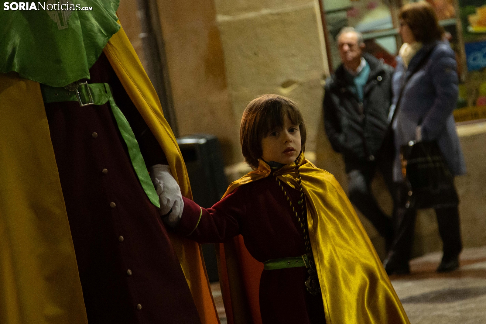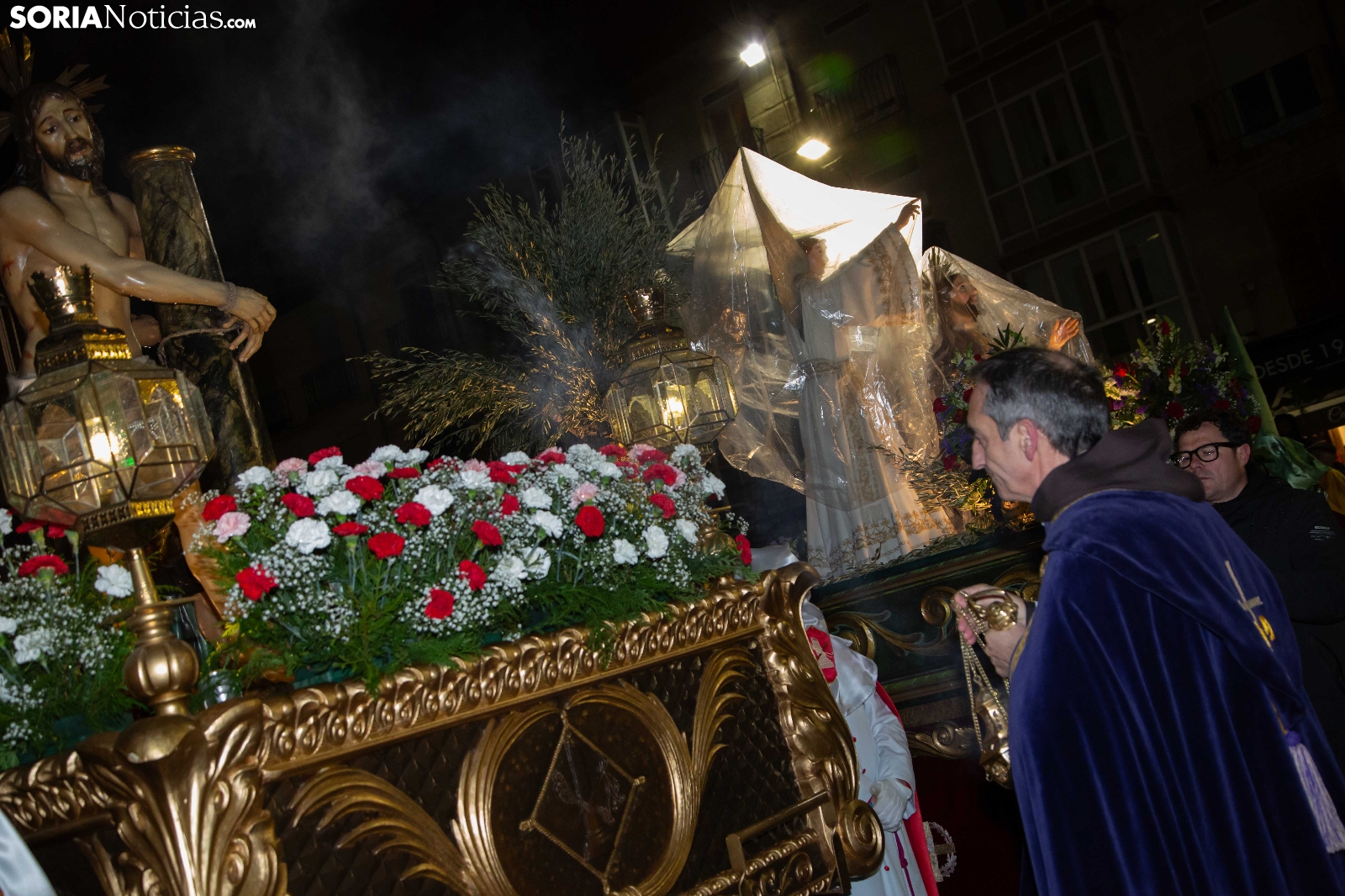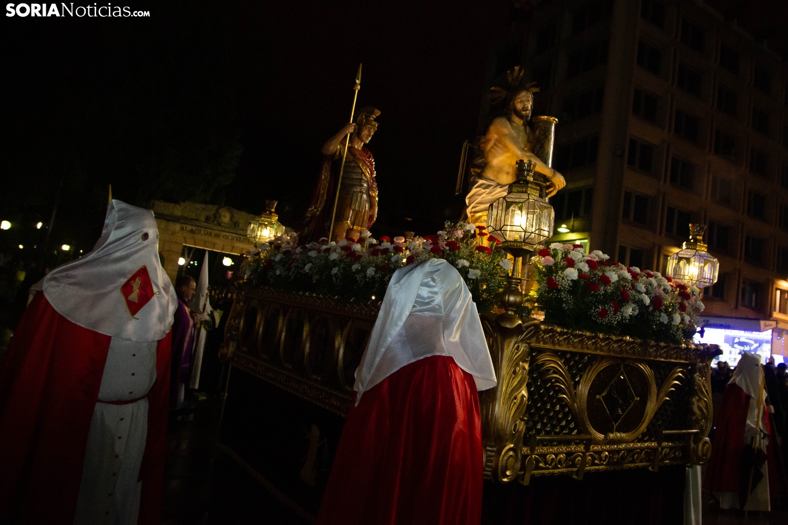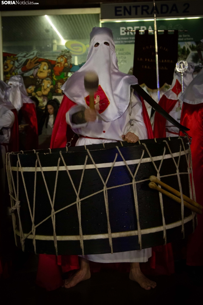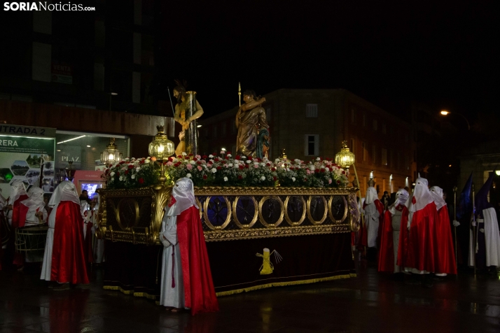 Aunque la lluvia, que había querido dar una pausa esta tarde de Martes Santo en la capital soriana, finalmente llegaba el granizo, precisamente avanzada ya la procesión. Las dos comitivas iniciales partían a las nueve de la noche del Espino y del Carmen con los ojos puestos en el cielo por parte de los integrantes de las cofradías de La Flagelación del Señor y de La Oración en el Huerto. Media hora después, ya en Mariano Granados, el granizo, intenso durante varios y largos minutos hacía extender los paraguas del público mientras que los cofrades aguantaban con estoicismo la borrasca. La procesión de hoy es siempre una de las manifestaciones de hermandad y de devoción que se hace patente con la reunión de ambos grupos en la céntrica plaza de la ciudad. Allí ha sido oficiado el saludo y abrazo solemne, como cada año, entre los hermanos mayores de ambas cofradías bajo el silencio, acallado por las bandas de percusión y de viento de los procesionantes que han encarado su camino, con intemperie poco favorable, hacia la concatedral de San Pedro.