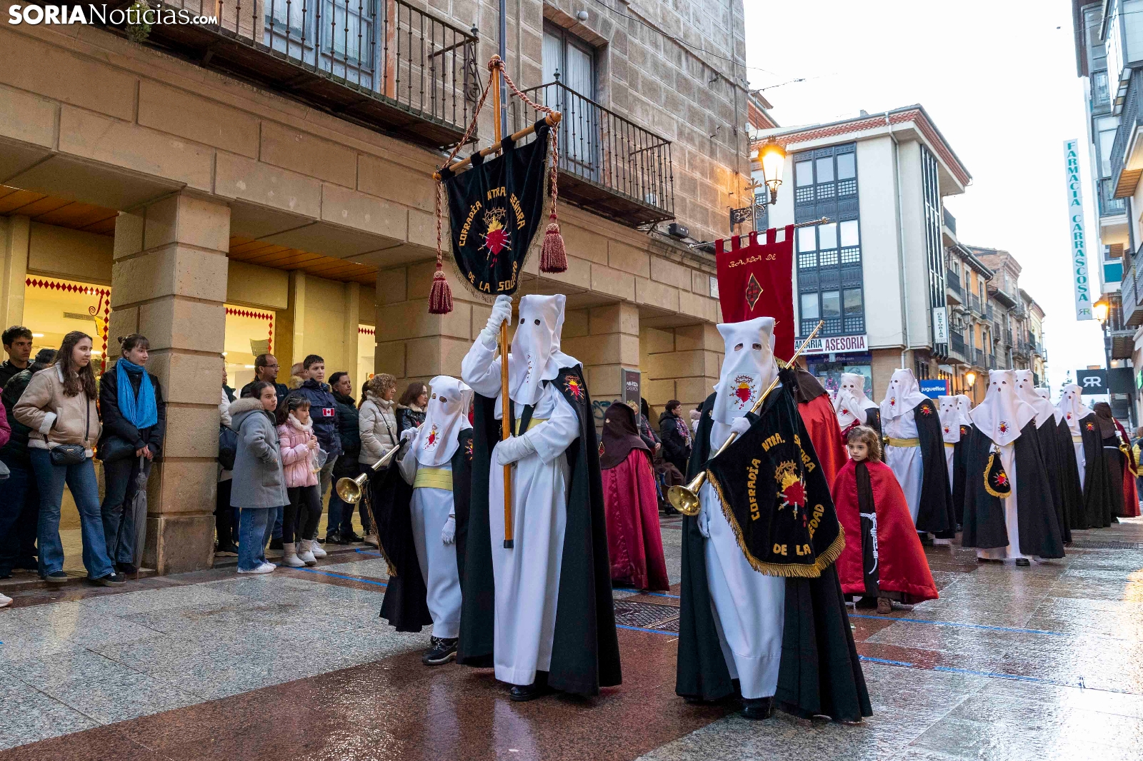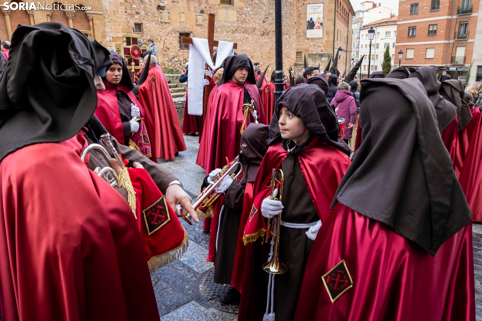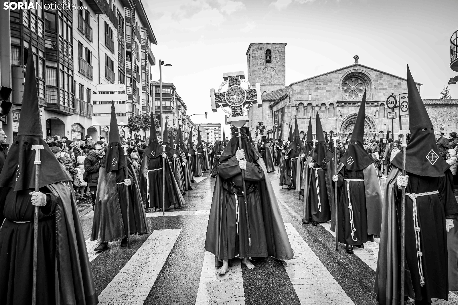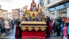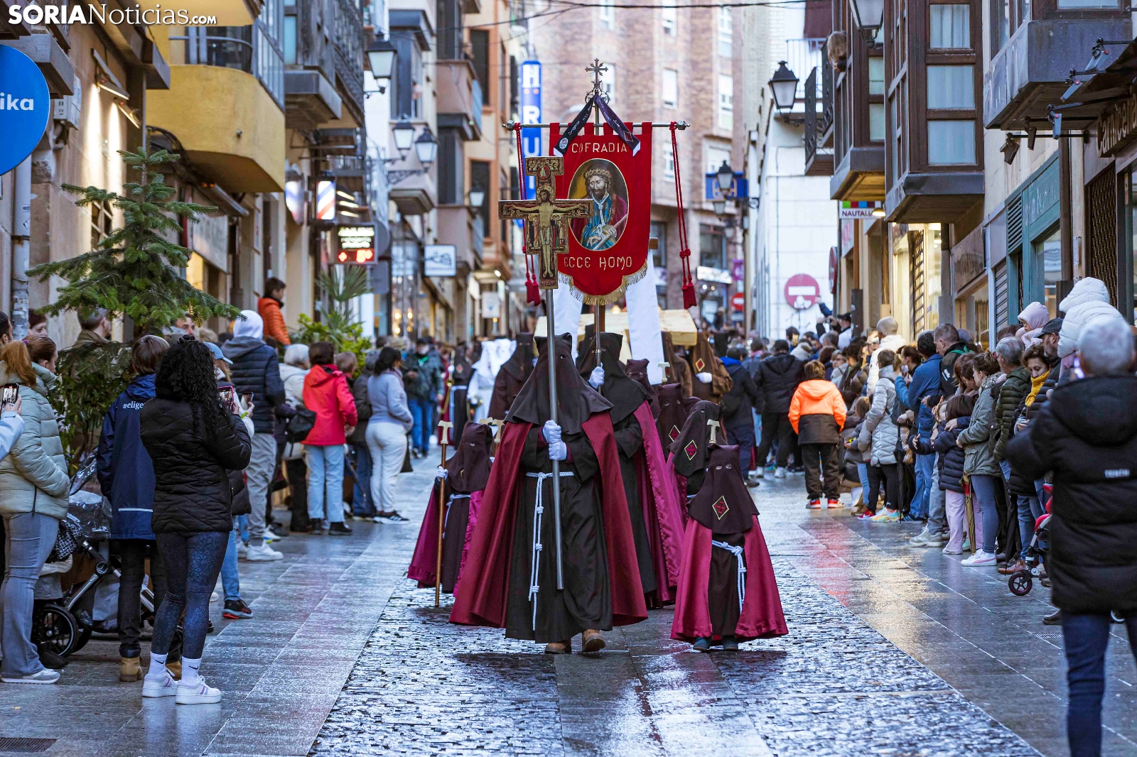 Este año, la cofradía del Ecce Homo cumple sus 75 años y lo hace de gala con el acto público y devocional que da razón a su nombre en lo que es la procesión del Miércoles Santo en la capital. Partiendo del templo de Santo Domingo, la comitiva comenzaba su recorrido con la mirada puesta en el cielo en una tarde más plúmbea que azul y con la amenaza de lluvia que mojaba algo, haciendo presencia un aire que corría algo frío. Este año, además, la hermandad ha procesionado por primera vez una imagen que es réplica de la talla titular, preservándola y de manera acorde a los tiempos. Sea como fuere, el acto ha discurrido con la solemnidad que le caracteriza por el centro de la ciudad, eso sí, silenciado los instrumentos de percusión y viento en un tramo de la calle El Collado para que personas con trastorno del espectro autista pudieran contemplar el paso de la ceremonia.