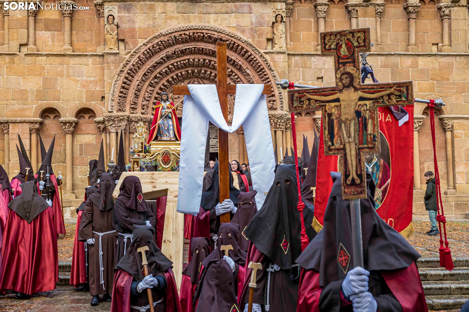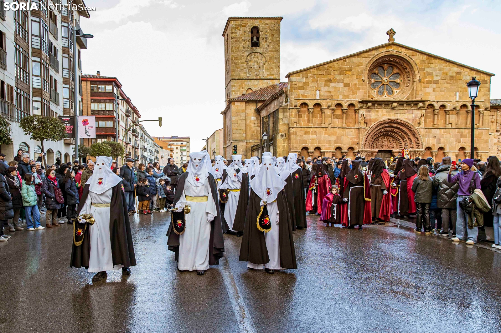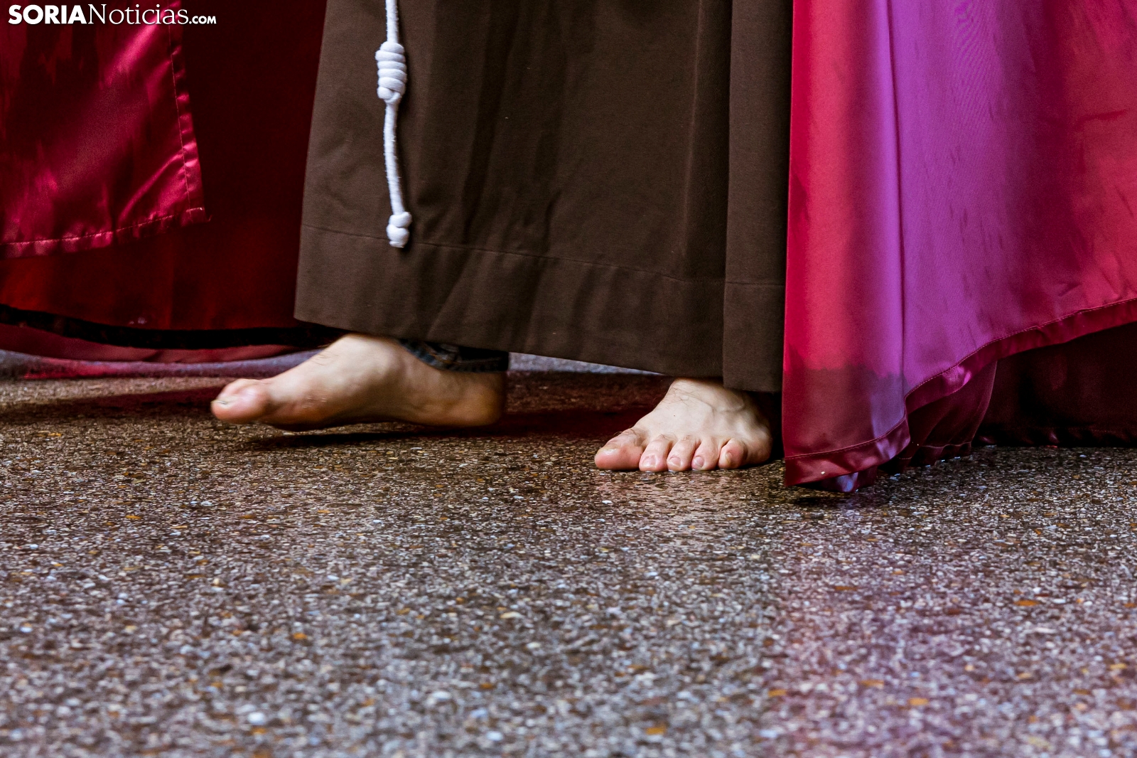 Este año, la cofradía del Ecce Homo cumple sus 75 años y lo hace de gala con el acto público y devocional que da razón a su nombre en lo que es la procesión del Miércoles Santo en la capital. Partiendo del templo de Santo Domingo, la comitiva comenzaba su recorrido con la mirada puesta en el cielo en una tarde más plúmbea que azul y con la amenaza de lluvia que mojaba algo, haciendo presencia un aire que corría algo frío. Este año, además, la hermandad ha procesionado por primera vez una imagen que es réplica de la talla titular, preservándola y de manera acorde a los tiempos. Sea como fuere, el acto ha discurrido con la solemnidad que le caracteriza por el centro de la ciudad, eso sí, silenciado los instrumentos de percusión y viento en un tramo de la calle El Collado para que personas con trastorno del espectro autista pudieran contemplar el paso de la ceremonia.