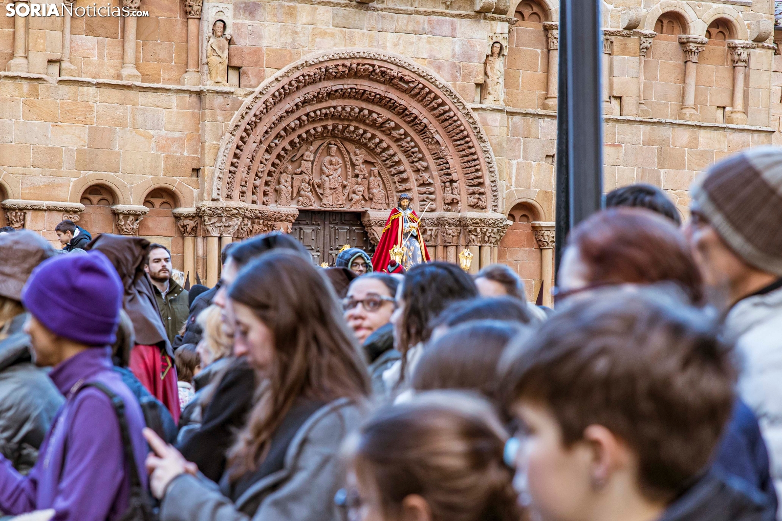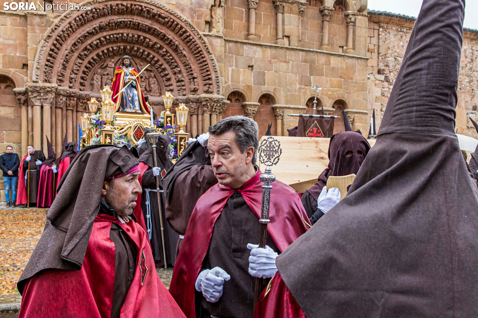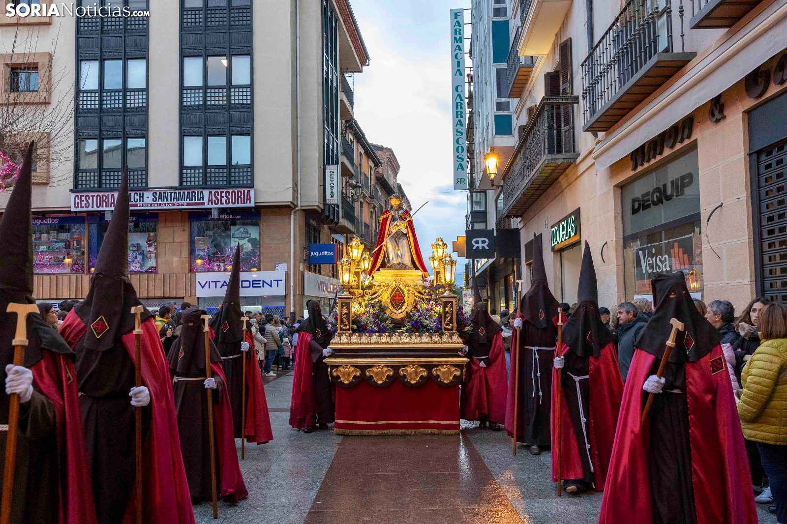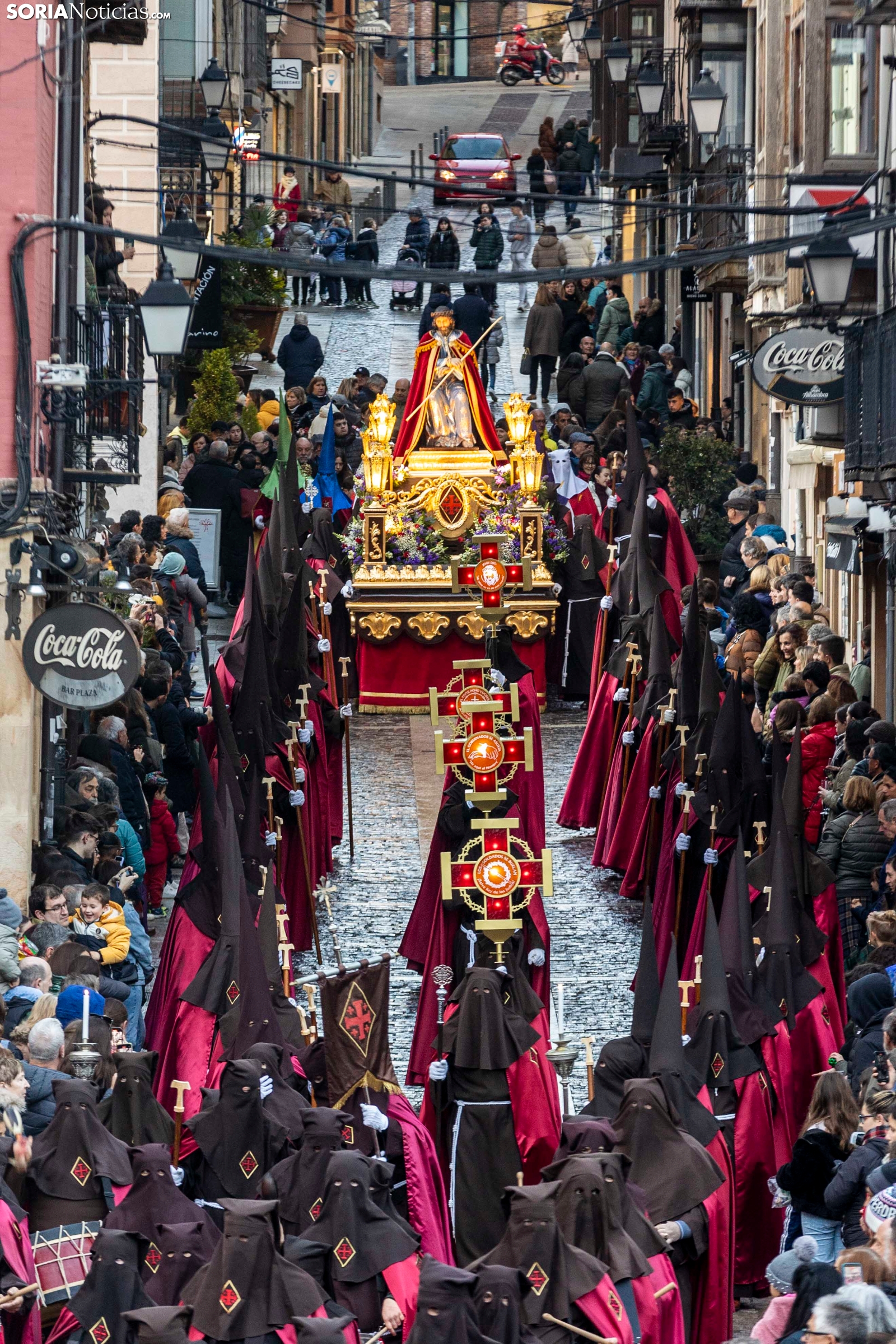 Este año, la cofradía del Ecce Homo cumple sus 75 años y lo hace de gala con el acto público y devocional que da razón a su nombre en lo que es la procesión del Miércoles Santo en la capital. Partiendo del templo de Santo Domingo, la comitiva comenzaba su recorrido con la mirada puesta en el cielo en una tarde más plúmbea que azul y con la amenaza de lluvia que mojaba algo, haciendo presencia un aire que corría algo frío. Este año, además, la hermandad ha procesionado por primera vez una imagen que es réplica de la talla titular, preservándola y de manera acorde a los tiempos. Sea como fuere, el acto ha discurrido con la solemnidad que le caracteriza por el centro de la ciudad, eso sí, silenciado los instrumentos de percusión y viento en un tramo de la calle El Collado para que personas con trastorno del espectro autista pudieran contemplar el paso de la ceremonia.