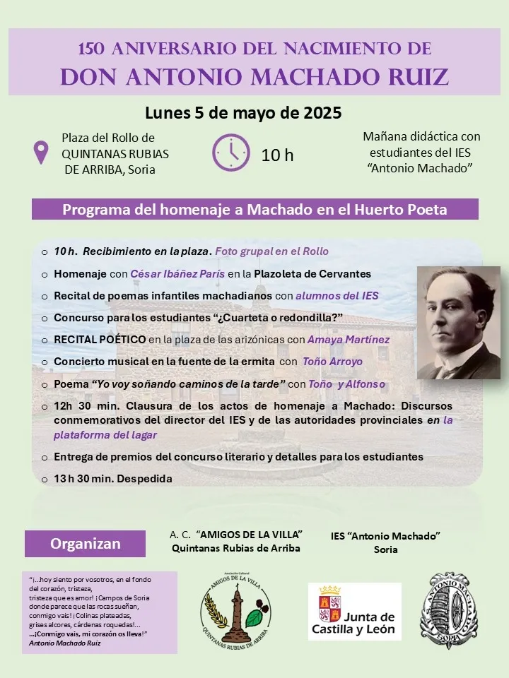 El próximo lunes 5 de mayo de 2025, la localidad de Quintanas Rubias de Arriba celebrará el 150 aniversario del nacimiento de Don Antonio Machado Ruiz con una jornada especial. A partir de las 10:00 h, la Plaza del Rollo será el punto de partida de una mañana didáctica y cultural diseñada especialmente para los estudiantes del IES 'Antonio Machado' de Soria, pero abierta a toda la comunidad. Esta iniciativa busca honrar la memoria del poeta y su profundo vínculo con tierras sorianas.