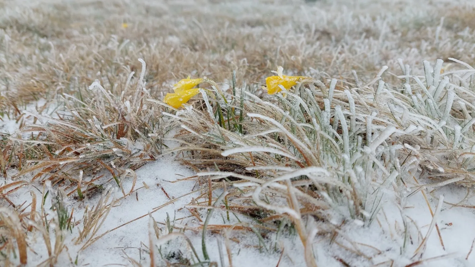 Los pequeños narcisos silvestres que han brotado con fuerza en cumbres de Urbión, se congelan.
