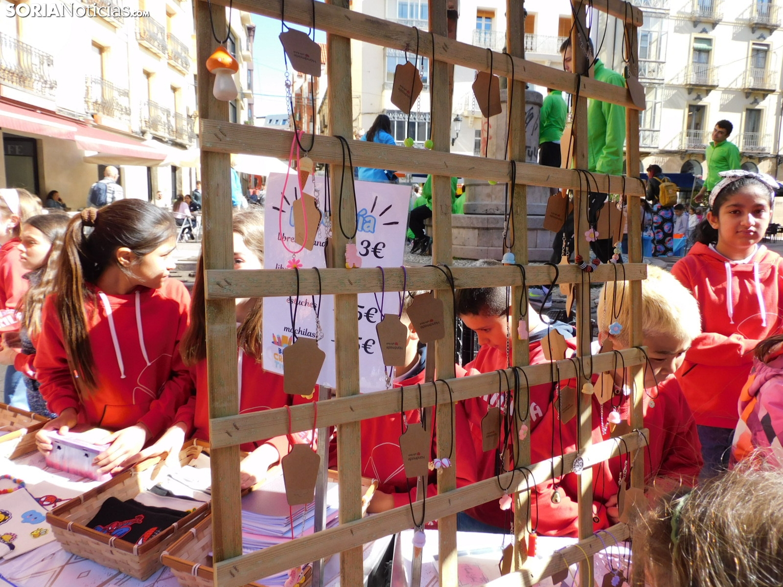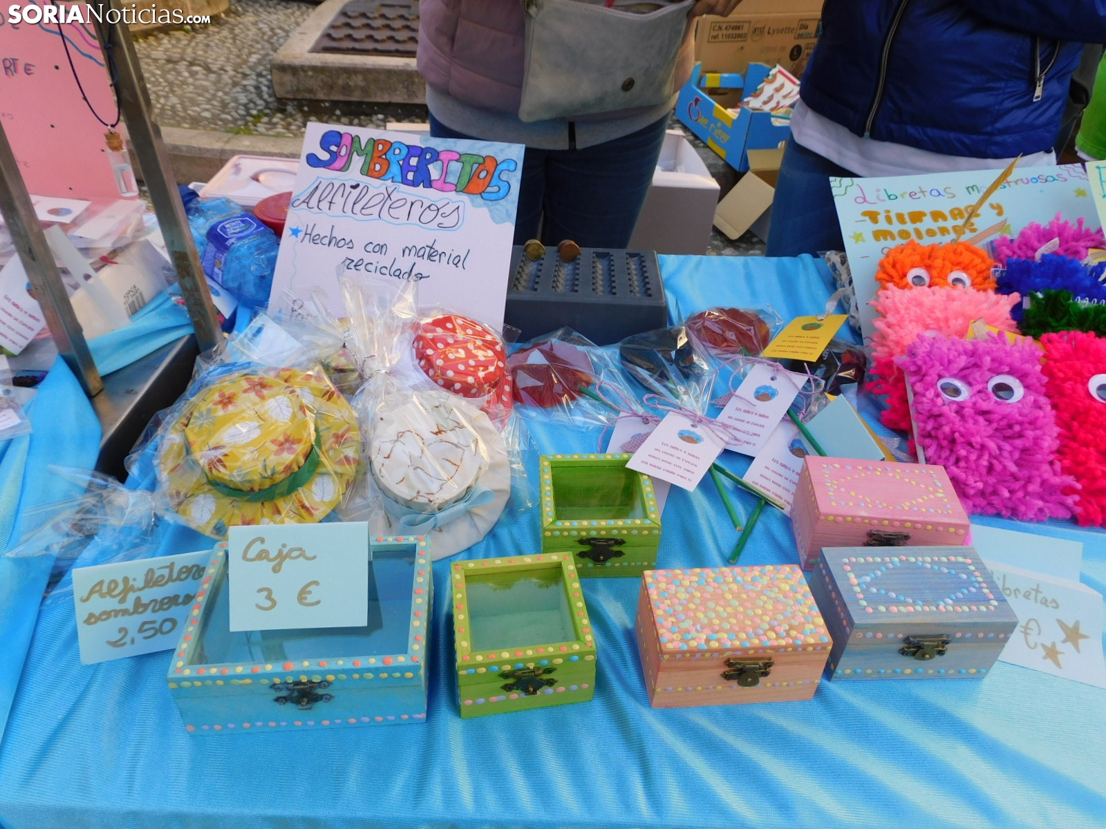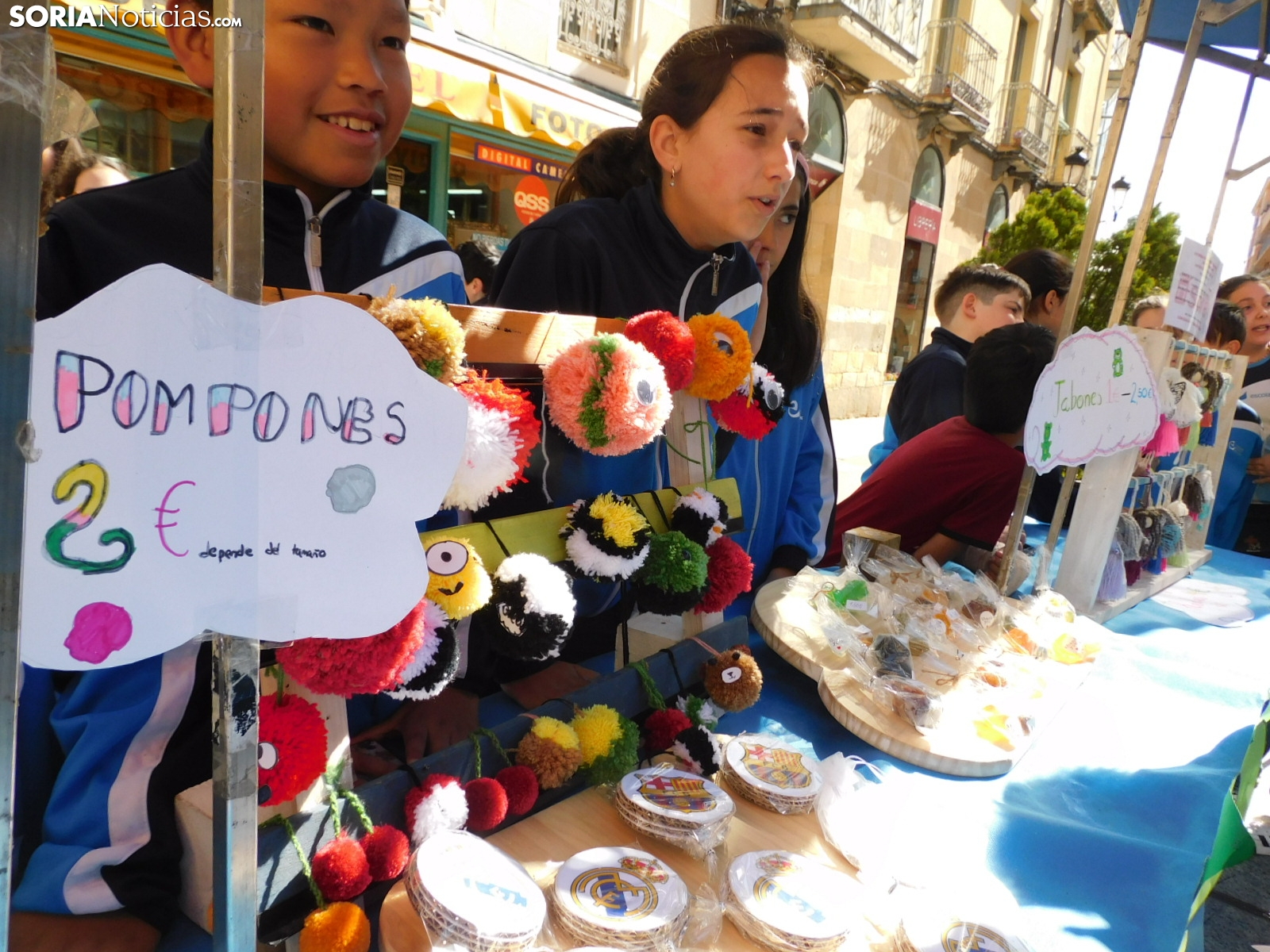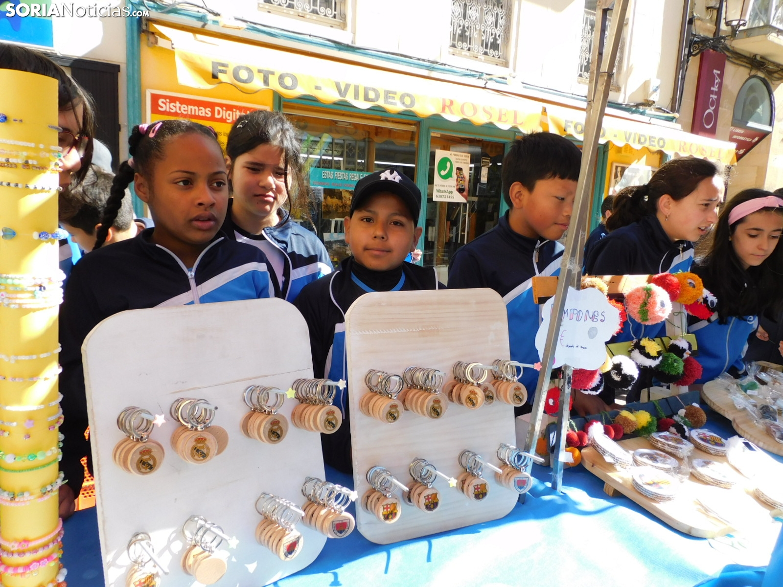 Llaveros, plantas, neceseres, camisetas… Una amplia variedad de productos elaborados a mano se han puesto a la venta esta mañana en la plaza del Rosel y San Blas. Se trata del mercadillo anual que organizan ocho centros educativos de Soria capital y provincia, con la participación de 250 alumnos de quinto y sexto de Primaria.