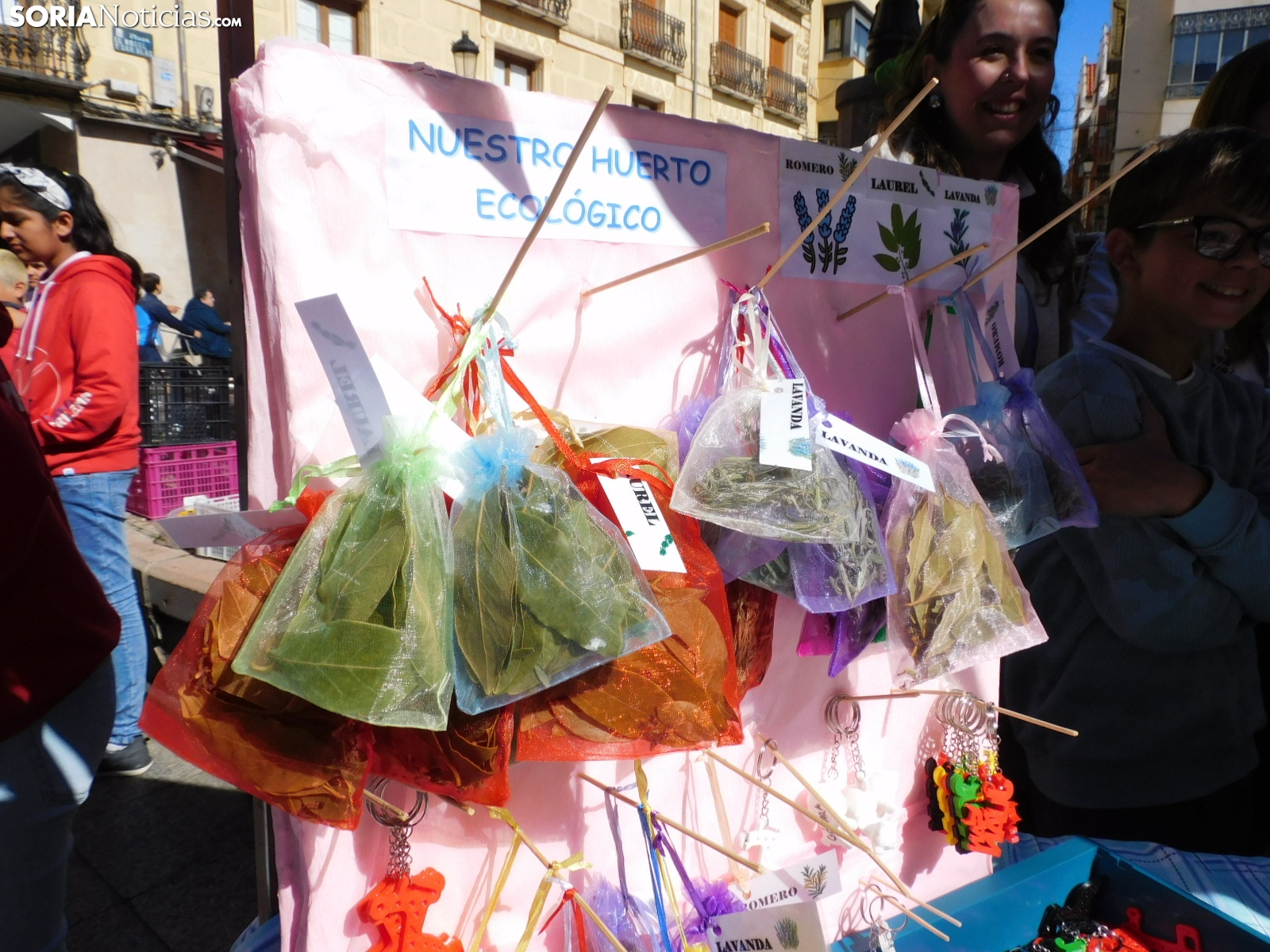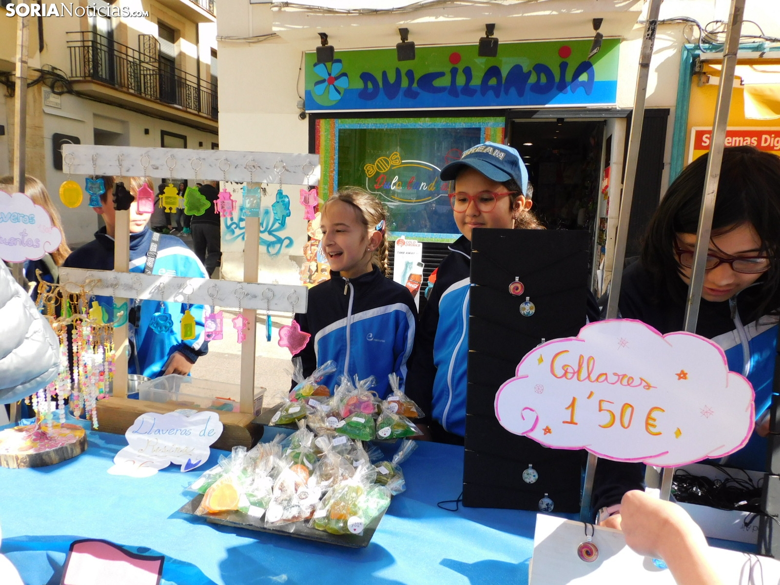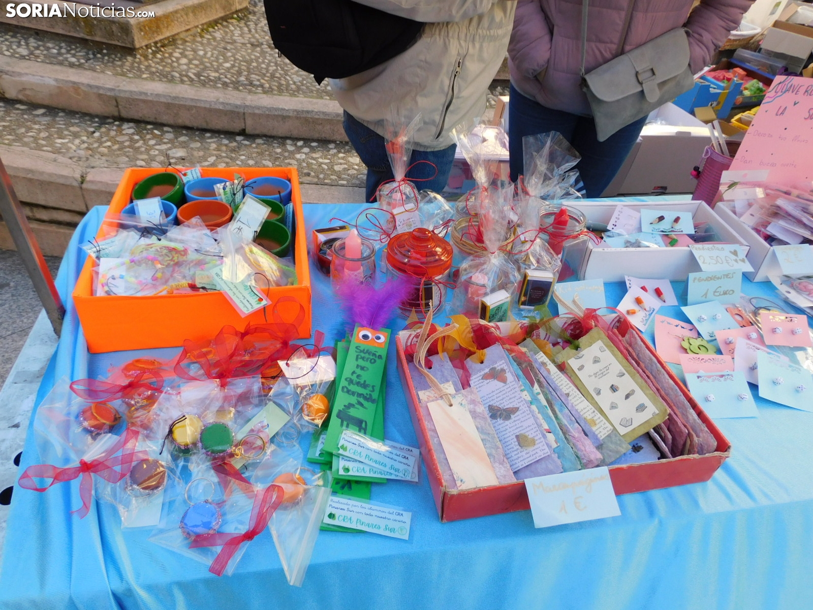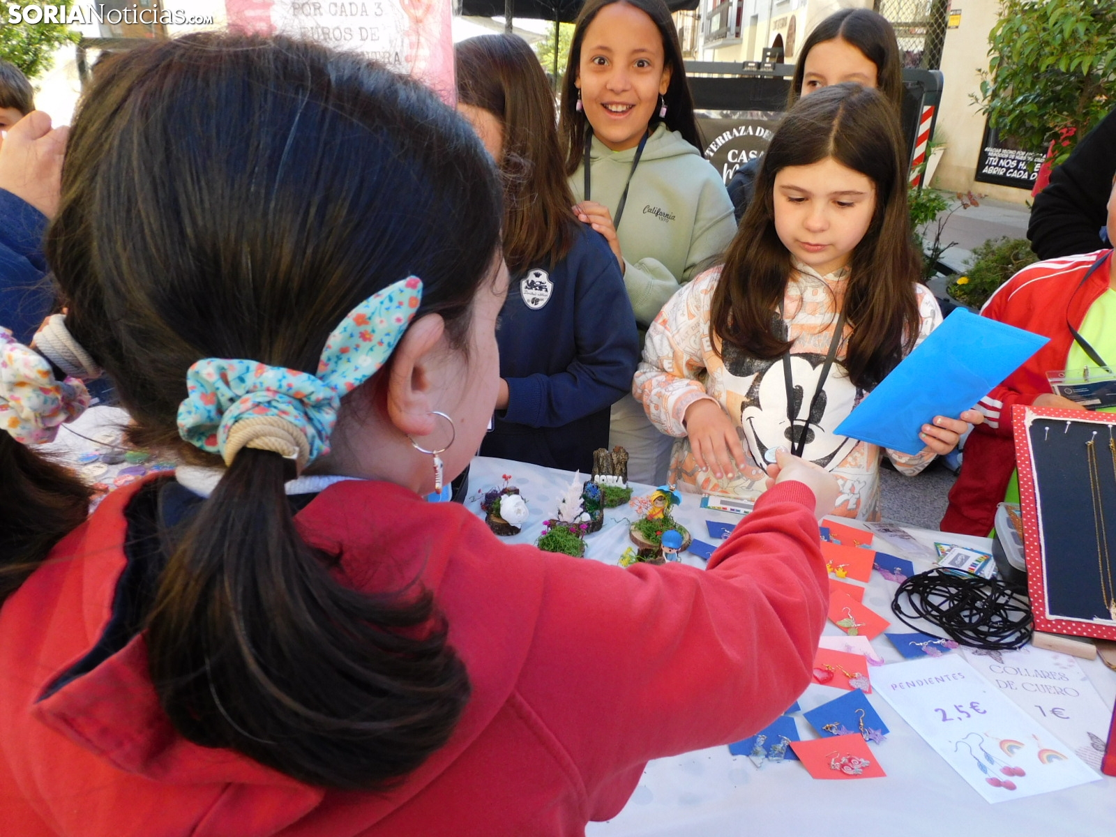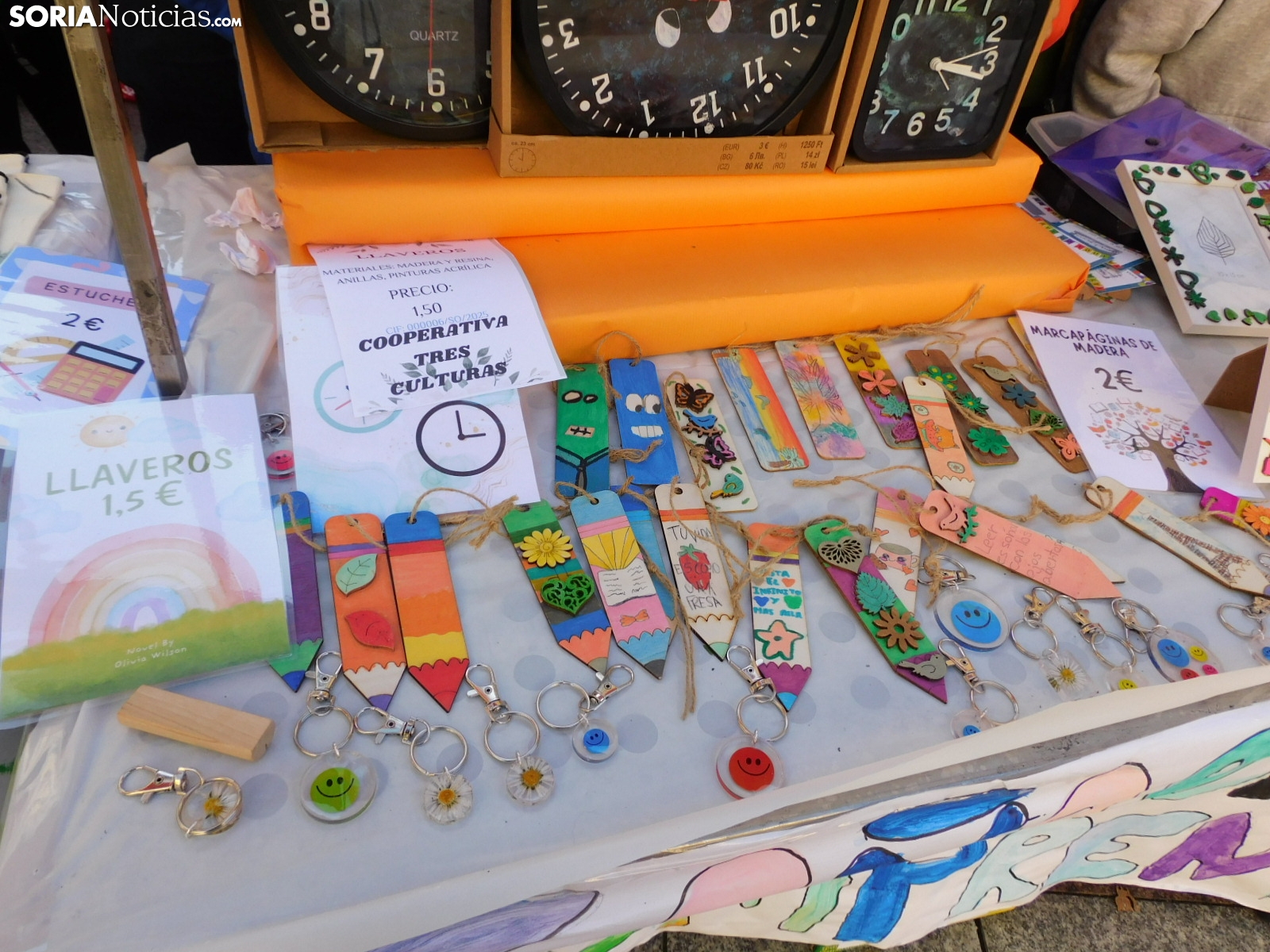 Llaveros, plantas, neceseres, camisetas… Una amplia variedad de productos elaborados a mano se han puesto a la venta esta mañana en la plaza del Rosel y San Blas. Se trata del mercadillo anual que organizan ocho centros educativos de Soria capital y provincia, con la participación de 250 alumnos de quinto y sexto de Primaria.