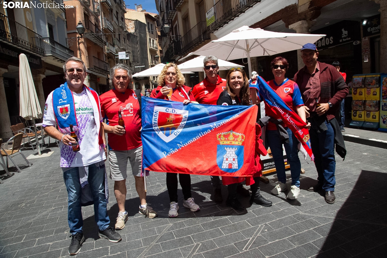 La emoción se traslada este sábado a Teruel, donde se disputa el partido de ida de la final del play off de ascenso. Los numantinos ya han tomado la ciudad con sus camisetas rojas y la plaza del Torico transpira un excelente ambiente.