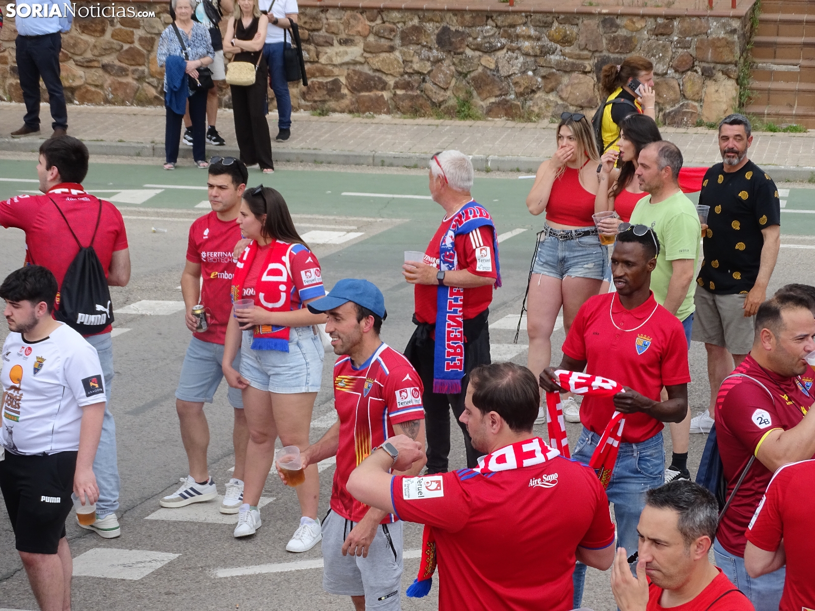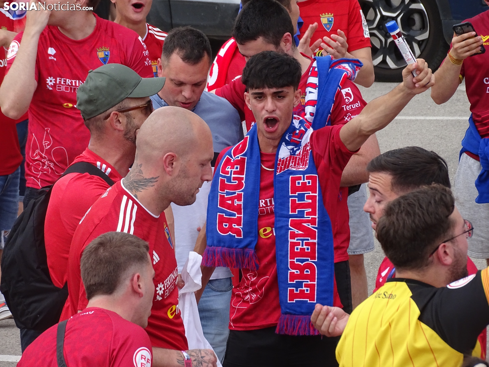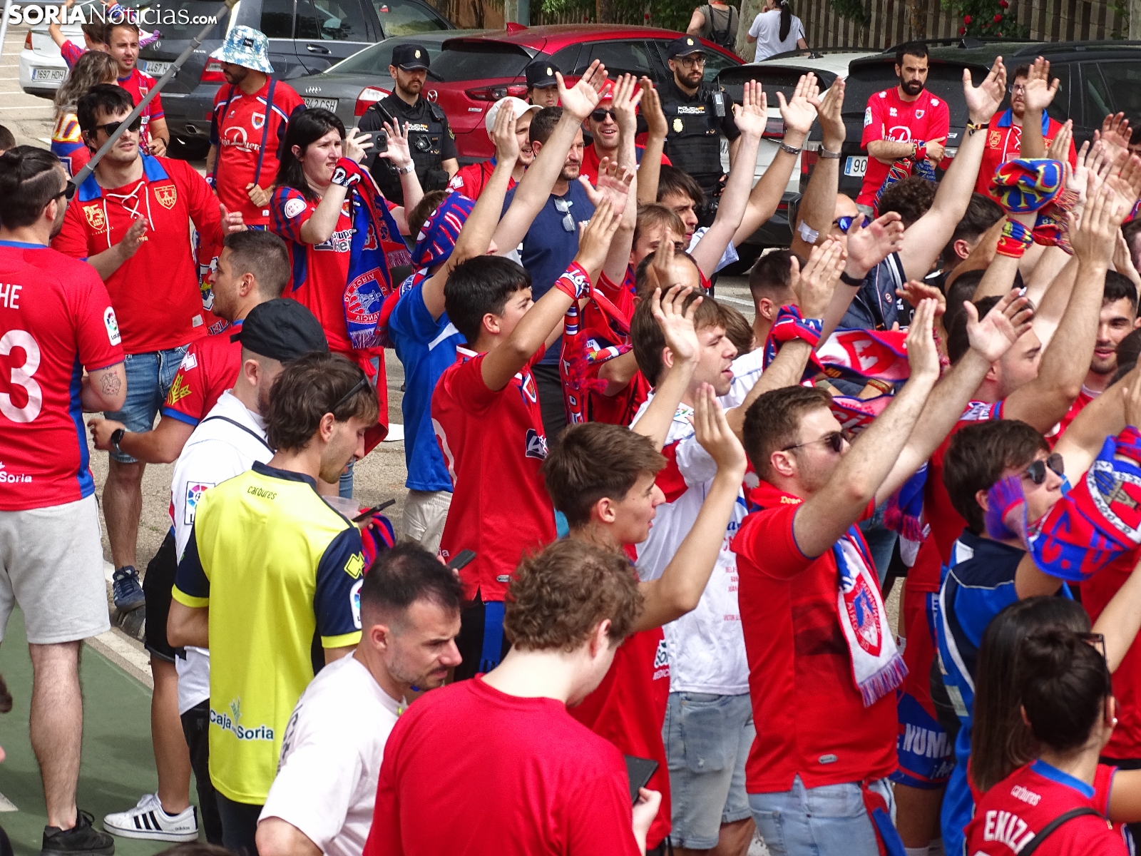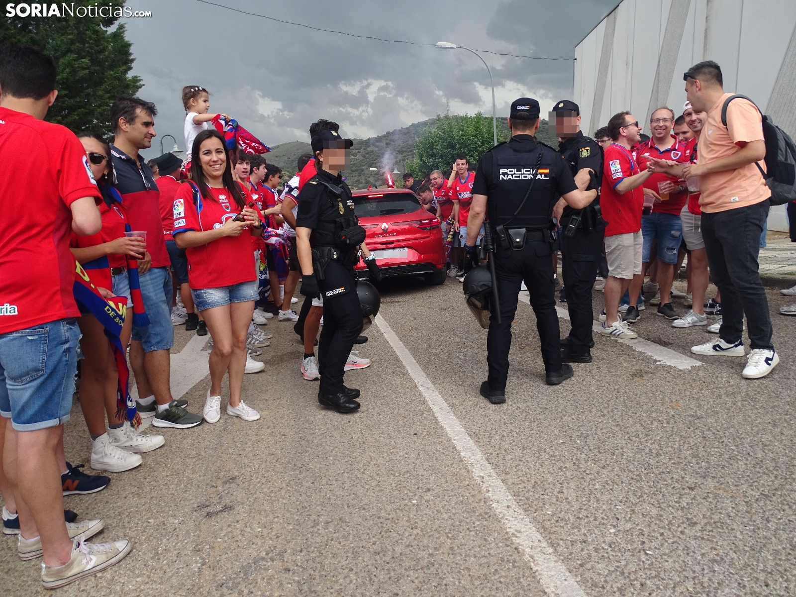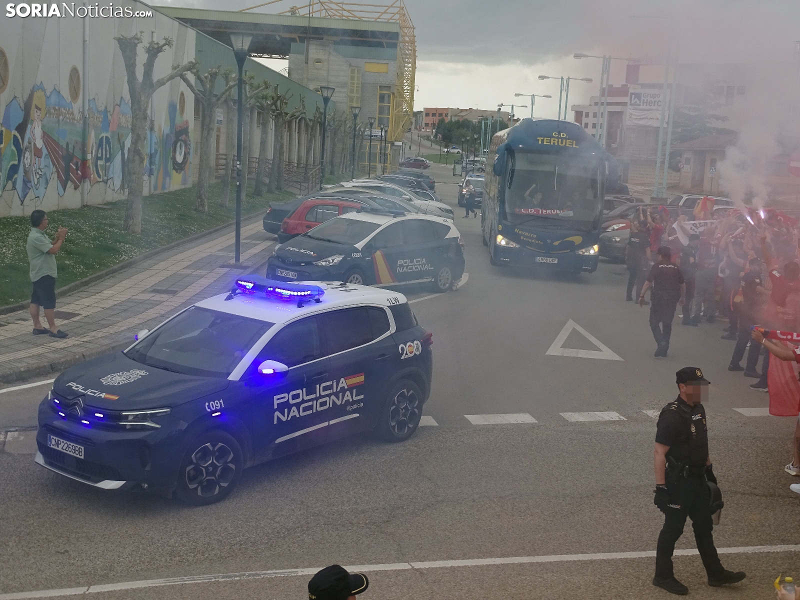 A escasos minutos de comenzar el partido entre el CD Numancia y el CD Teruel, las aficiones de ambos equipos se concentraban para dar ánimo a los suyos. Ambiente muy animado en las dos partes, convenientemente separadas, con el color rojo en común en sus indumentarias y buen hacer de los agentes de la Policía Nacional, apoyados por compañeros de la Municipal. Bengalas, himnos y arengas, con percusiones y megafonías incluidas, han hecho acto de presencia a la llegada de los jugadores. Los primeros desembarcaban en autobús. Por parte soriana acudían a pie o en sus propios vehículos. Todo indica que el encuentro, a las seis, en el que las dos escuadras se juegan el ascenso a 1.ª RFEF, hará vibrar las gradas y caldear ánimos con altas temperaturas en los corazones de locales y visitantes.