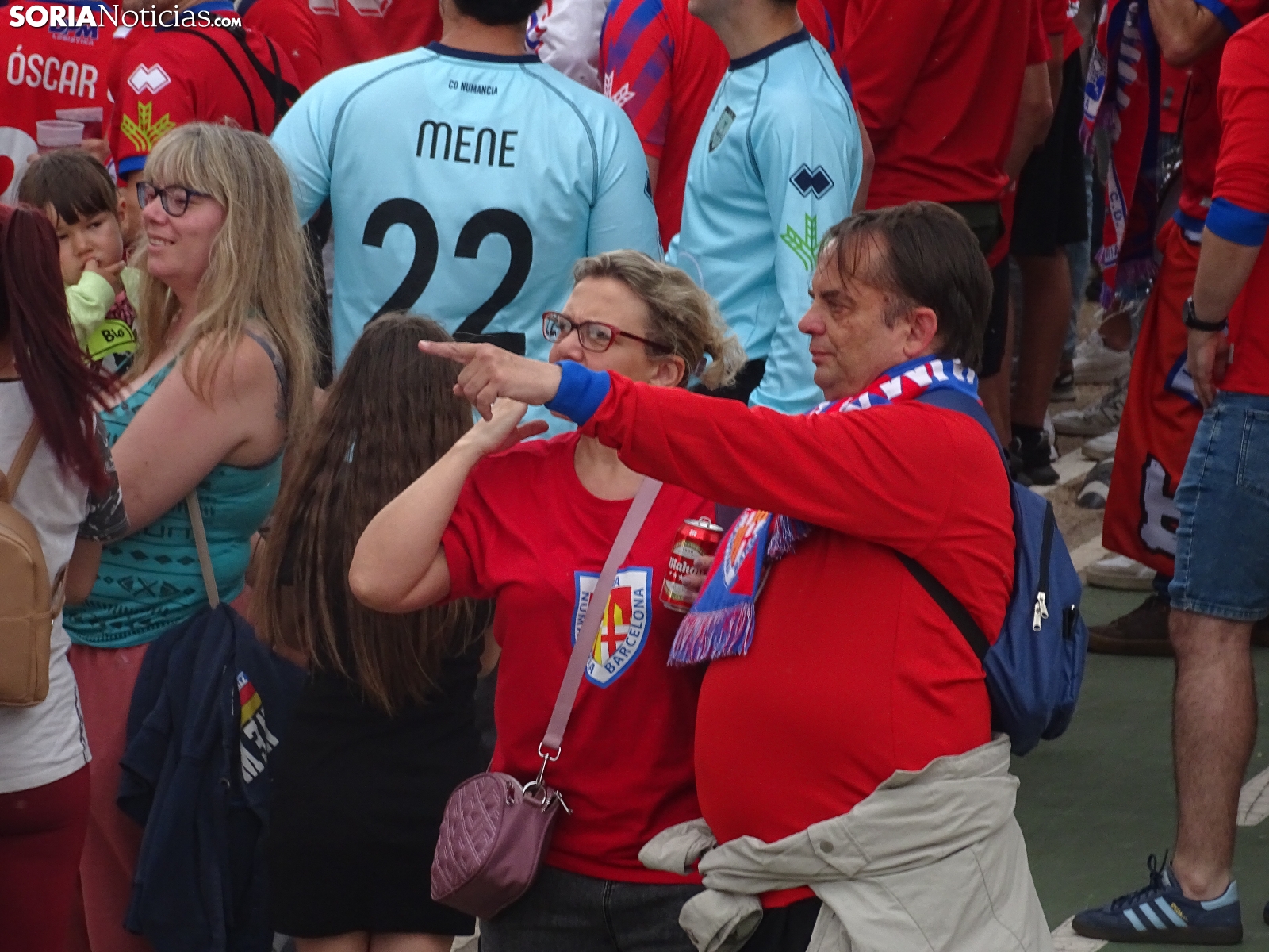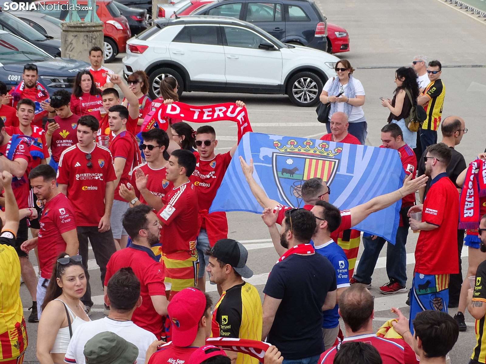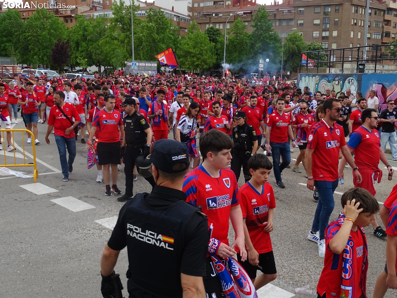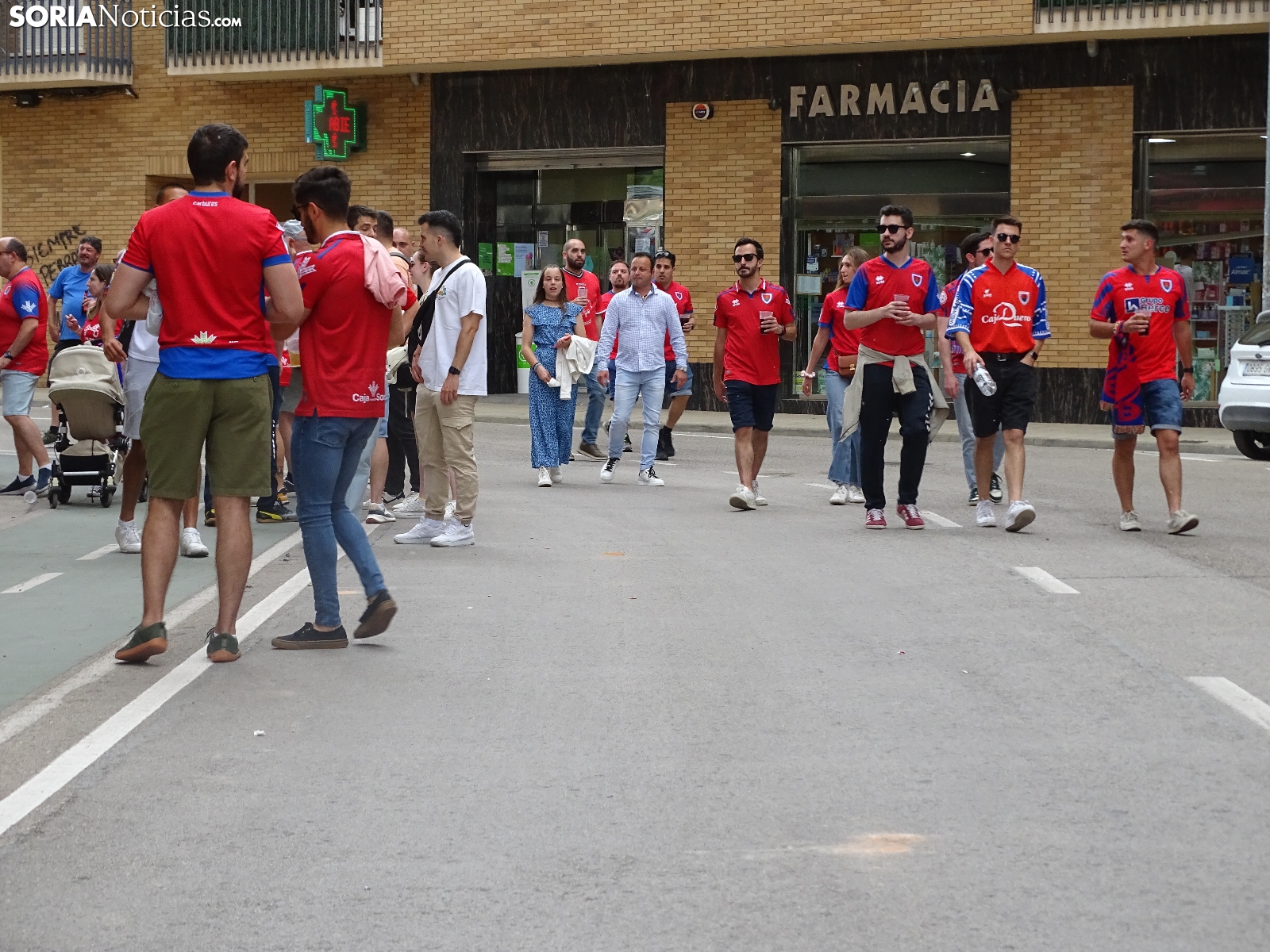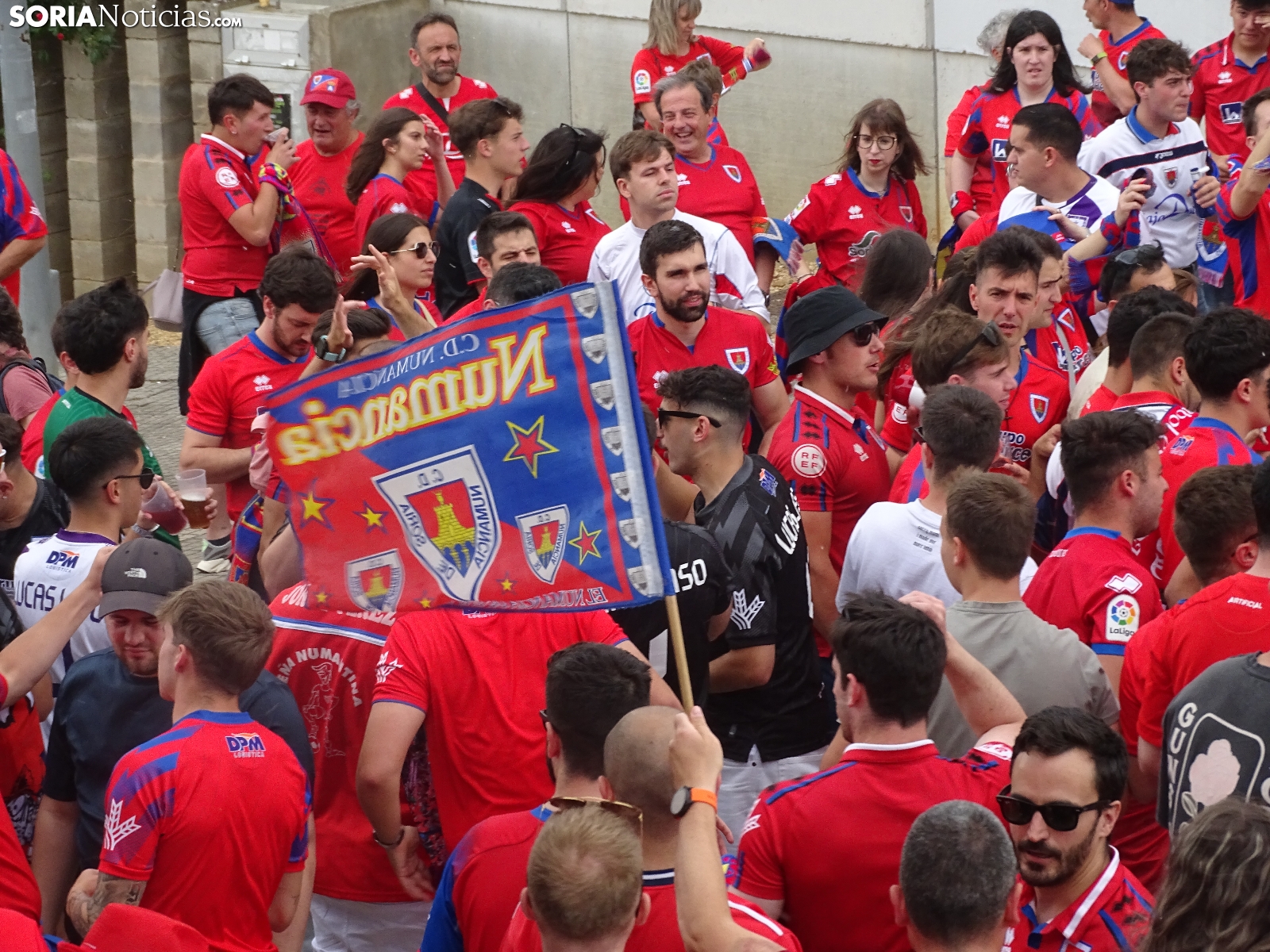 A escasos minutos de comenzar el partido entre el CD Numancia y el CD Teruel, las aficiones de ambos equipos se concentraban para dar ánimo a los suyos. Ambiente muy animado en las dos partes, convenientemente separadas, con el color rojo en común en sus indumentarias y buen hacer de los agentes de la Policía Nacional, apoyados por compañeros de la Municipal. Bengalas, himnos y arengas, con percusiones y megafonías incluidas, han hecho acto de presencia a la llegada de los jugadores. Los primeros desembarcaban en autobús. Por parte soriana acudían a pie o en sus propios vehículos. Todo indica que el encuentro, a las seis, en el que las dos escuadras se juegan el ascenso a 1.ª RFEF, hará vibrar las gradas y caldear ánimos con altas temperaturas en los corazones de locales y visitantes.