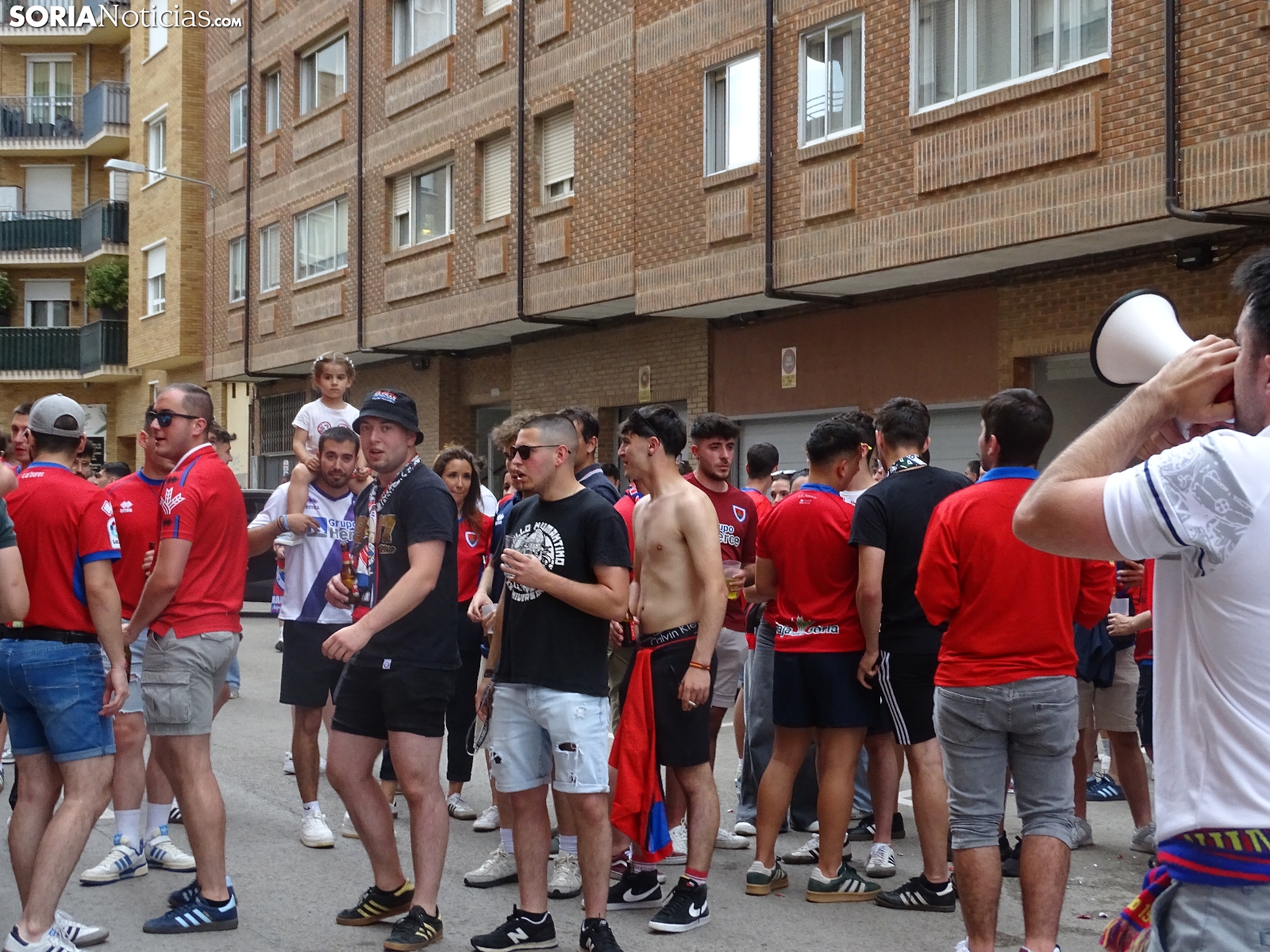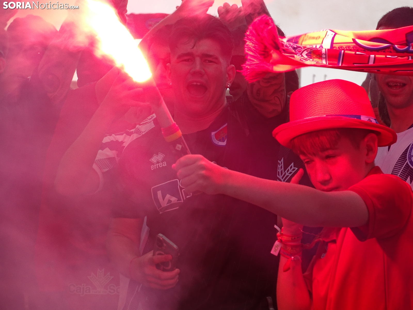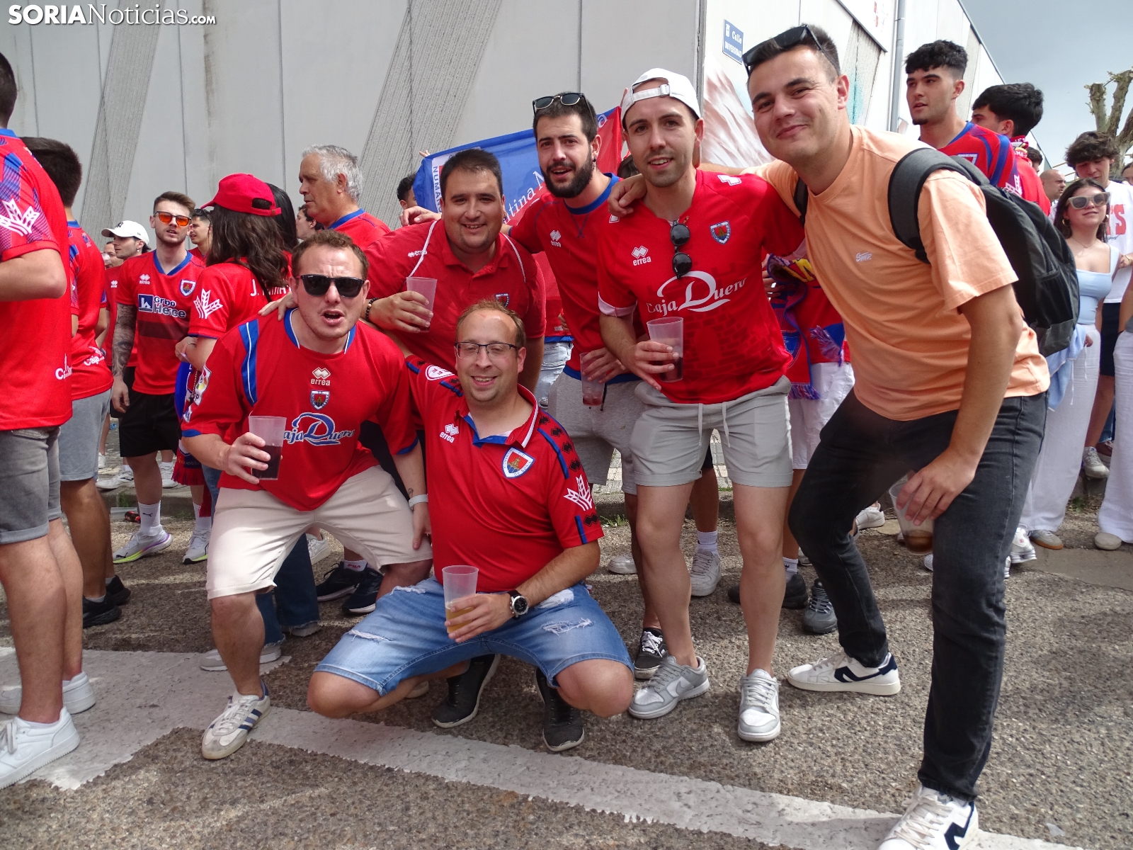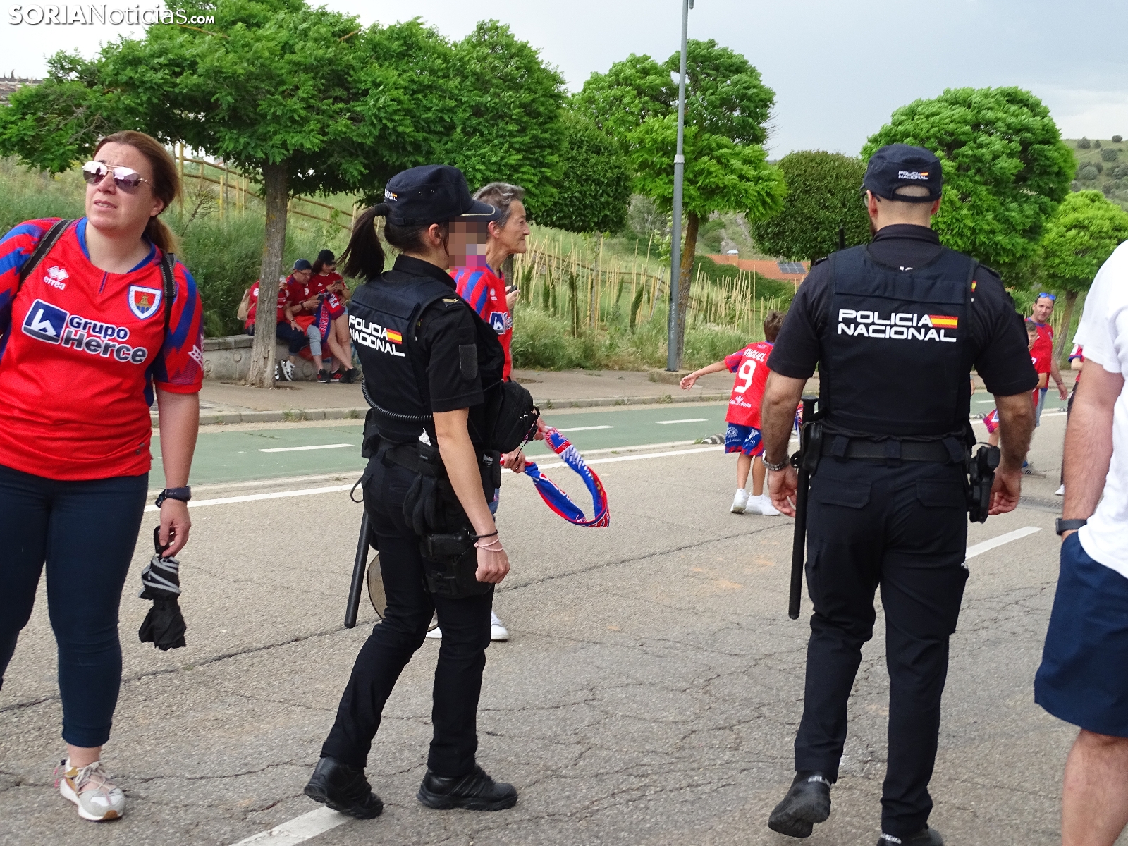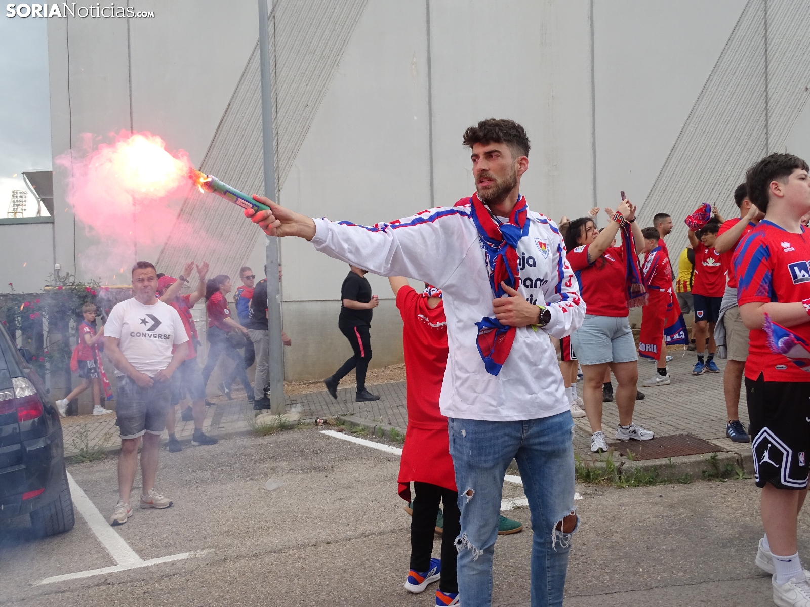 A escasos minutos de comenzar el partido entre el CD Numancia y el CD Teruel, las aficiones de ambos equipos se concentraban para dar ánimo a los suyos. Ambiente muy animado en las dos partes, convenientemente separadas, con el color rojo en común en sus indumentarias y buen hacer de los agentes de la Policía Nacional, apoyados por compañeros de la Municipal. Bengalas, himnos y arengas, con percusiones y megafonías incluidas, han hecho acto de presencia a la llegada de los jugadores. Los primeros desembarcaban en autobús. Por parte soriana acudían a pie o en sus propios vehículos. Todo indica que el encuentro, a las seis, en el que las dos escuadras se juegan el ascenso a 1.ª RFEF, hará vibrar las gradas y caldear ánimos con altas temperaturas en los corazones de locales y visitantes.