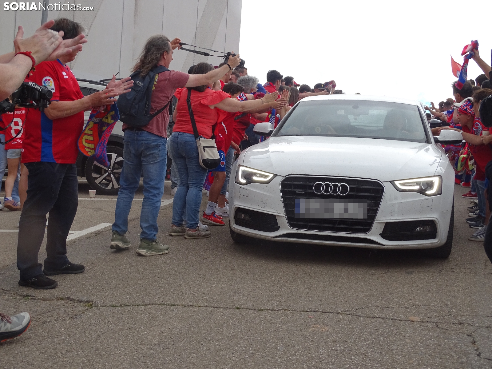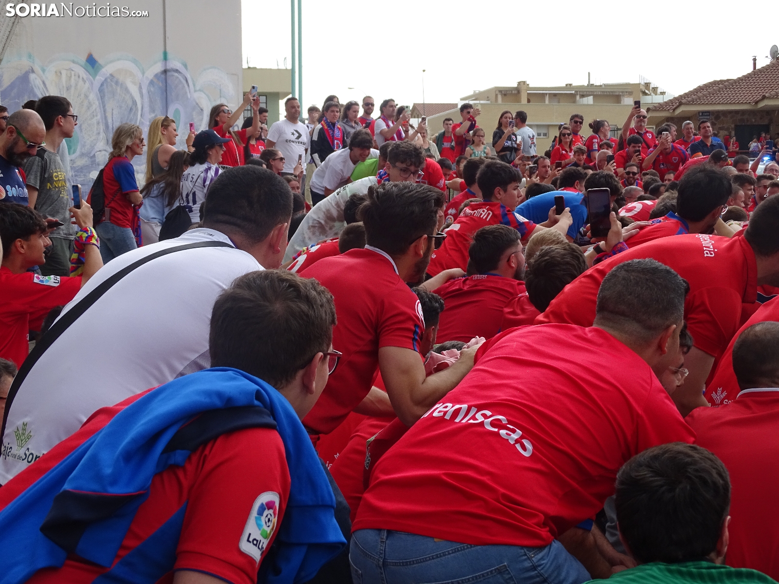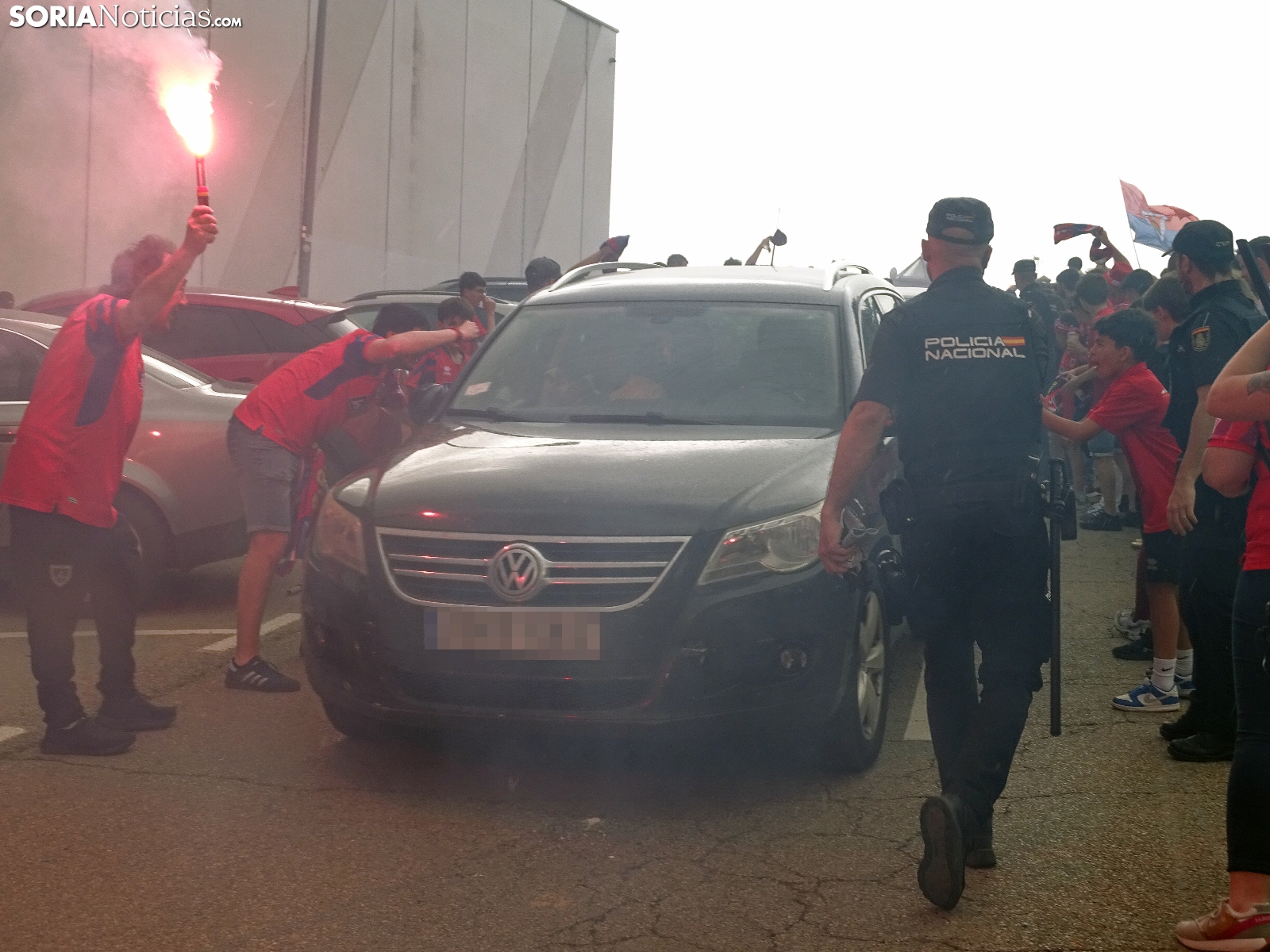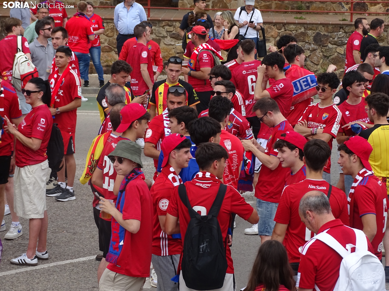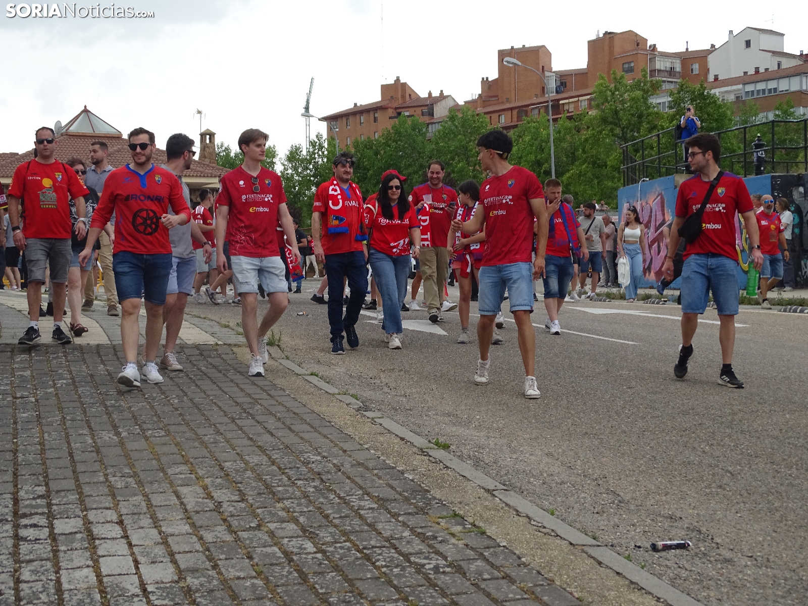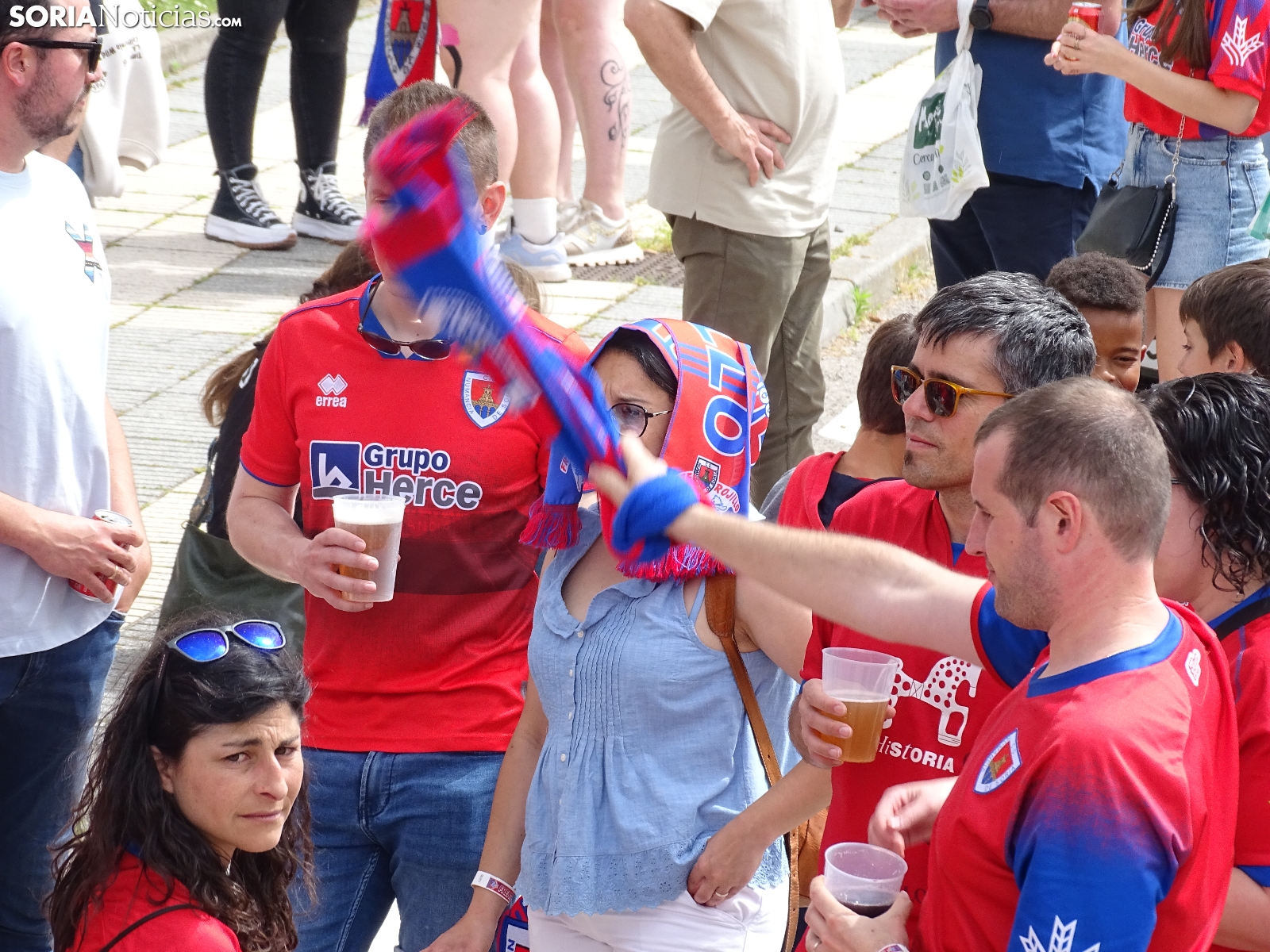 A escasos minutos de comenzar el partido entre el CD Numancia y el CD Teruel, las aficiones de ambos equipos se concentraban para dar ánimo a los suyos. Ambiente muy animado en las dos partes, convenientemente separadas, con el color rojo en común en sus indumentarias y buen hacer de los agentes de la Policía Nacional, apoyados por compañeros de la Municipal. Bengalas, himnos y arengas, con percusiones y megafonías incluidas, han hecho acto de presencia a la llegada de los jugadores. Los primeros desembarcaban en autobús. Por parte soriana acudían a pie o en sus propios vehículos. Todo indica que el encuentro, a las seis, en el que las dos escuadras se juegan el ascenso a 1.ª RFEF, hará vibrar las gradas y caldear ánimos con altas temperaturas en los corazones de locales y visitantes.
