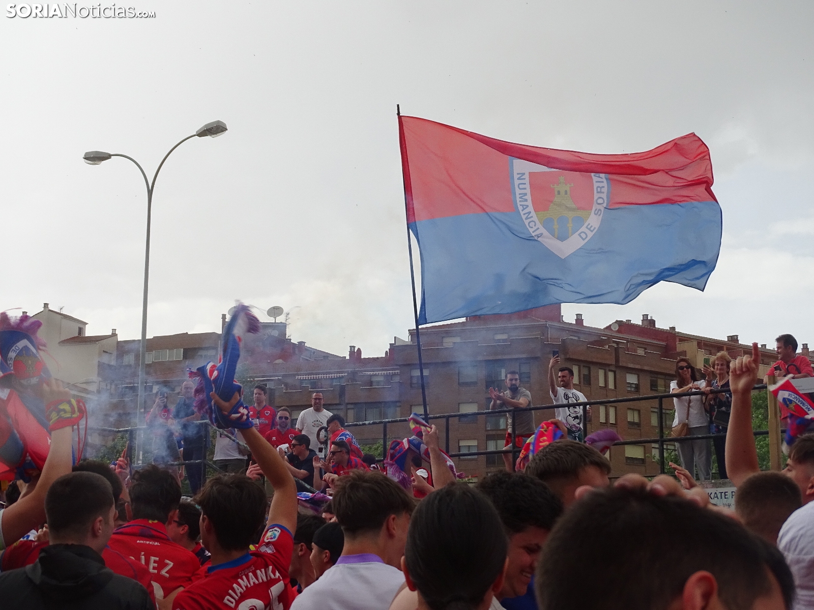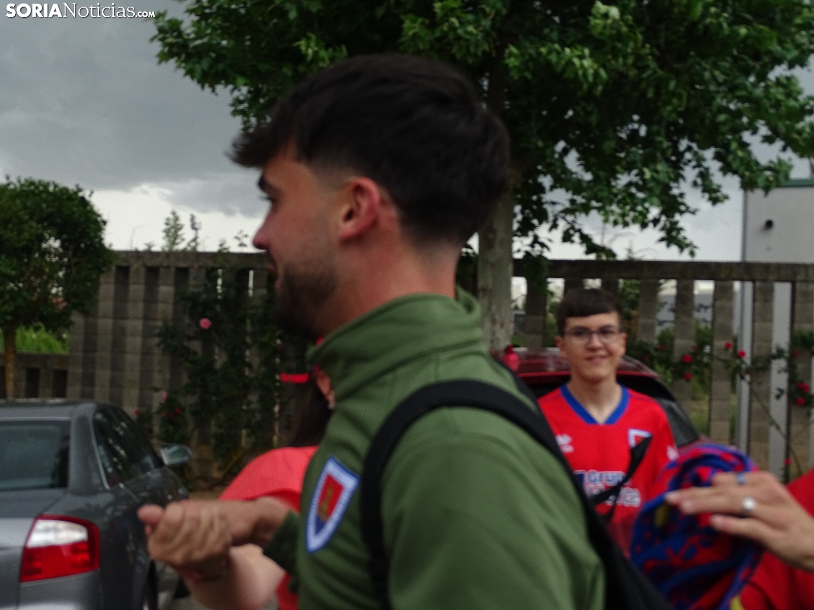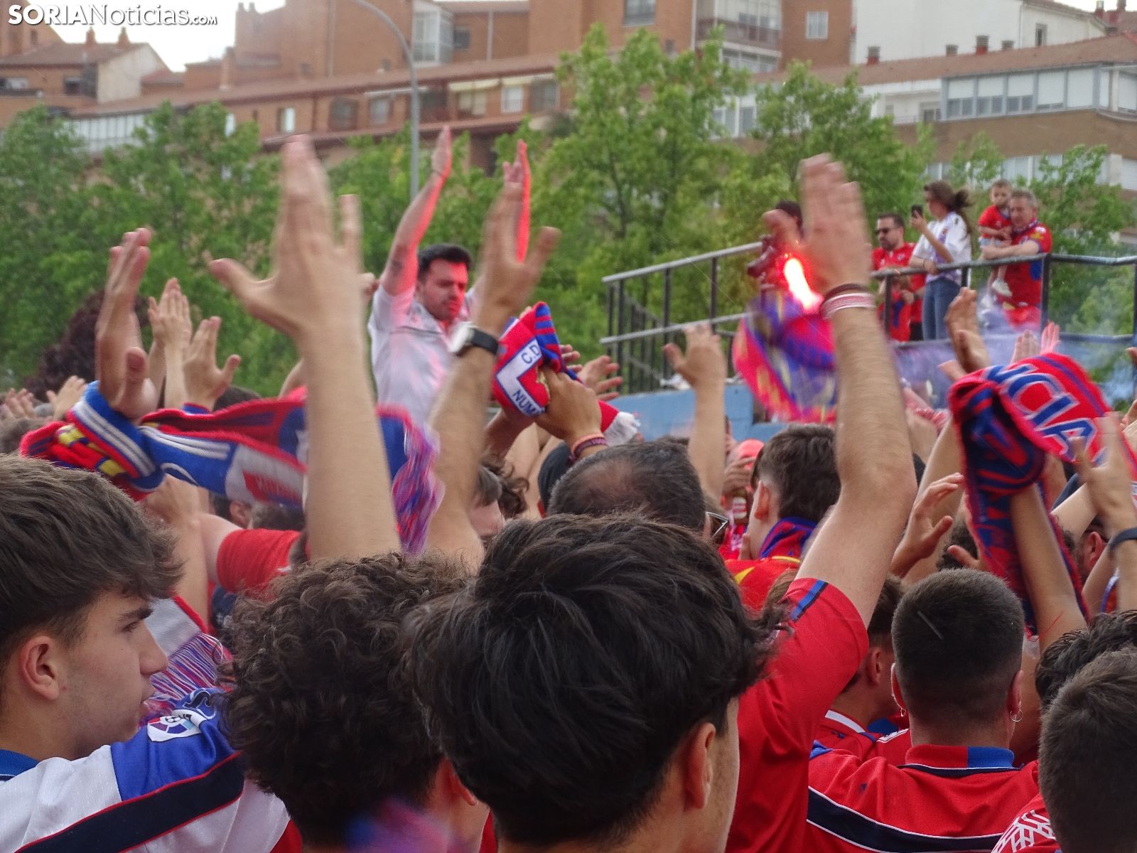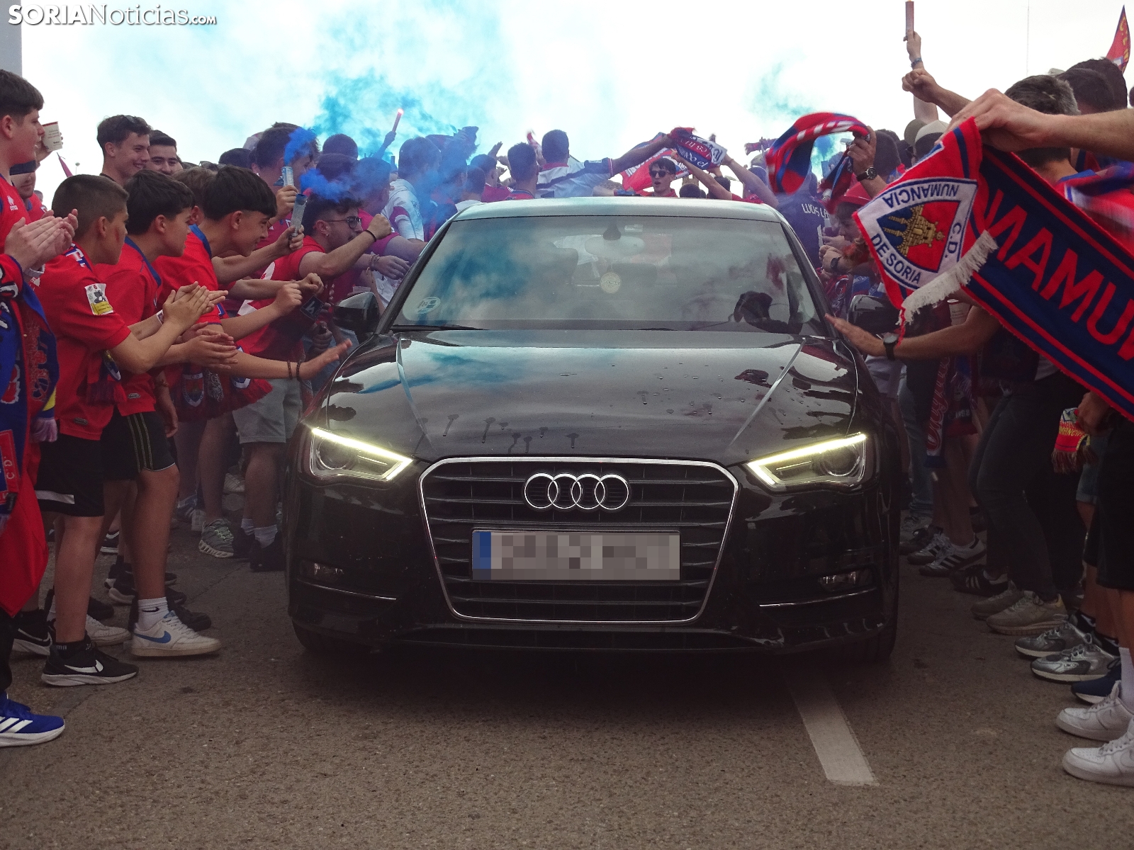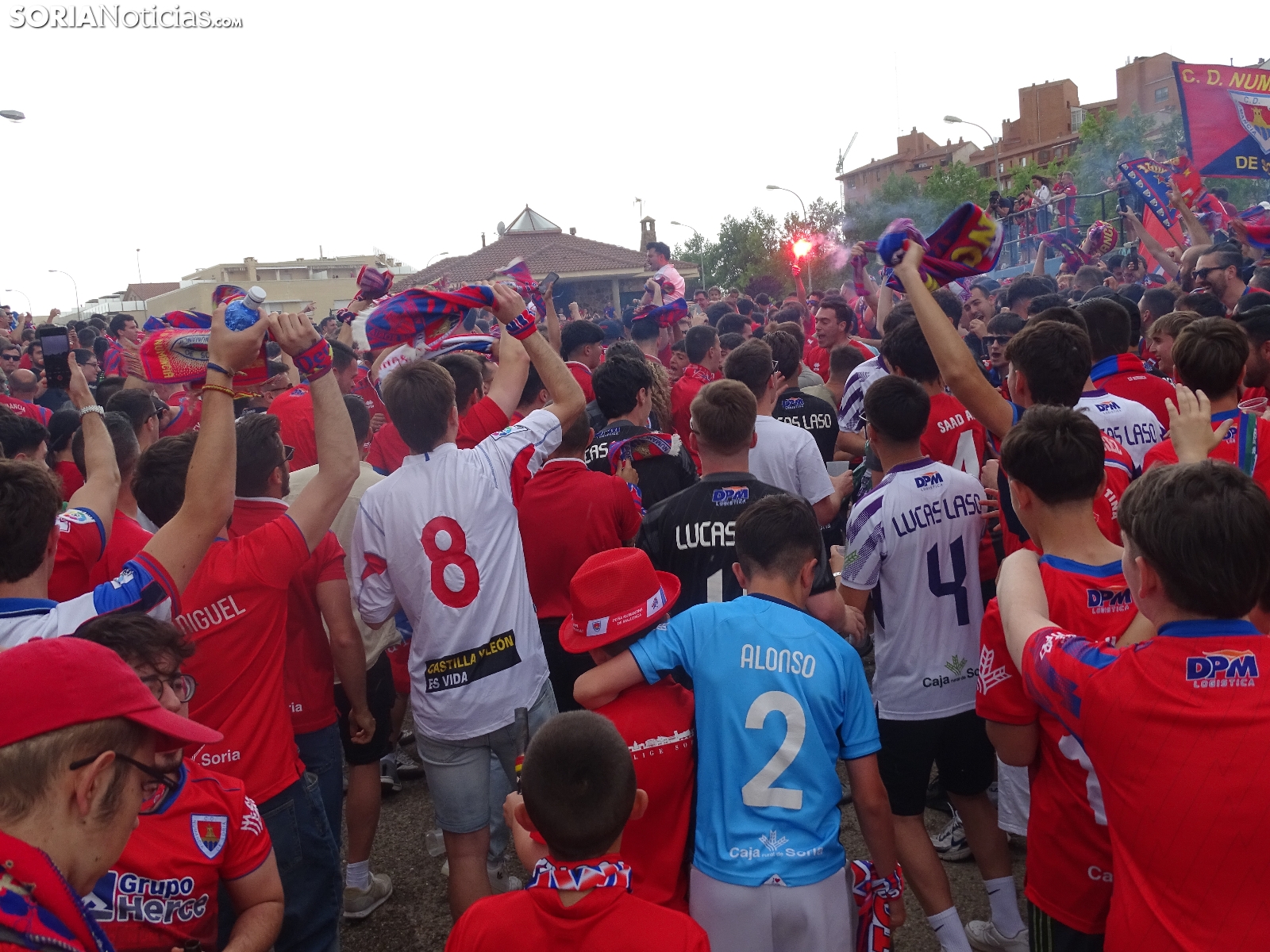 A escasos minutos de comenzar el partido entre el CD Numancia y el CD Teruel, las aficiones de ambos equipos se concentraban para dar ánimo a los suyos. Ambiente muy animado en las dos partes, convenientemente separadas, con el color rojo en común en sus indumentarias y buen hacer de los agentes de la Policía Nacional, apoyados por compañeros de la Municipal. Bengalas, himnos y arengas, con percusiones y megafonías incluidas, han hecho acto de presencia a la llegada de los jugadores. Los primeros desembarcaban en autobús. Por parte soriana acudían a pie o en sus propios vehículos. Todo indica que el encuentro, a las seis, en el que las dos escuadras se juegan el ascenso a 1.ª RFEF, hará vibrar las gradas y caldear ánimos con altas temperaturas en los corazones de locales y visitantes.