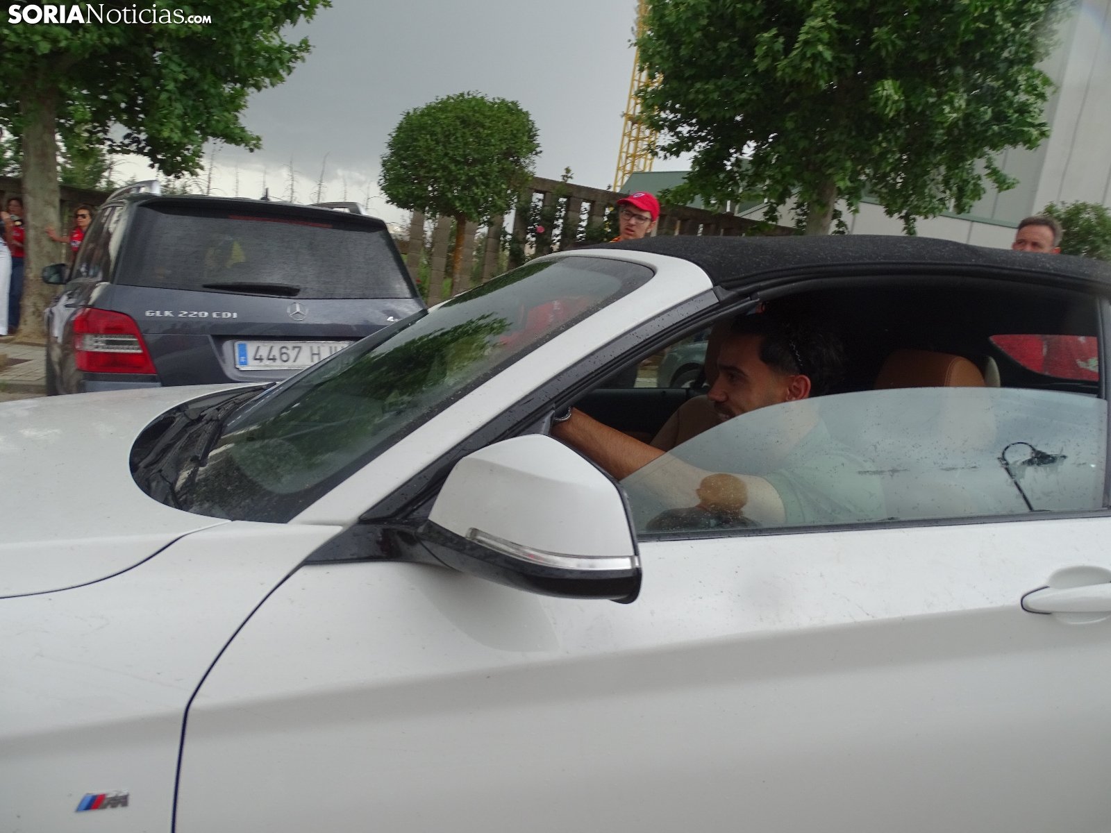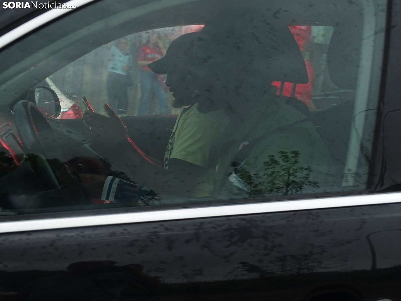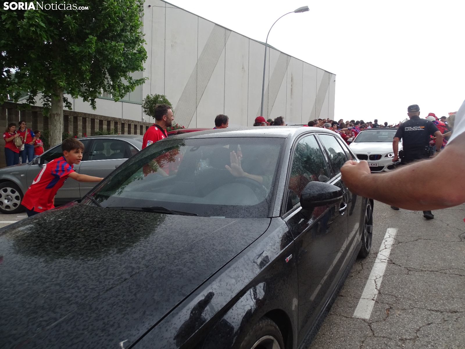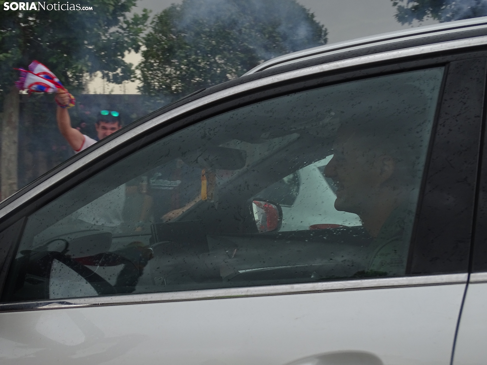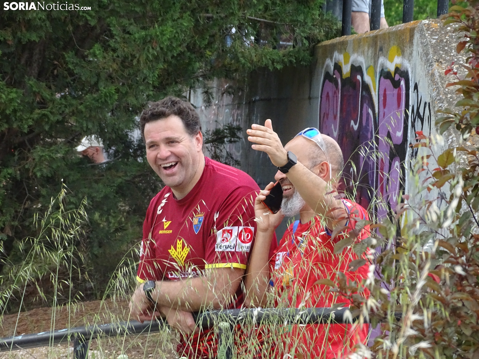A escasos minutos de comenzar el partido entre el CD Numancia y el CD Teruel, las aficiones de ambos equipos se concentraban para dar ánimo a los suyos. Ambiente muy animado en las dos partes, convenientemente separadas, con el color rojo en común en sus indumentarias y buen hacer de los agentes de la Policía Nacional, apoyados por compañeros de la Municipal. Bengalas, himnos y arengas, con percusiones y megafonías incluidas, han hecho acto de presencia a la llegada de los jugadores. Los primeros desembarcaban en autobús. Por parte soriana acudían a pie o en sus propios vehículos. Todo indica que el encuentro, a las seis, en el que las dos escuadras se juegan el ascenso a 1.ª RFEF, hará vibrar las gradas y caldear ánimos con altas temperaturas en los corazones de locales y visitantes.
