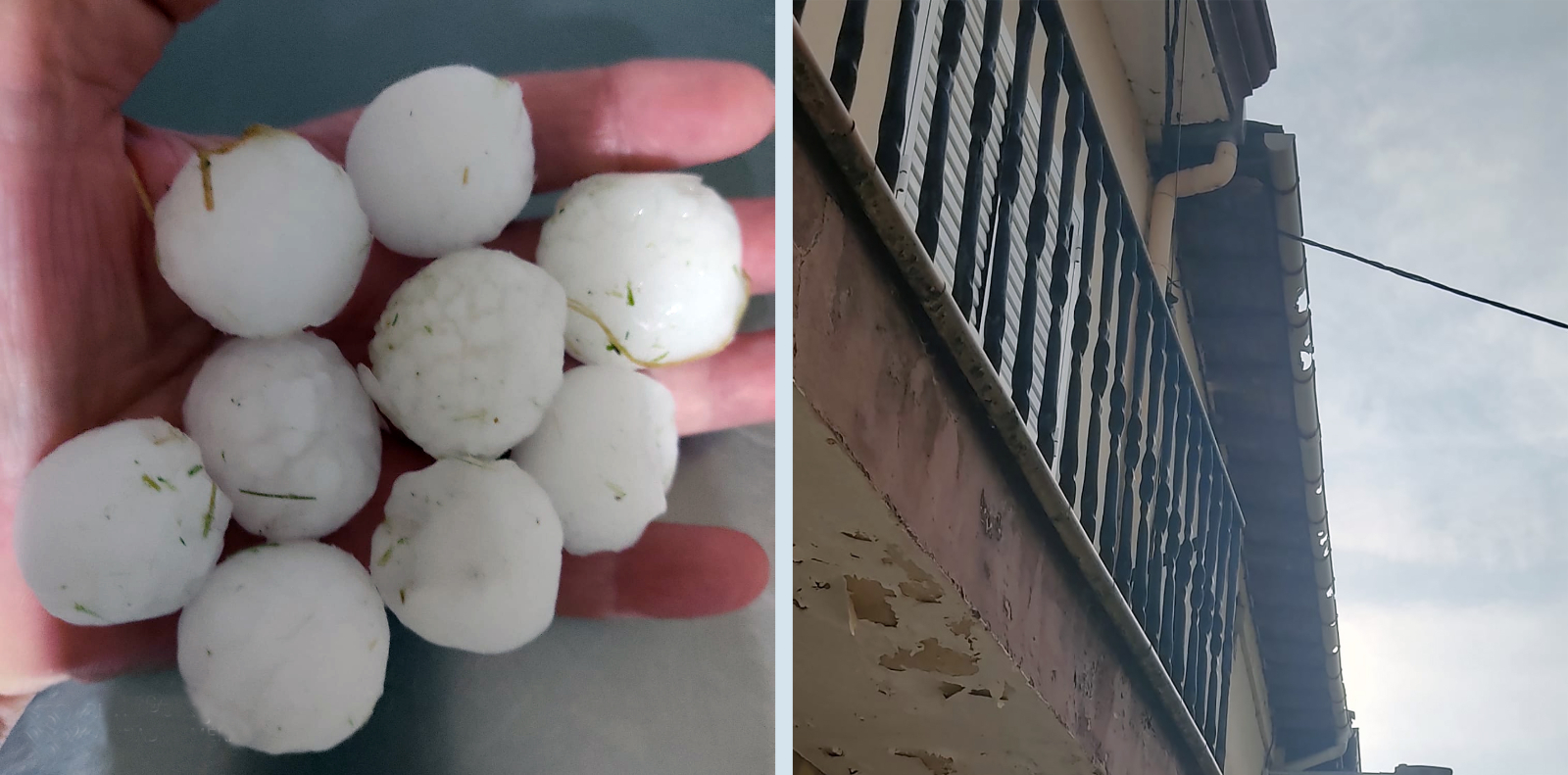 Una vecina anónima del pueblo ha relatado hoy que todo comenzó en torno a las tres de la tarde, con una fuerte lluvia y, paulatinamente, a estos chubascos les sucedió el granizo, que iba aumentando de tamaño conforme avanzaba el tiempo hasta llegar a dimensiones como las que aparecen en la imagen. El episodio se extendió durante media hora, intensificándose en los últimos quince minutos.