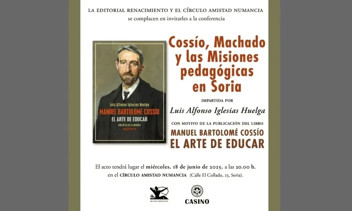 Este miércoles, día 18, el salón Gerardo Diego del Círculo Amistad Numancia acoge la conferencia 'Cossío, Machado y las misiones pedagógicas en Soria'. Será impartida por Luis Alfonso Iglesias Huelga, con motivo de la publicación del libro de Manuel Bartolomé Cossío 'El arte de educar'.