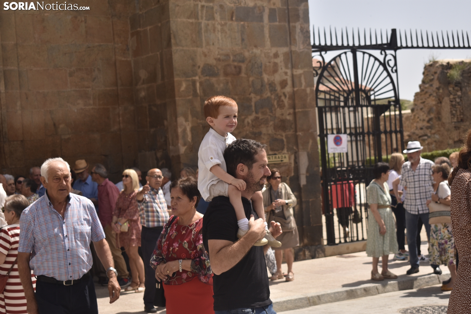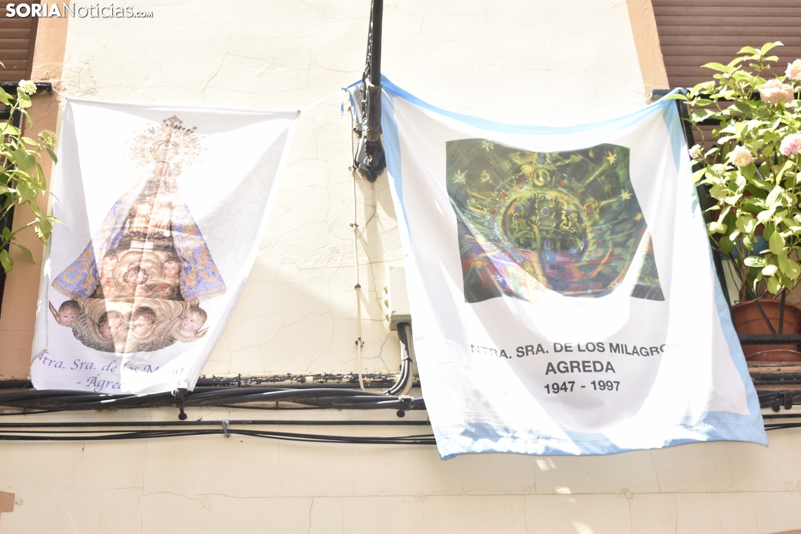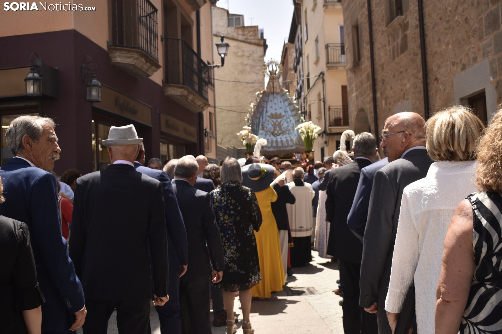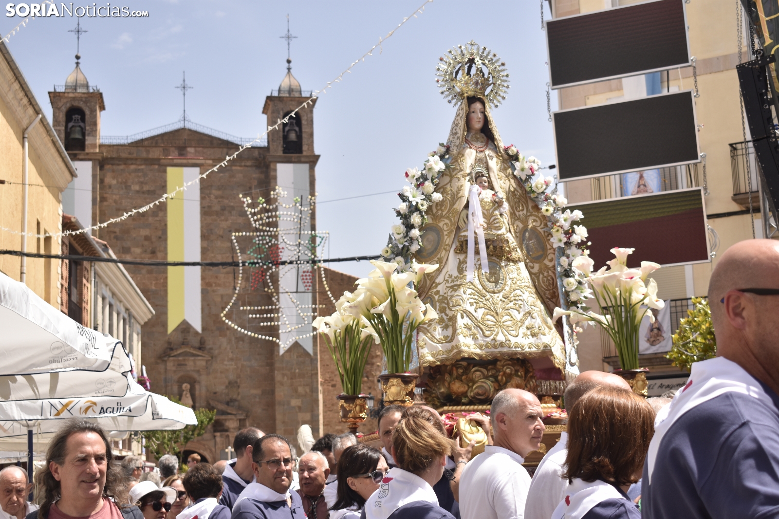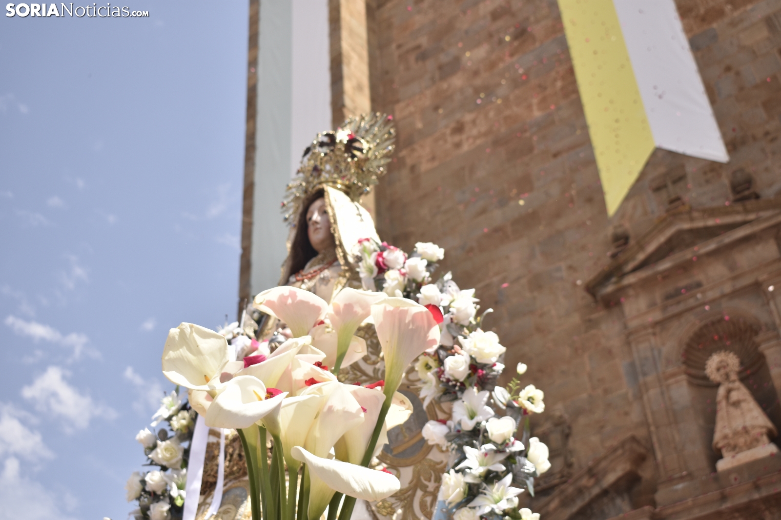 Millares de peregrinos han vuelto a visitar Ágreda en el día grande de sus fiestas patronales, en honor a Nuestra Señora de los Milagros. Si a las siete de la mañana de este sábado la Misa de Peregrinos llenaba el templo santuario de la Patrona, un número mayor de fieles acudían a la eucaristía solemne de las once -oficiada por José Luis Redrado Marchite, obispo titular de Ofena- colmando la iglesia. Concluido el acto litúrgico, daba comienzo la procesión con la imagen de la Virgen de los Remedios, ya que la titular solamente sale de su morada cada 25 años, como así lo hizo en 2023, y salvo casos excepcionales. Los fieles desfilaban bajo las andas que, como es tradición, son cargadas sobre los hombros de miembros de la cofradía de Los Milagros, mientras que los quintos que este año han ido acordonando todo el largo recorrido para ser ellos quienes introducían finalmente la imagen de la procesionada en el templo parroquial.