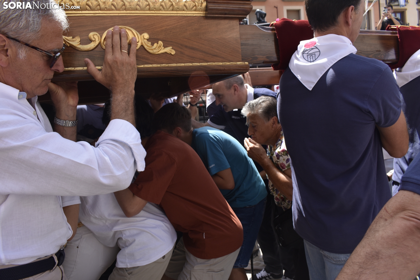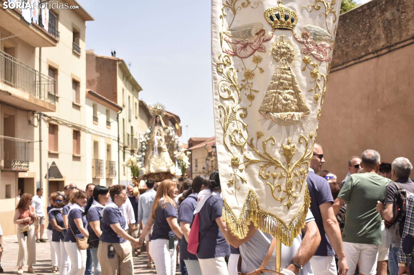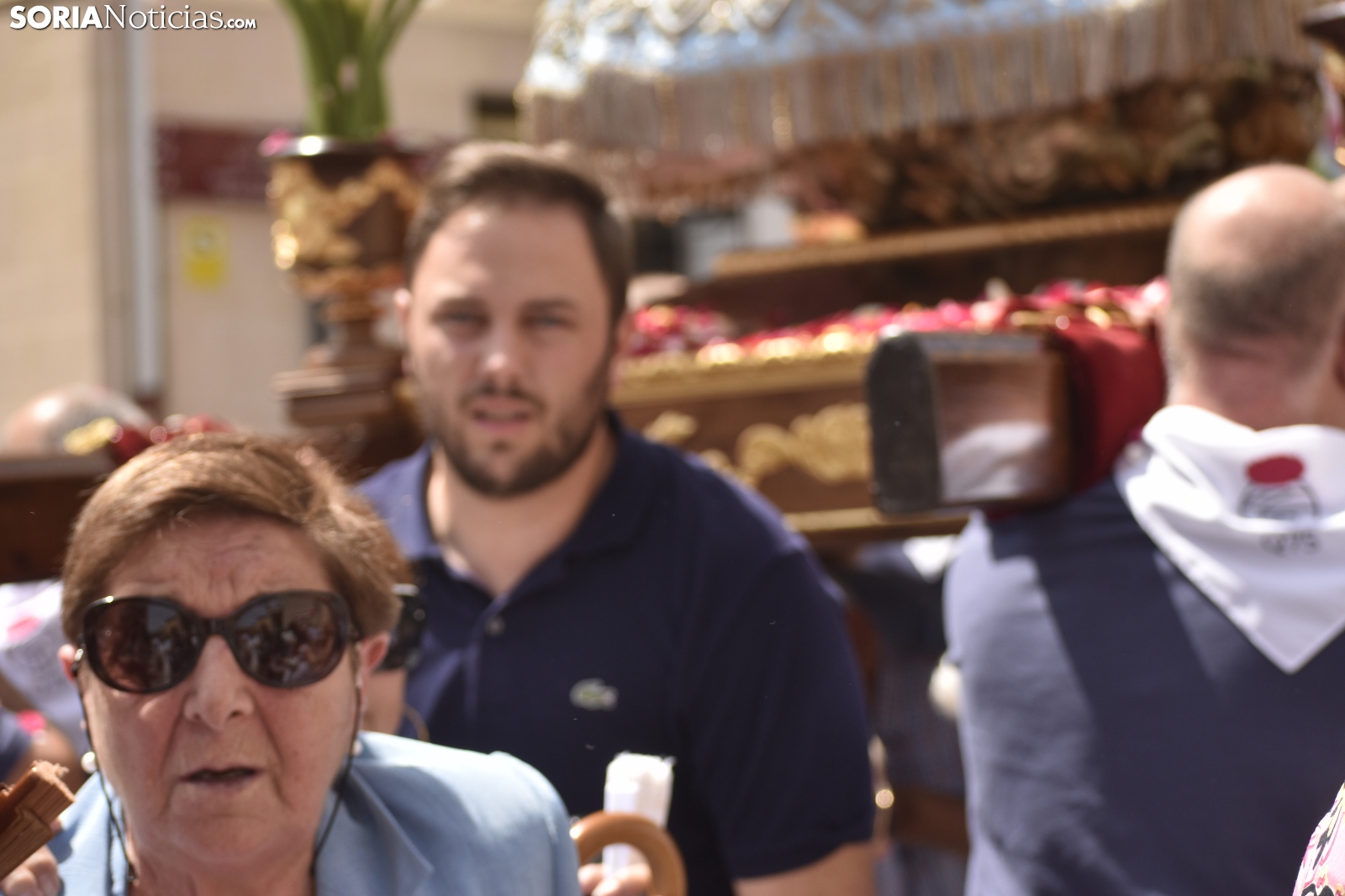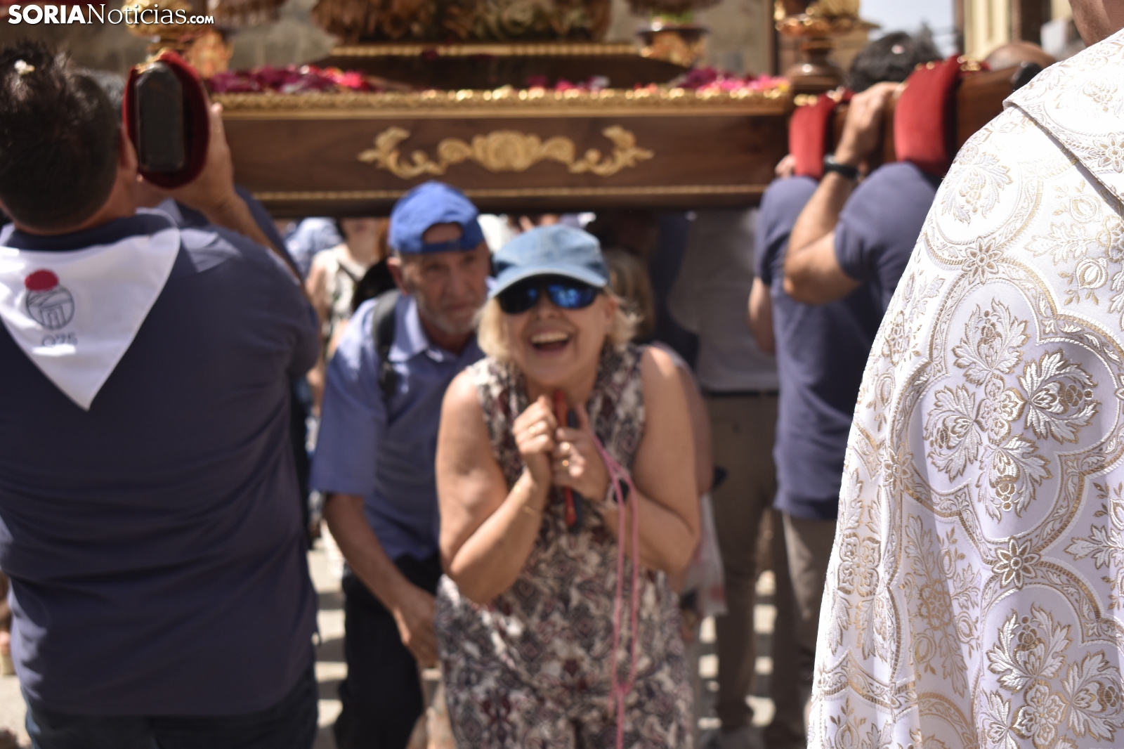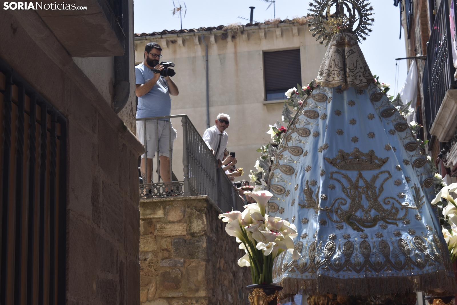 Millares de peregrinos han vuelto a visitar Ágreda en el día grande de sus fiestas patronales, en honor a Nuestra Señora de los Milagros. Si a las siete de la mañana de este sábado la Misa de Peregrinos llenaba el templo santuario de la Patrona, un número mayor de fieles acudían a la eucaristía solemne de las once -oficiada por José Luis Redrado Marchite, obispo titular de Ofena- colmando la iglesia. Concluido el acto litúrgico, daba comienzo la procesión con la imagen de la Virgen de los Remedios, ya que la titular solamente sale de su morada cada 25 años, como así lo hizo en 2023, y salvo casos excepcionales. Los fieles desfilaban bajo las andas que, como es tradición, son cargadas sobre los hombros de miembros de la cofradía de Los Milagros, mientras que los quintos que este año han ido acordonando todo el largo recorrido para ser ellos quienes introducían finalmente la imagen de la procesionada en el templo parroquial.
