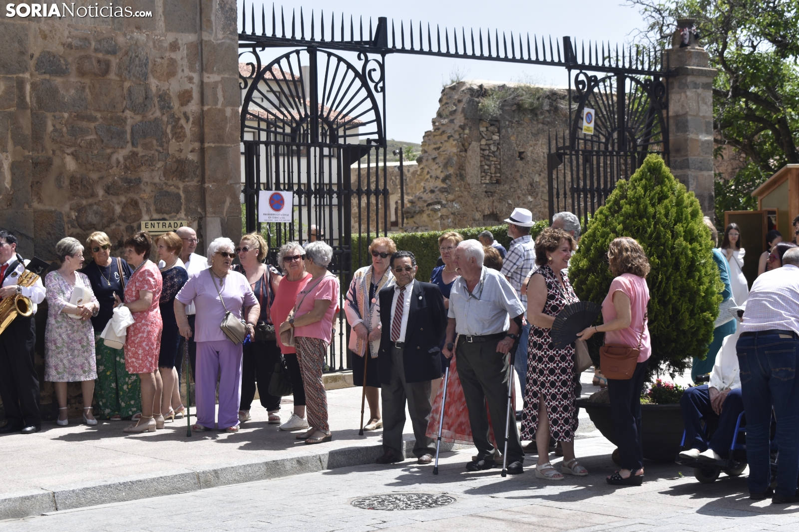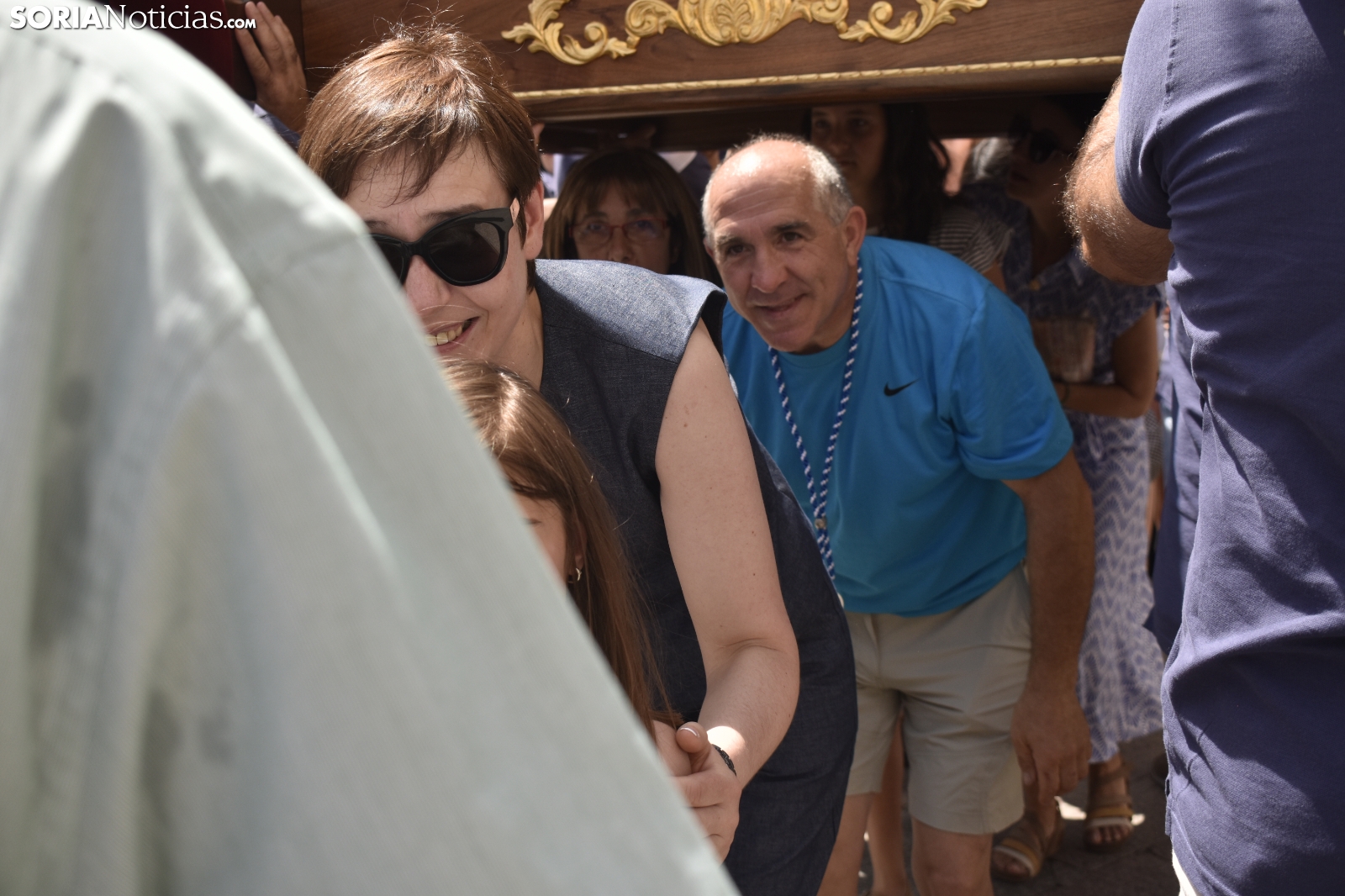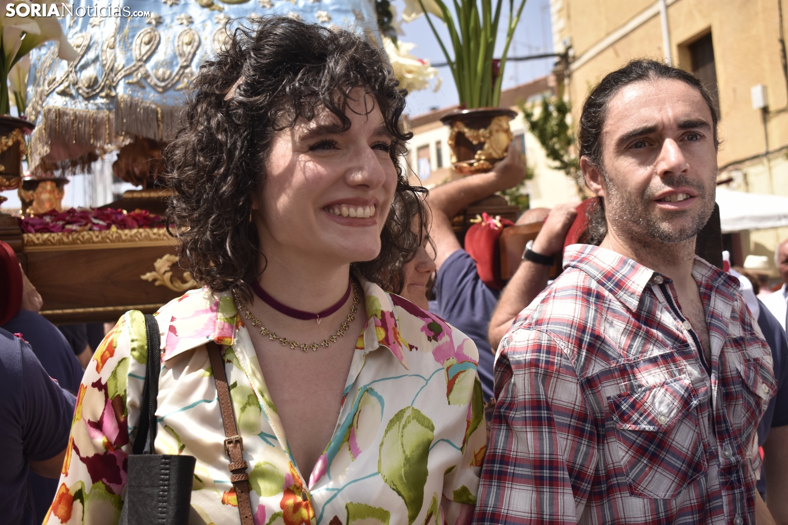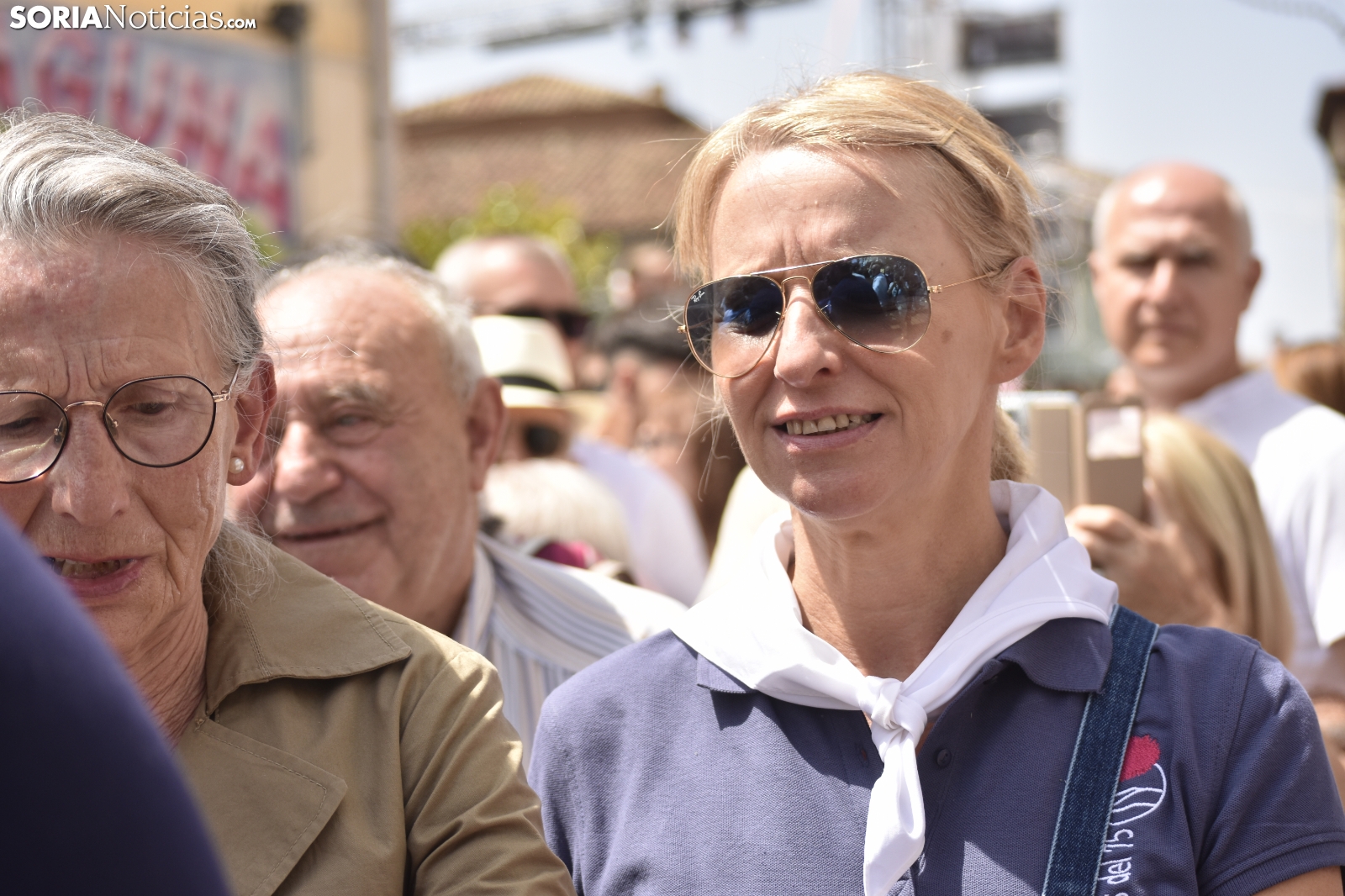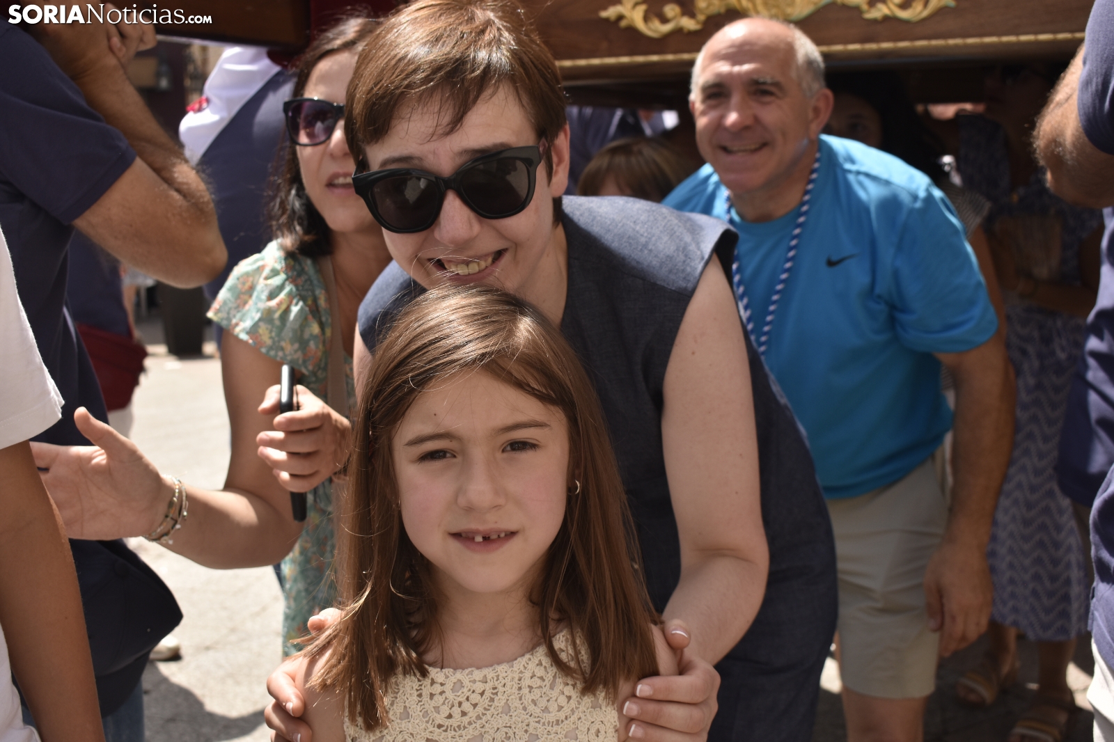 Millares de peregrinos han vuelto a visitar Ágreda en el día grande de sus fiestas patronales, en honor a Nuestra Señora de los Milagros. Si a las siete de la mañana de este sábado la Misa de Peregrinos llenaba el templo santuario de la Patrona, un número mayor de fieles acudían a la eucaristía solemne de las once -oficiada por José Luis Redrado Marchite, obispo titular de Ofena- colmando la iglesia. Concluido el acto litúrgico, daba comienzo la procesión con la imagen de la Virgen de los Remedios, ya que la titular solamente sale de su morada cada 25 años, como así lo hizo en 2023, y salvo casos excepcionales. Los fieles desfilaban bajo las andas que, como es tradición, son cargadas sobre los hombros de miembros de la cofradía de Los Milagros, mientras que los quintos que este año han ido acordonando todo el largo recorrido para ser ellos quienes introducían finalmente la imagen de la procesionada en el templo parroquial.
