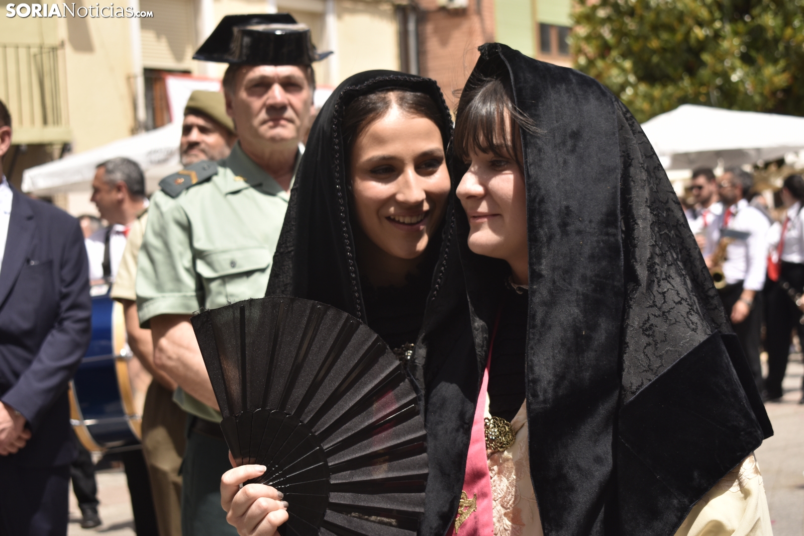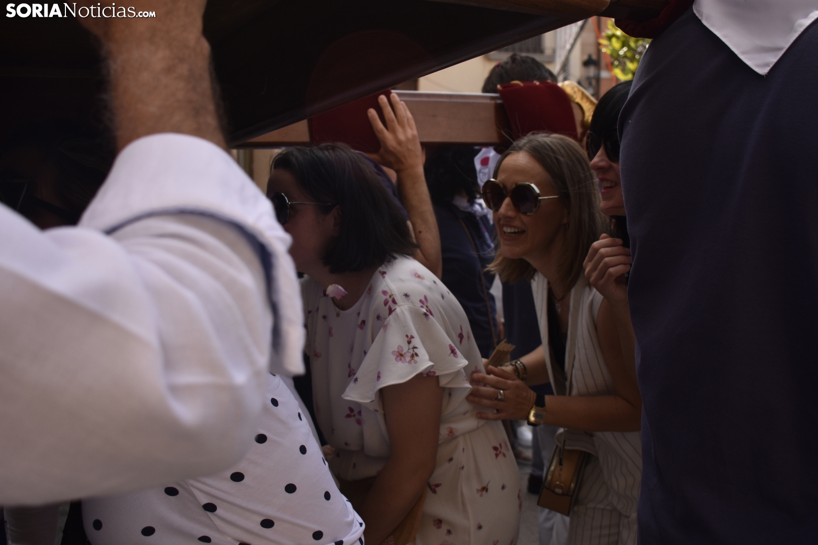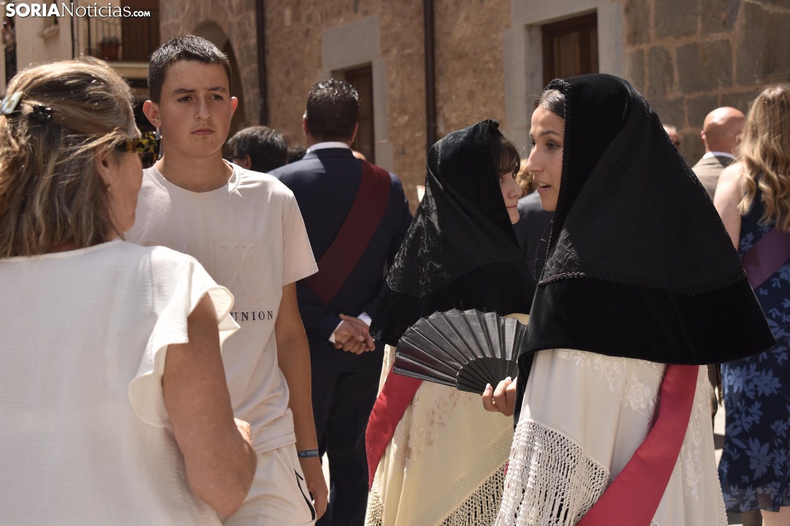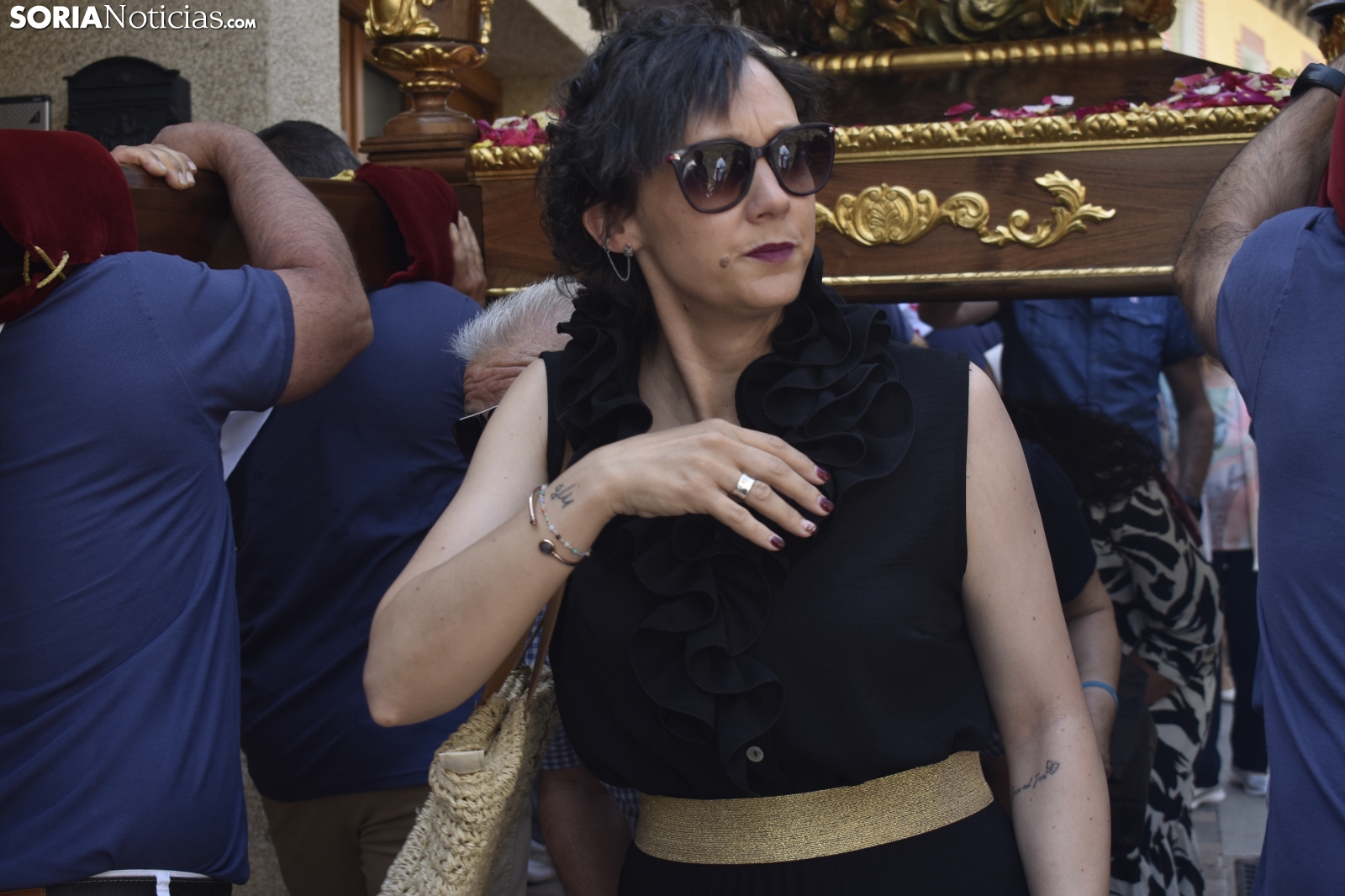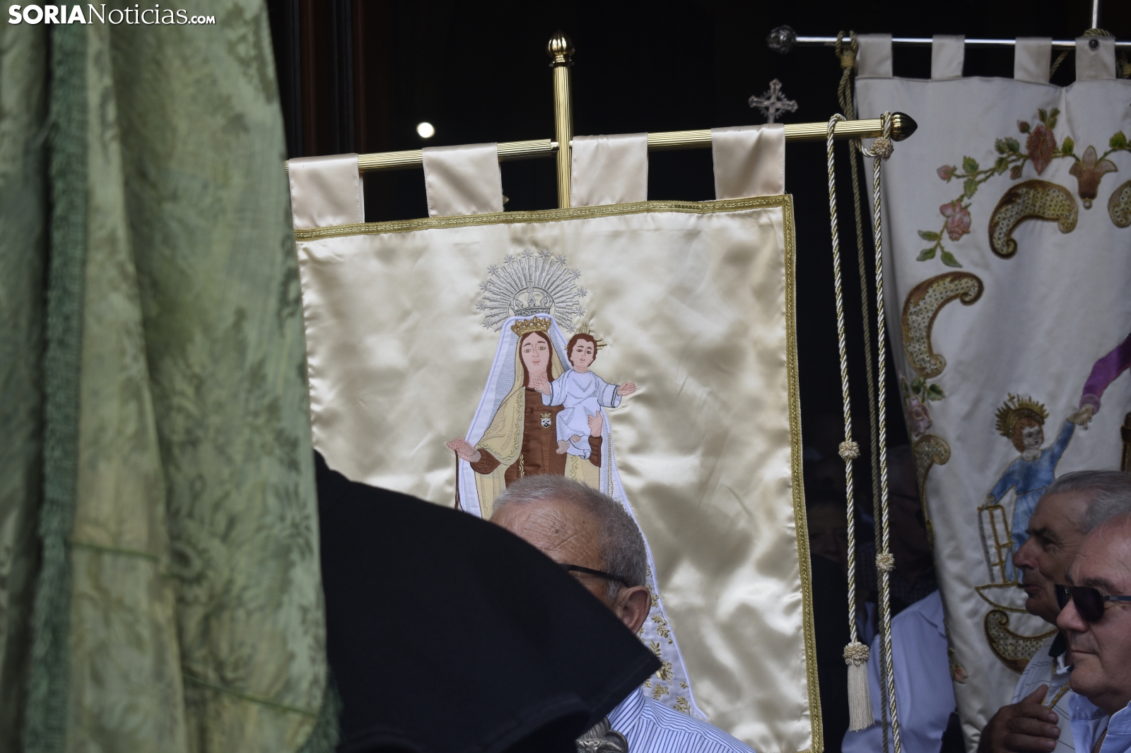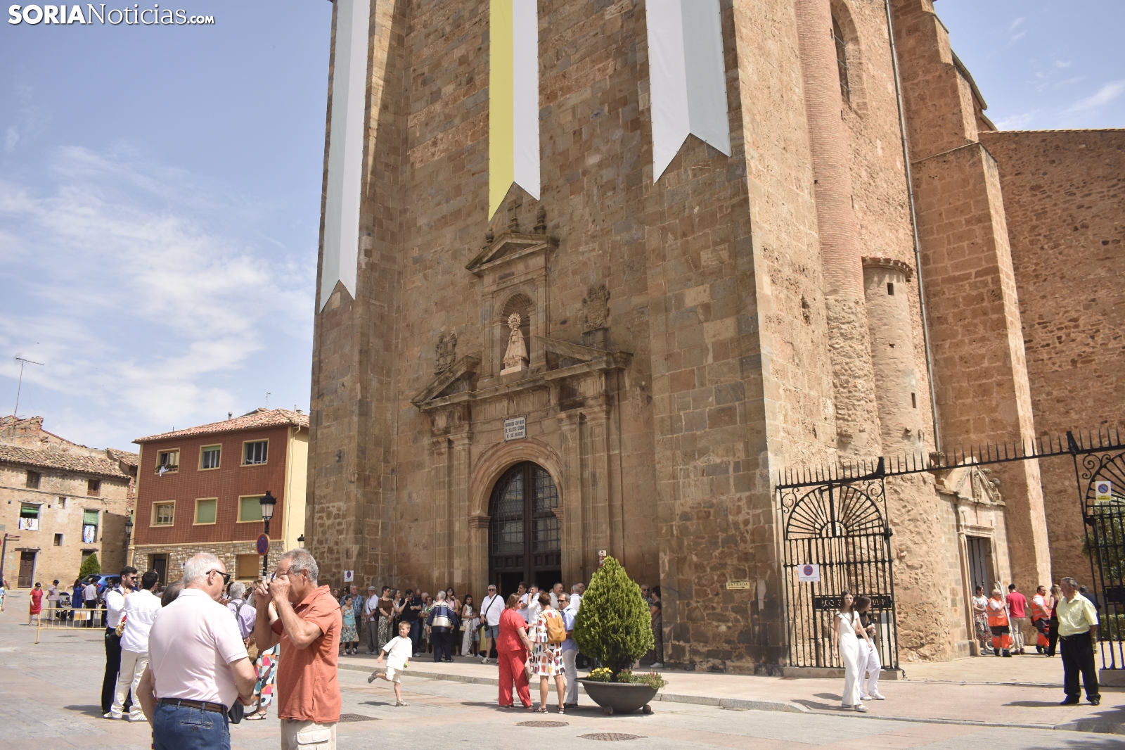 Millares de peregrinos han vuelto a visitar Ágreda en el día grande de sus fiestas patronales, en honor a Nuestra Señora de los Milagros. Si a las siete de la mañana de este sábado la Misa de Peregrinos llenaba el templo santuario de la Patrona, un número mayor de fieles acudían a la eucaristía solemne de las once -oficiada por José Luis Redrado Marchite, obispo titular de Ofena- colmando la iglesia. Concluido el acto litúrgico, daba comienzo la procesión con la imagen de la Virgen de los Remedios, ya que la titular solamente sale de su morada cada 25 años, como así lo hizo en 2023, y salvo casos excepcionales. Los fieles desfilaban bajo las andas que, como es tradición, son cargadas sobre los hombros de miembros de la cofradía de Los Milagros, mientras que los quintos que este año han ido acordonando todo el largo recorrido para ser ellos quienes introducían finalmente la imagen de la procesionada en el templo parroquial.